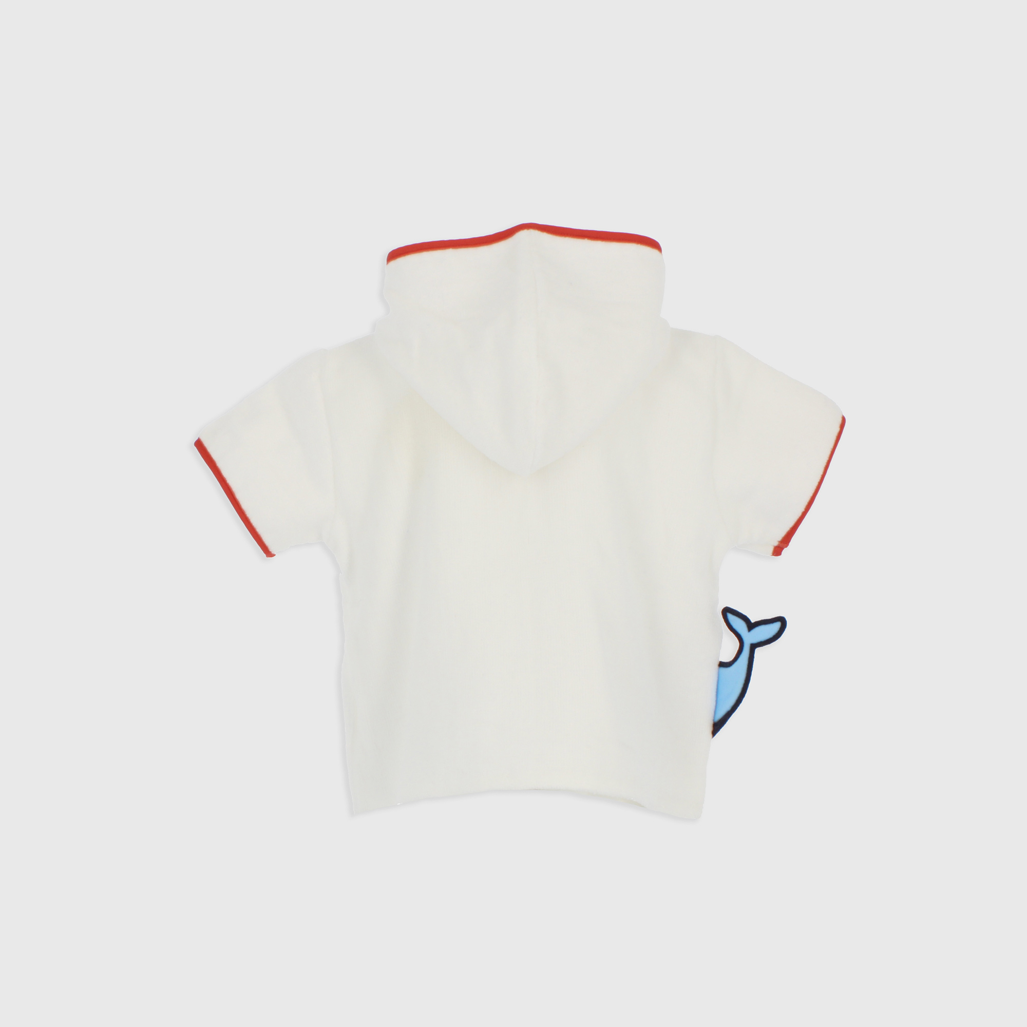 Albornoz con capucha de felpa, pez estampado. Cierre con cremallera en la parte delantera. Perfiles en contraste.