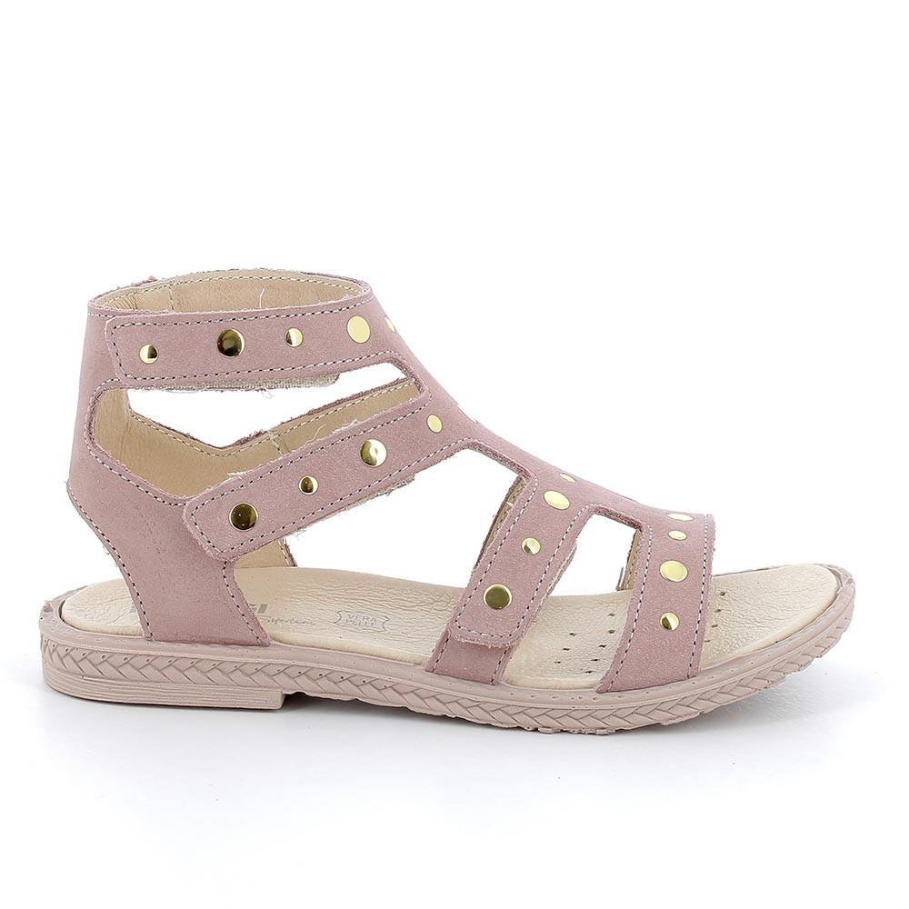 Estas sandalias de niña tipo romana, serán las favoridas por las niñas más a la moda, de hecho este modelo siempre es entre los favoridos en verano. Las bandas, ajustables con velcros, están totalmente decoradas con preciosas tachas de metal. La suela con pequeño tacón, es fina y adornada con un motivo trenzado.
