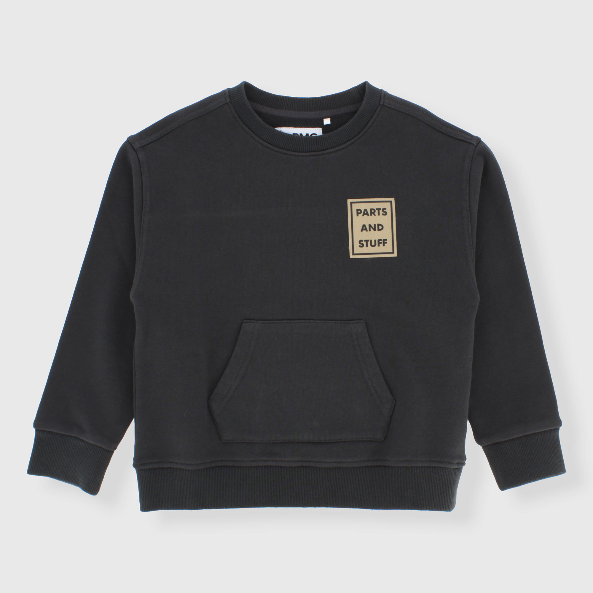 Sudadera con cuello redondo, mangas largas. Patch en la parte delantera y bolsillo canguro. Cuello, puños y parte inferior pana.