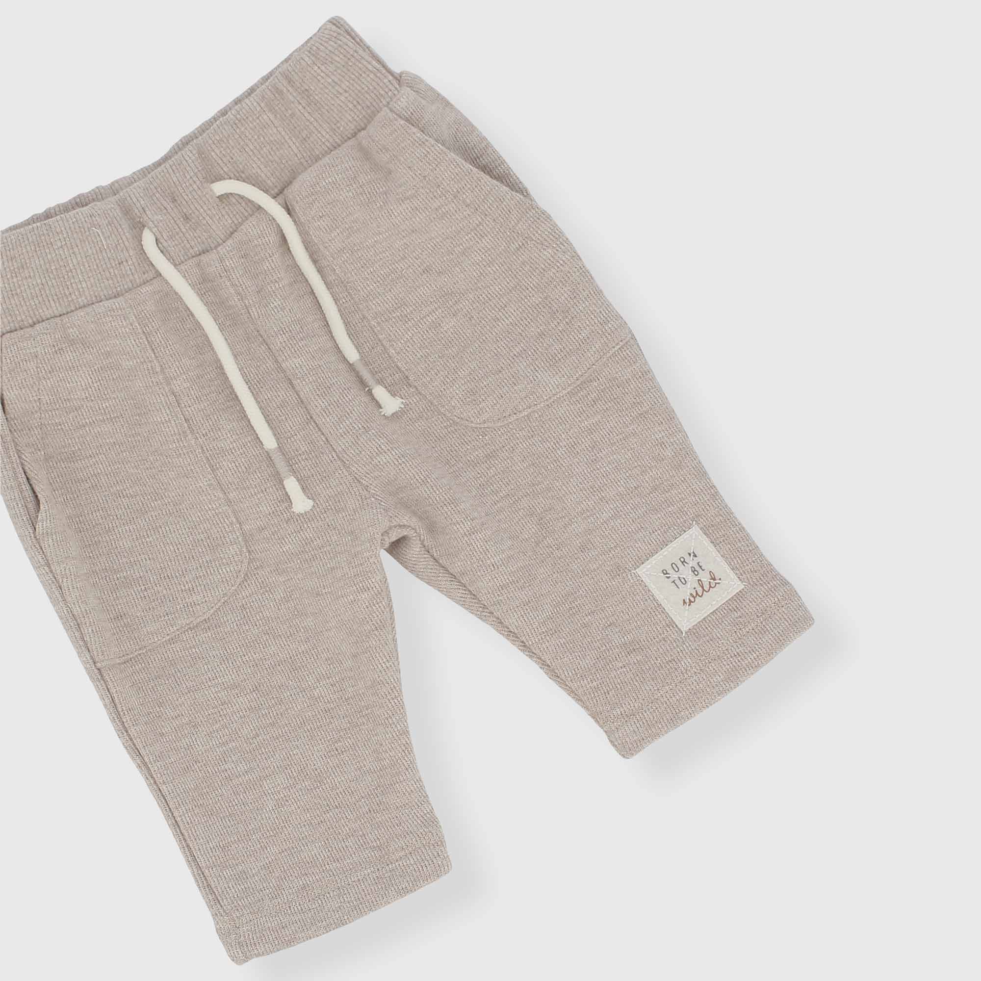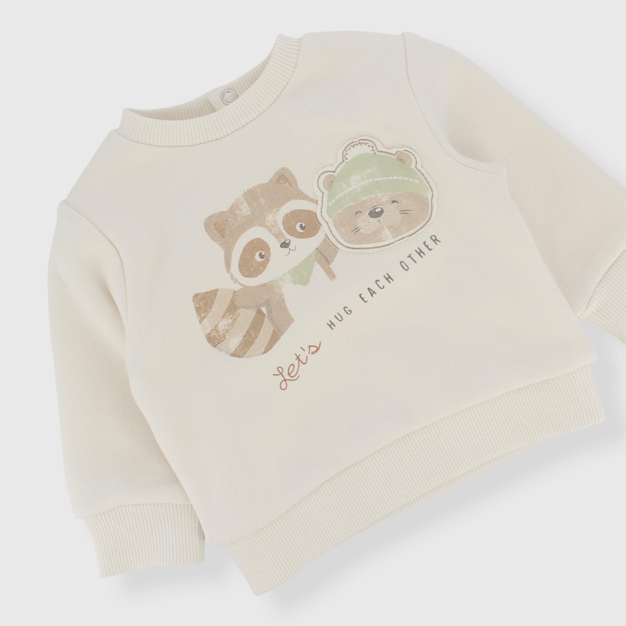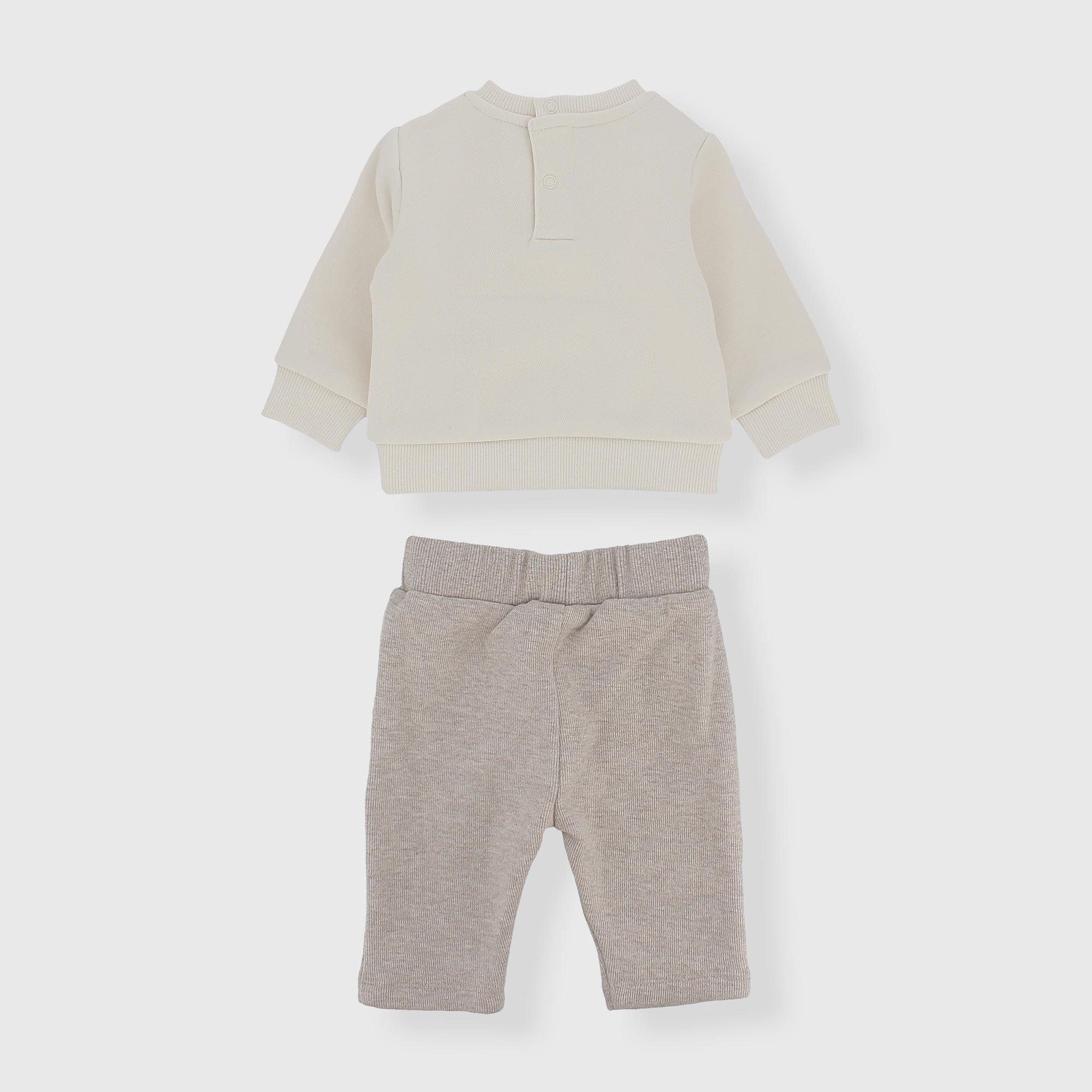 Conjunto formado por dos piezas. Camiseta de interlock, cuello redondo, mangas largas. Cierre con botones automáticos en la parte trasera. Parte delantera estampada y con aplicaciones. Cuello, puños y parte inferior pana. Pantalones de tejido tipo jersey texturizado con cintura elástica y cordones delanteros. Bolsillos delanteros y pequeño patch aplicado en la pierna.