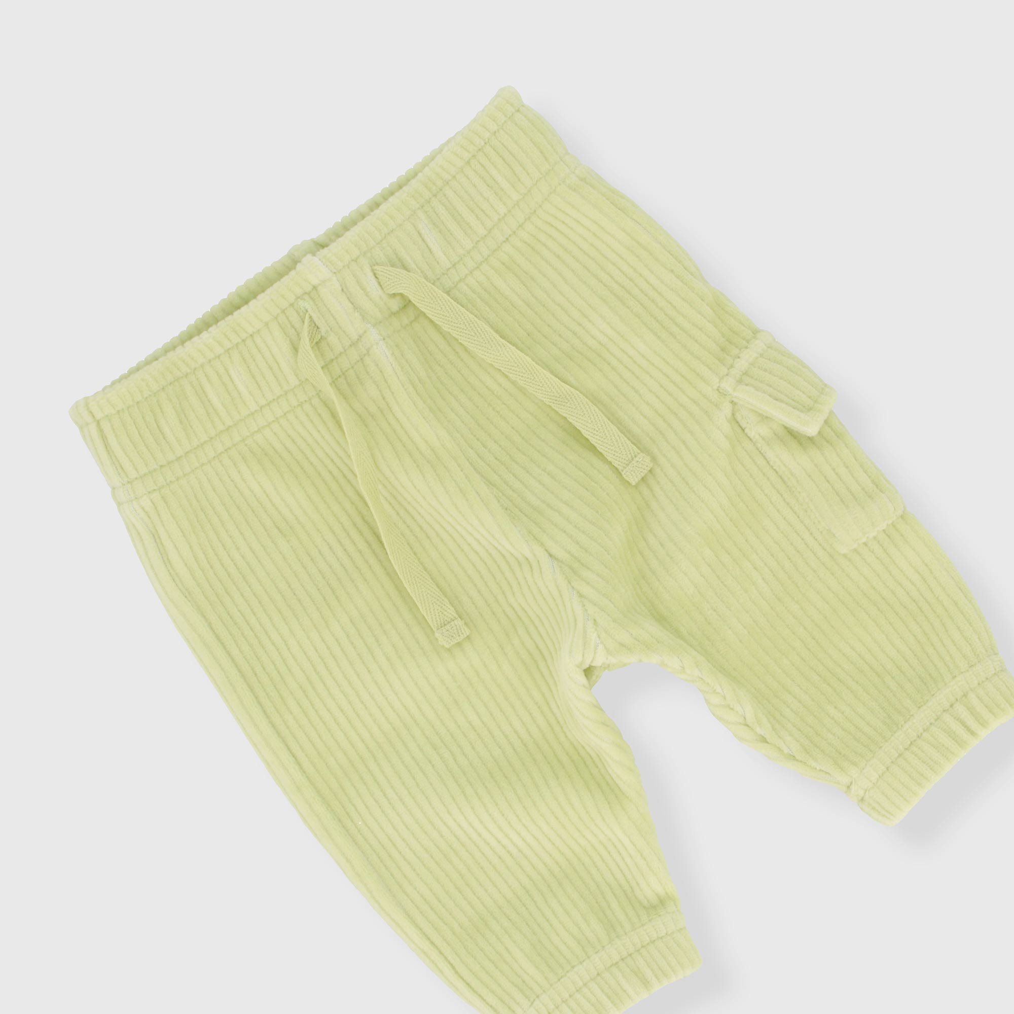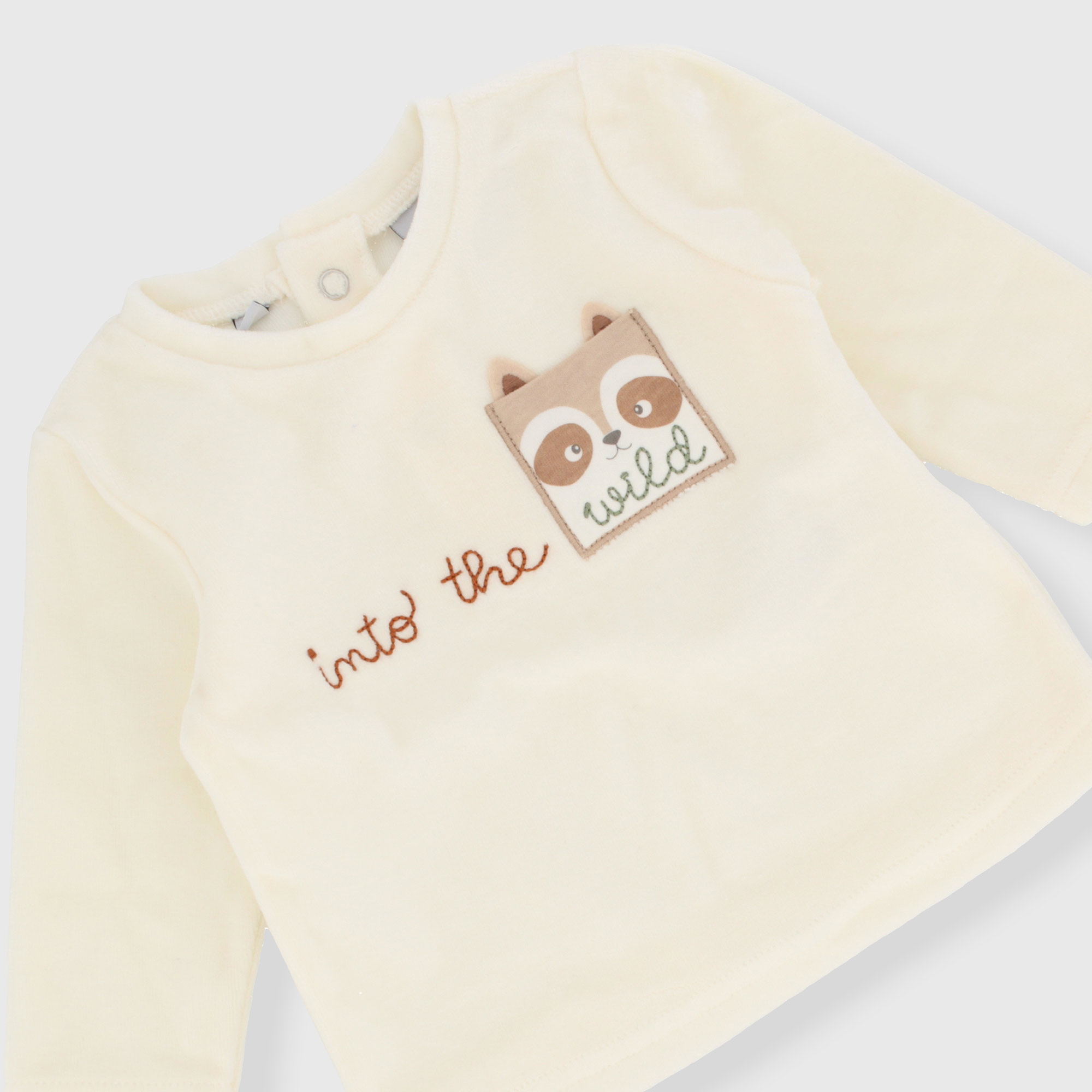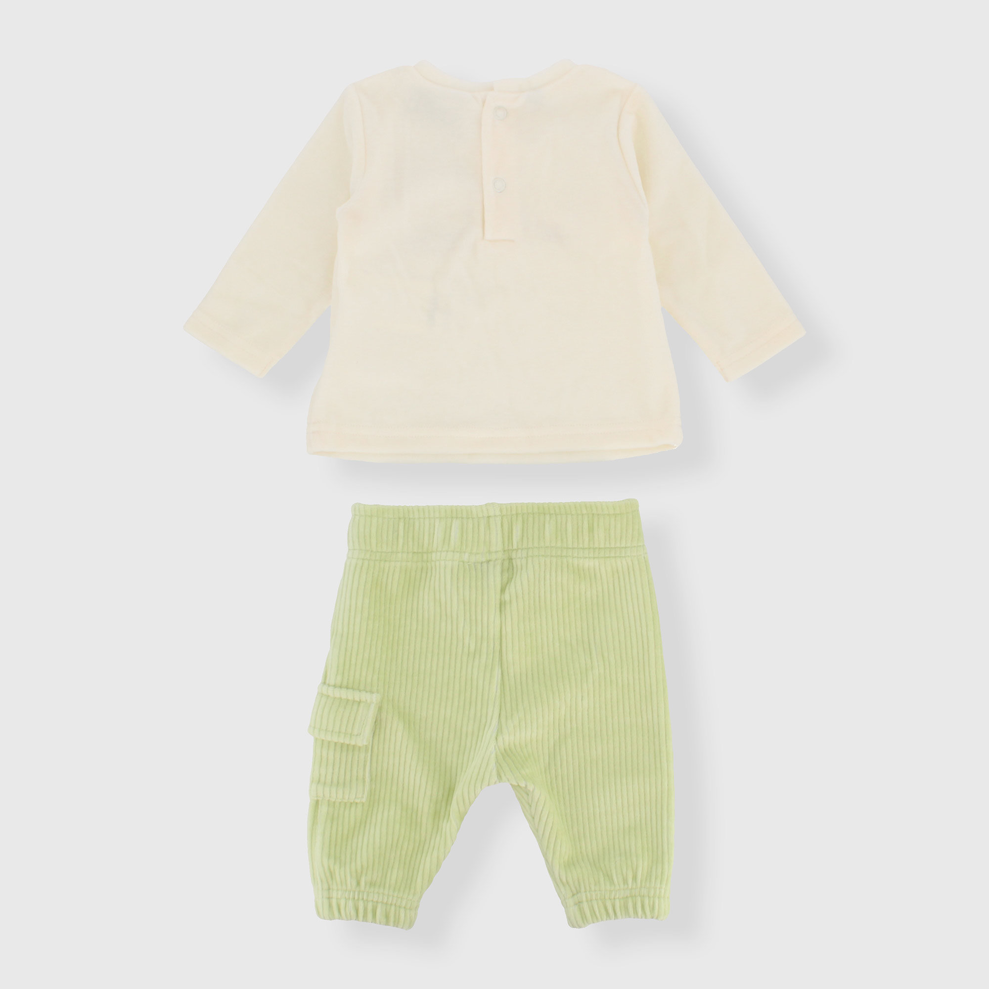 Conjunto de dos piezas. Camiseta cuello redondo, mangas largas. Cierre con botones automáticos en la parte trasera. Parte delantera bordada y con aplicaciones. Pantalón de terciopelo pana, con cintura elástica y cordones delanteros. Grande bolsillo laterarl y parte inferior elástica.