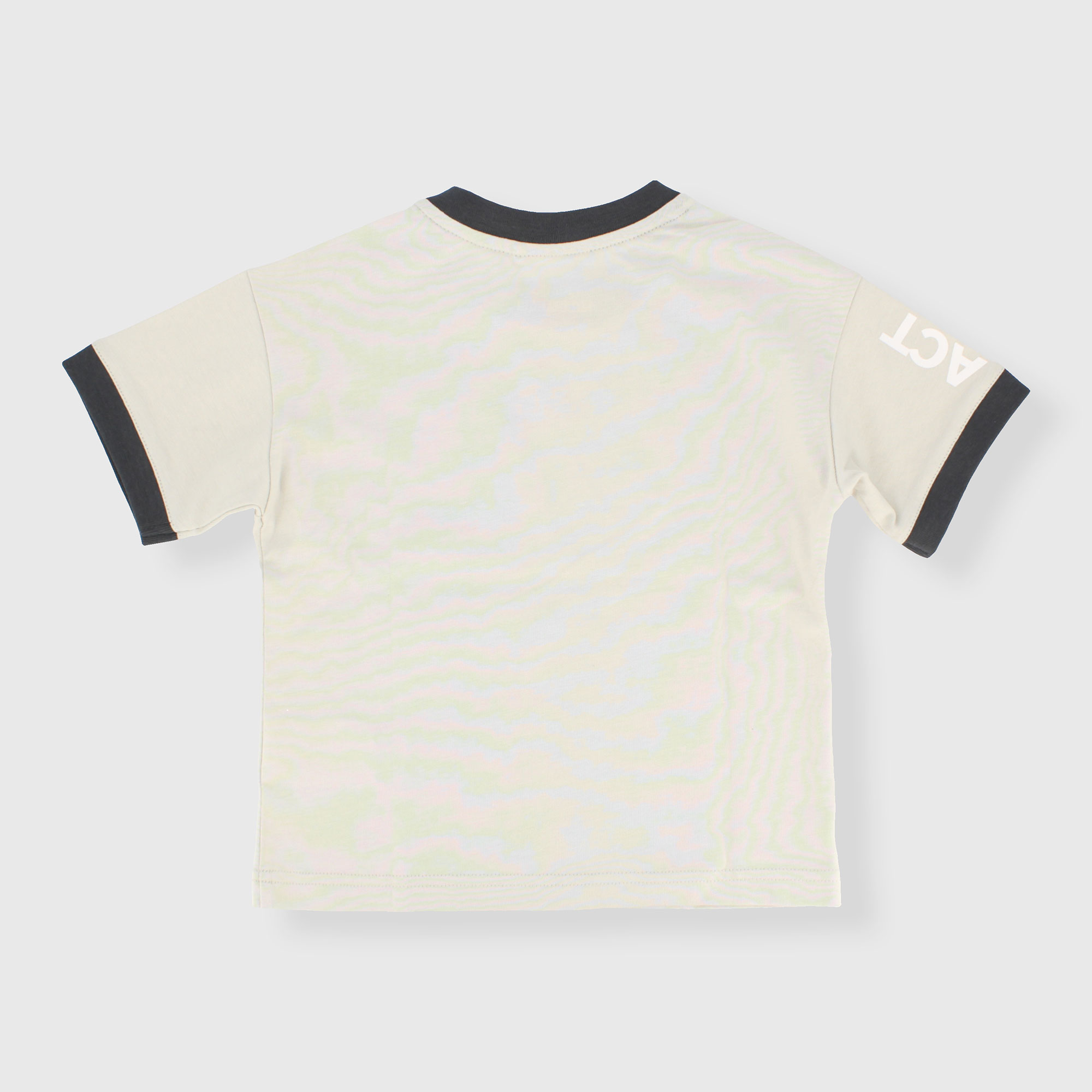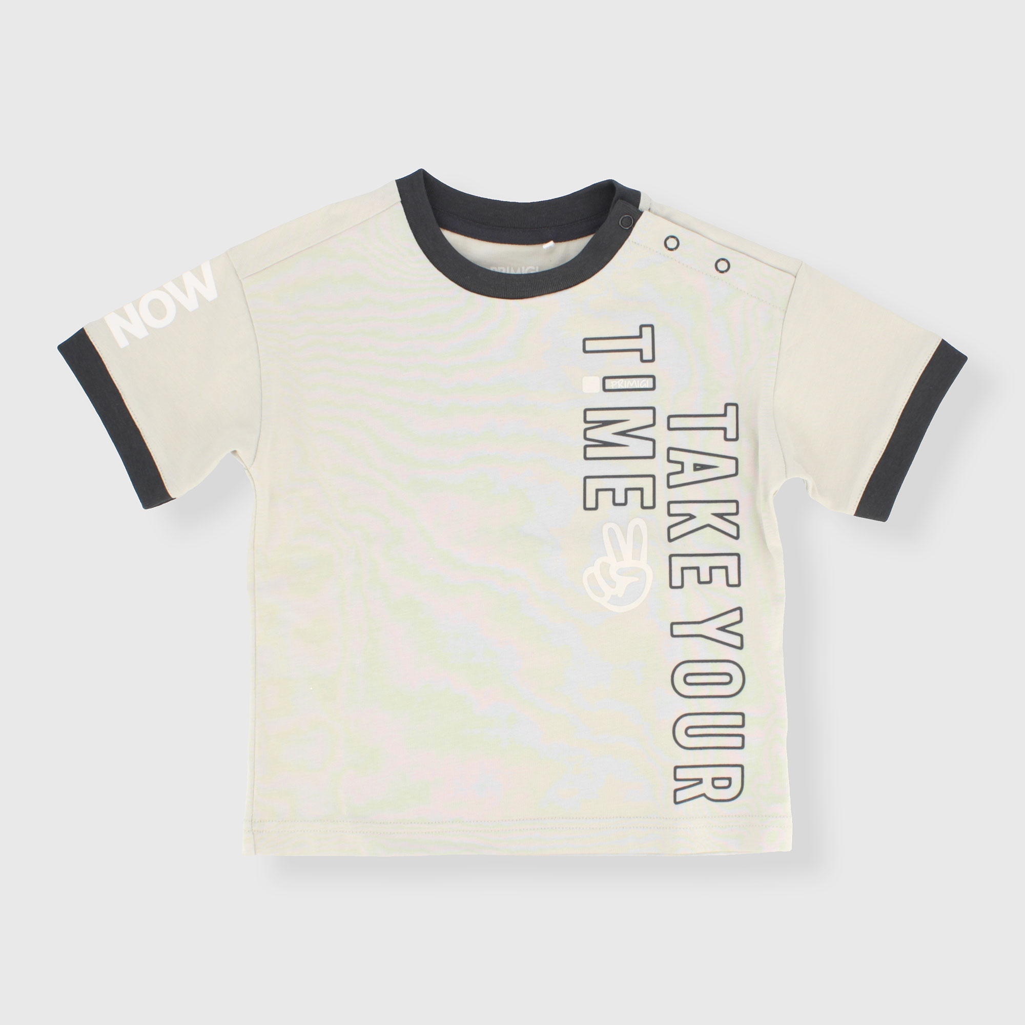 Camiseta de tejido tipo jersey, cuello redondo, mangas cortas. Cierre con botones automáticos en el hombro. Parte delantera estampada. Cuello y parte inferior de la manga en contraste