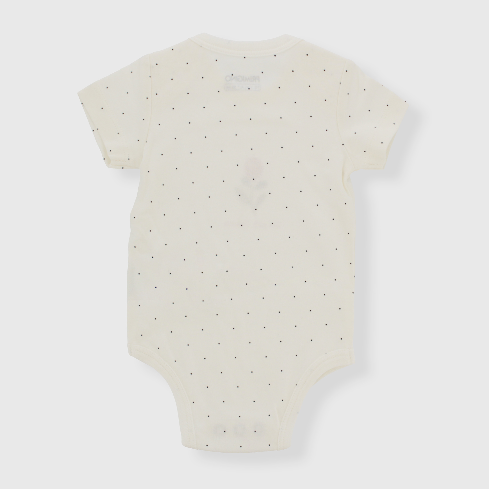 Body de algodón cálido con cuello redondo, mangas cortas. Cierre con botones automáticos en la parte inferior. Lunares y pequeña flor estampados en la parte delantera.