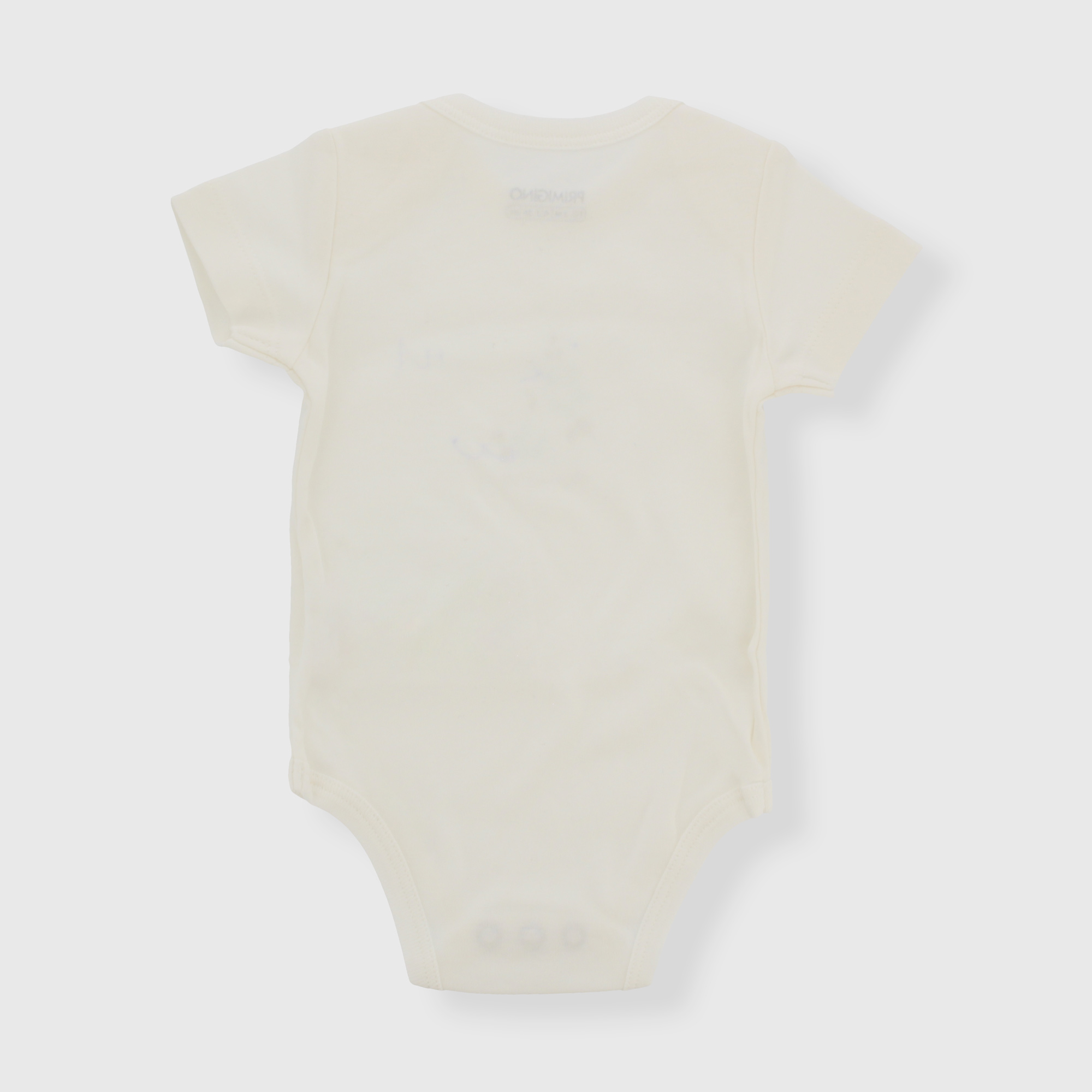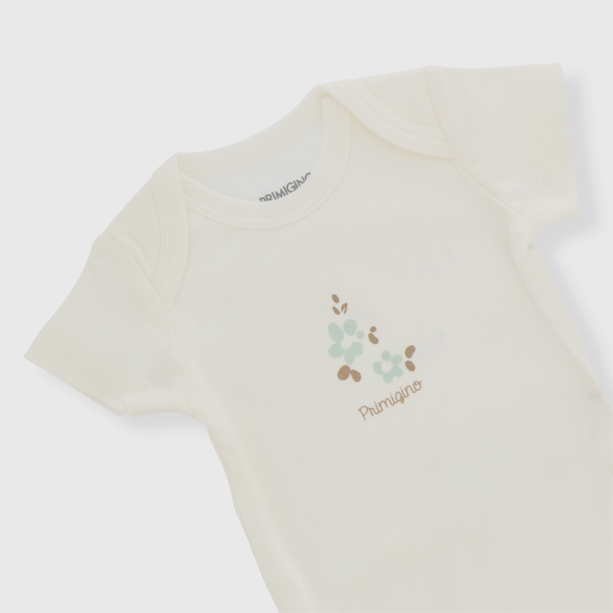 Body de algodón cálido con cuello redondo, mangas cortas. Cierre con botones automáticos en la parte inferior. Parte delantera estampada.