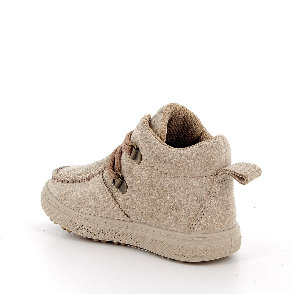 Zapato de primer paso realizado con suave piel ante, de diseño retró y funcional. El detalle de la costura alrededor de la parte delantera añade un toque artesanal y cuidado. El zapato preseunta una punta redonda, que garantiza espacio suficiente y protección para los dedos que crecen. La plantilla extraíble de piel asegura transpirabilidad e higiene, manteniendo los pies frescos y cómodos.