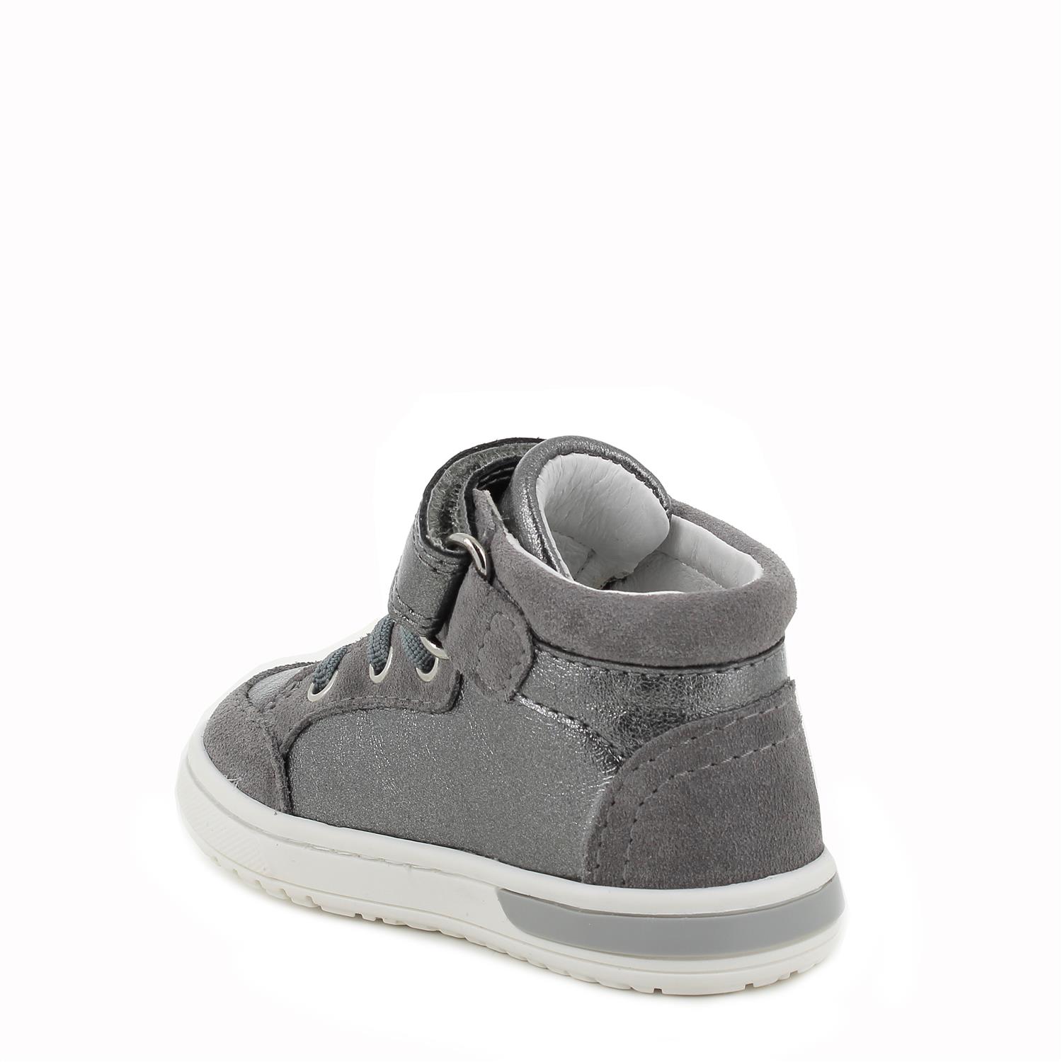Zapatillas deportivas primeros pasos de inspiración baloncesto. La máxima calidad en la selección y manufactura de los materiales es muy importante para un correcto desarrollo de los pies. Estos zapatos son muy preciosos y fáciles de combinar con los outifit de todos los días. Se ajustan gracias al cordón elástico y sujetan con el velcro. La plantilla anatómica es extraíble y está recubierta de piel para asegurar transpirabilidad e higiene.