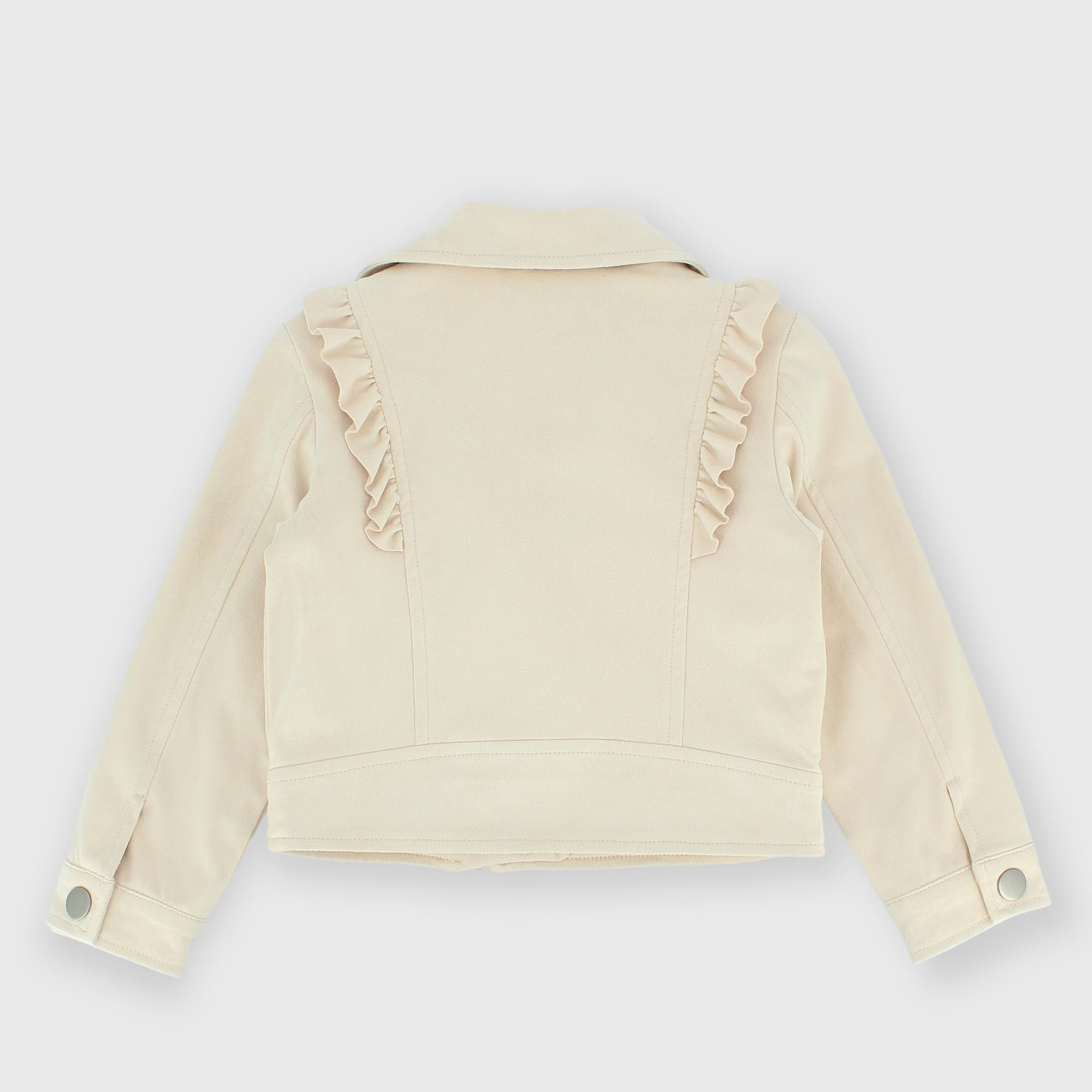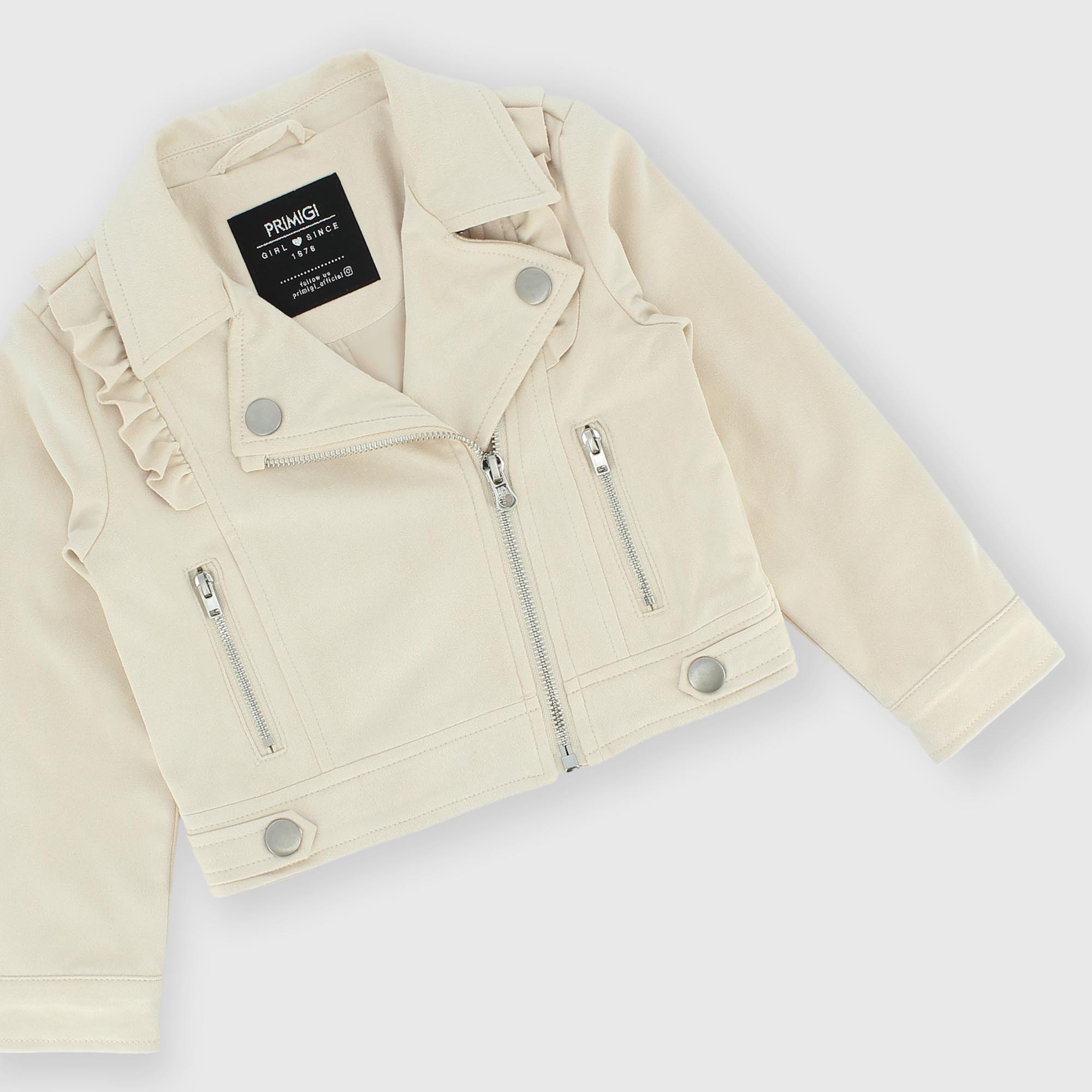 Cazadora de piel sintética ante, con cuello, mangas largas. Cierre con cremallera lateral. Volantes en los hombros y bolsillos oja con cremallera. Forro interior.