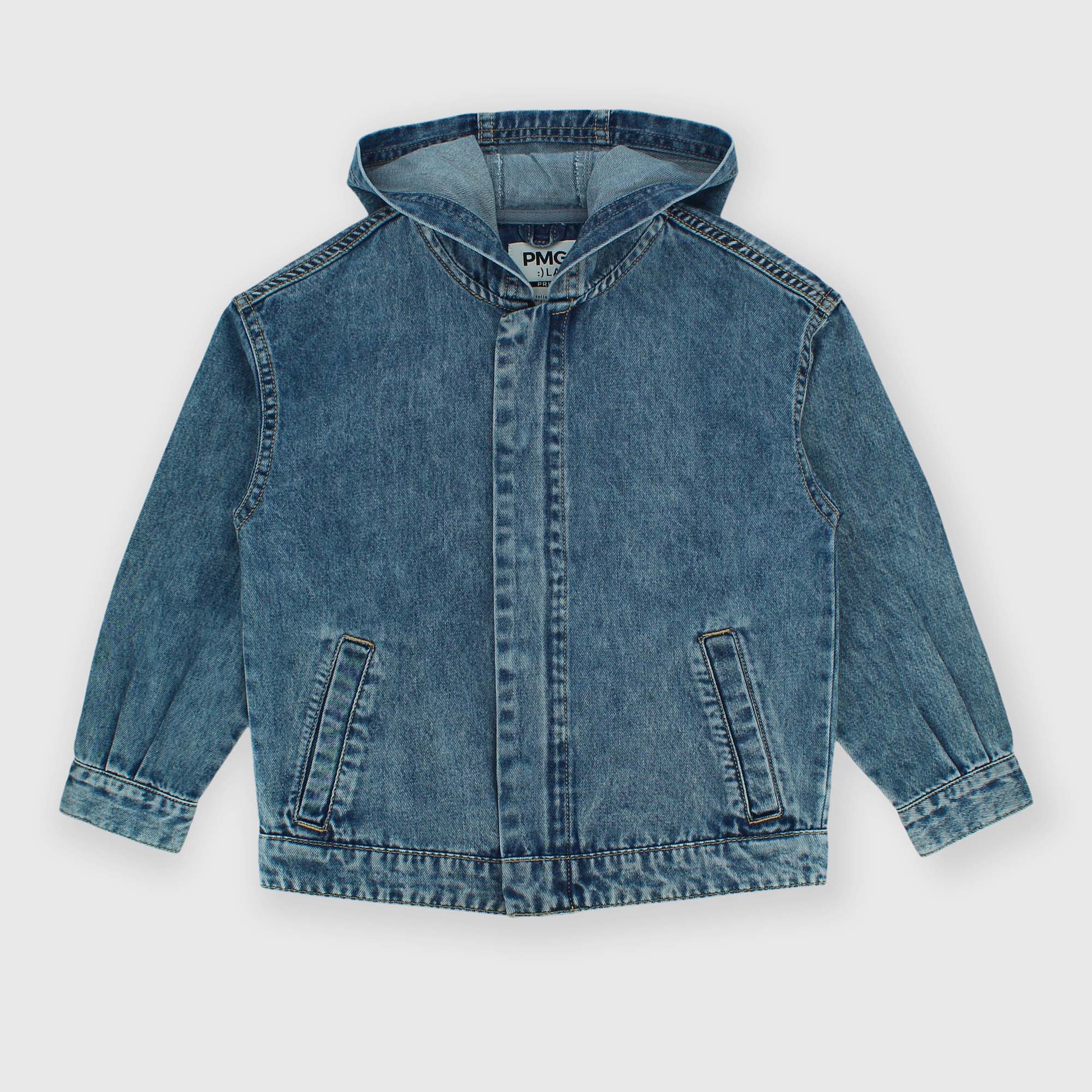 Cazadora vaquera con capucha, mangas largas. Cierre con cremallera y botones automáticos en la parte anterior. Bolsillos ojal.