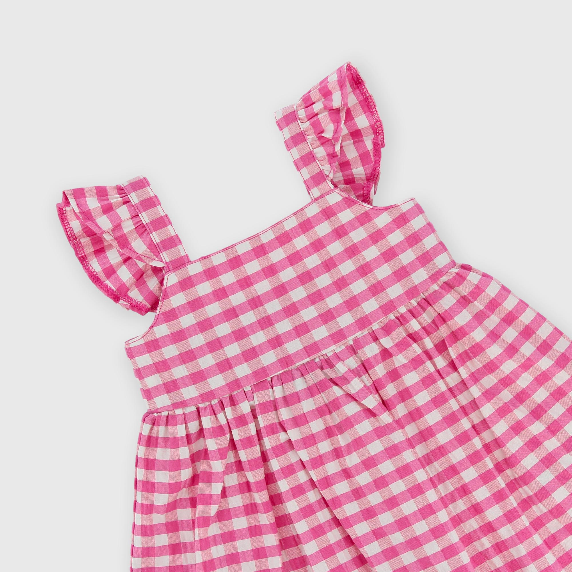 Vestido de cuadros con cuello cuadrado. Tirantes con volantes y cierre con botones en la parte posterior. Pespunets elásticos en la parte trasera. Braga combinada con cintura elástica.