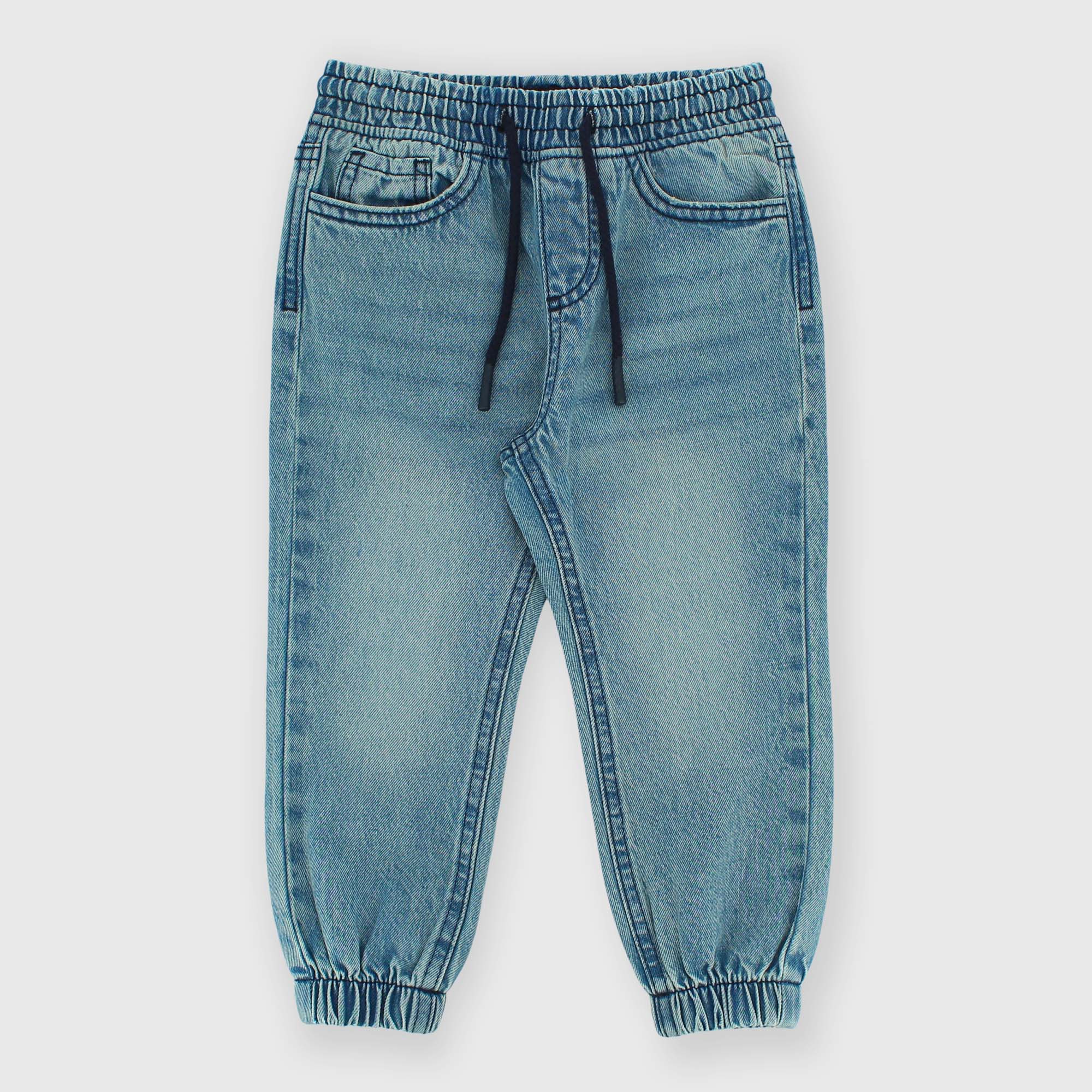 Pantalón vaquero con cintura elástica y cordones delanteros. Cinco bolsillos. Parte inferior elástica.