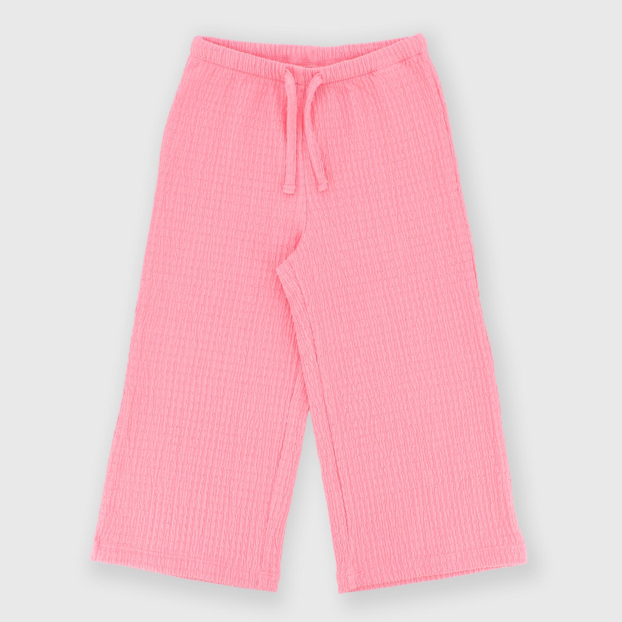 Pantalón de pierna ancha en tejido seersucker con cintura elástica y cordones delanteros.