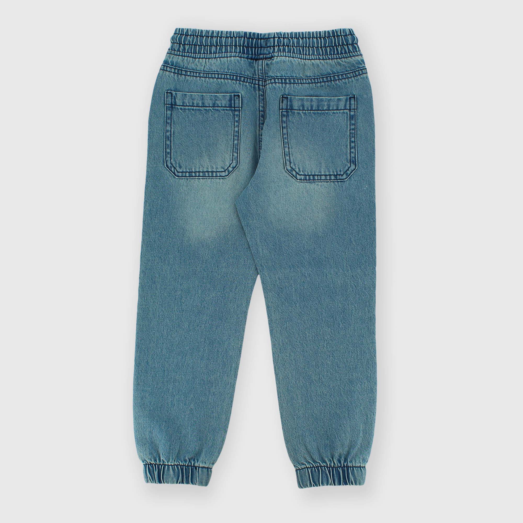 Pantalón vaquero con cintura elástica y cordones delanteros. Cinco bolsillos. Parte inferior elástica.