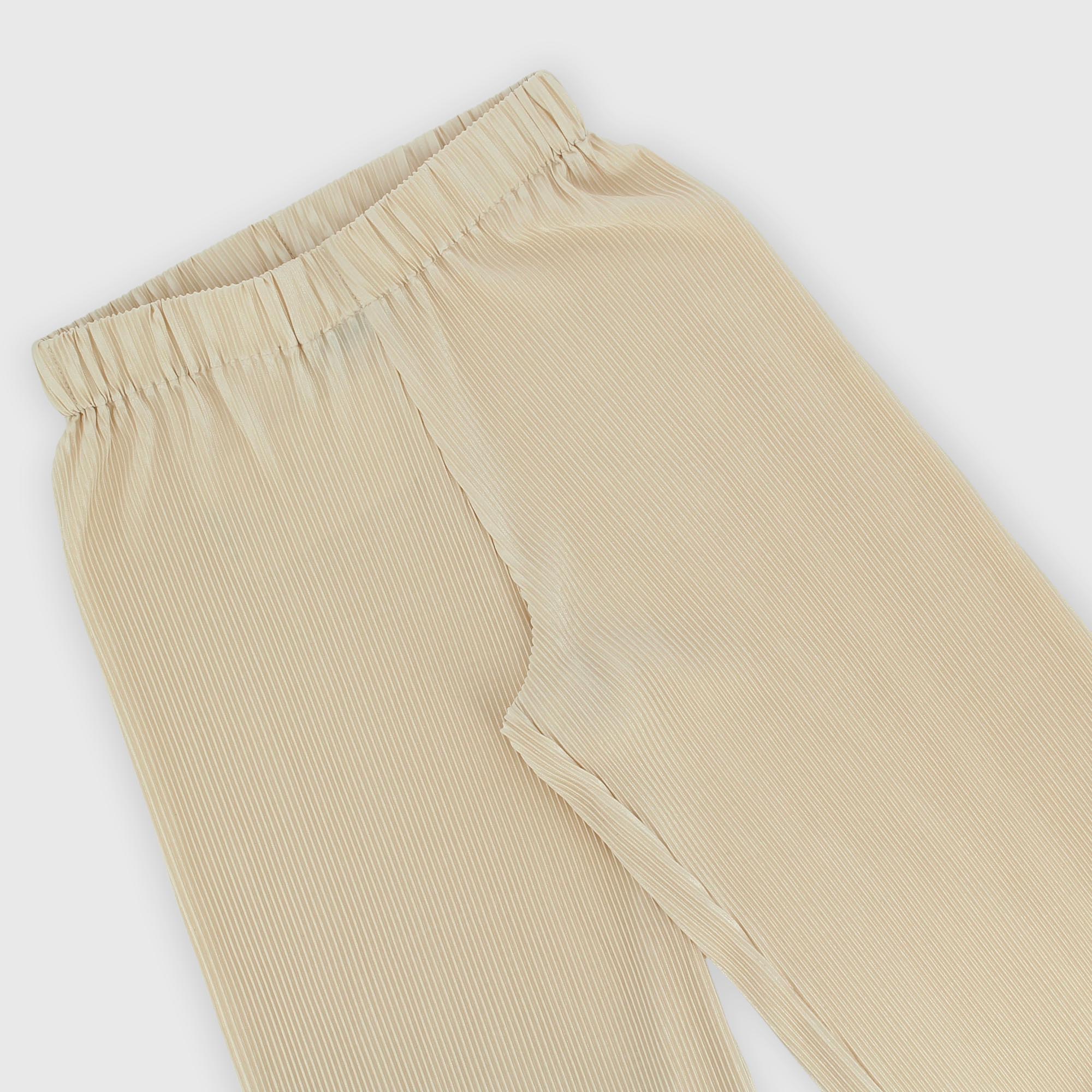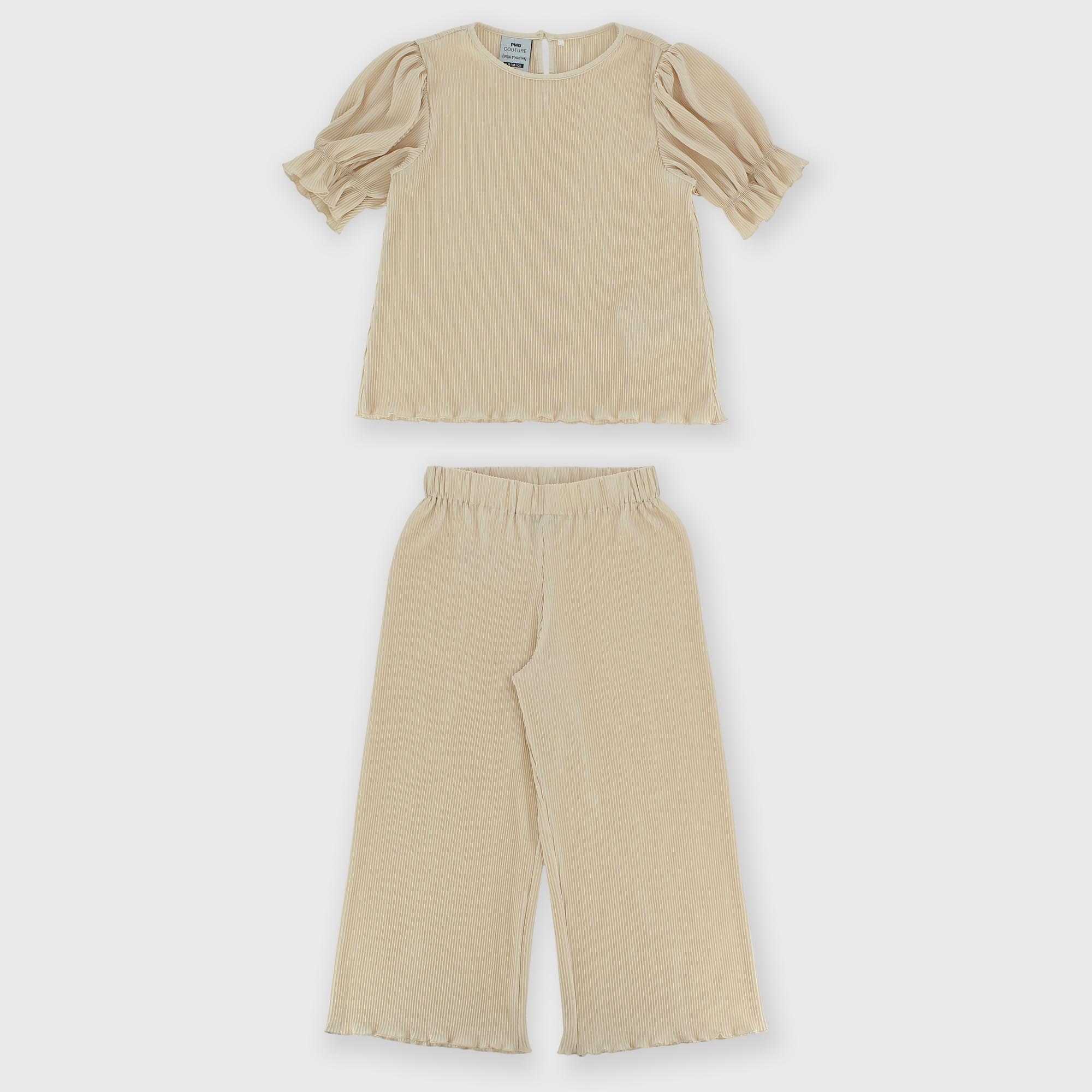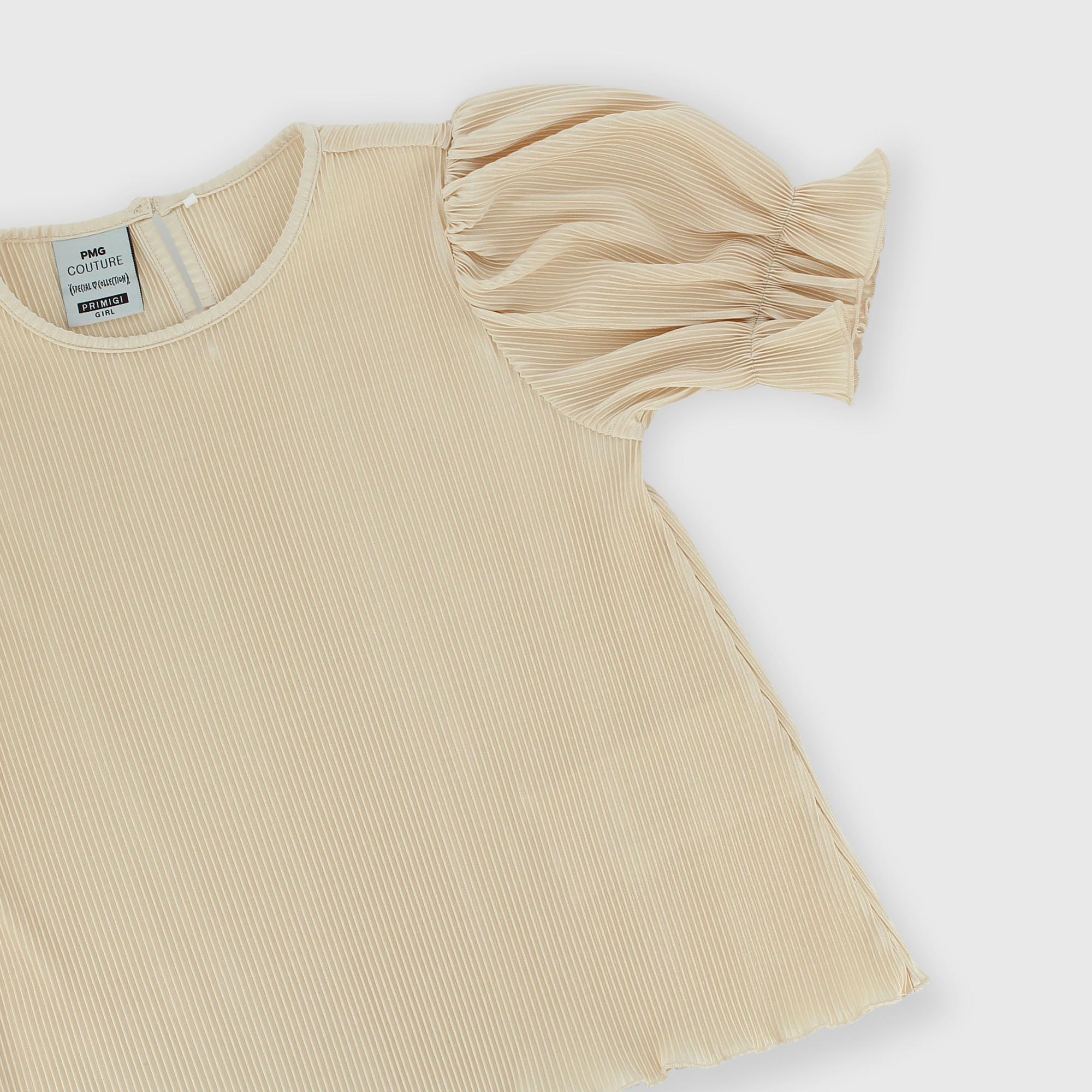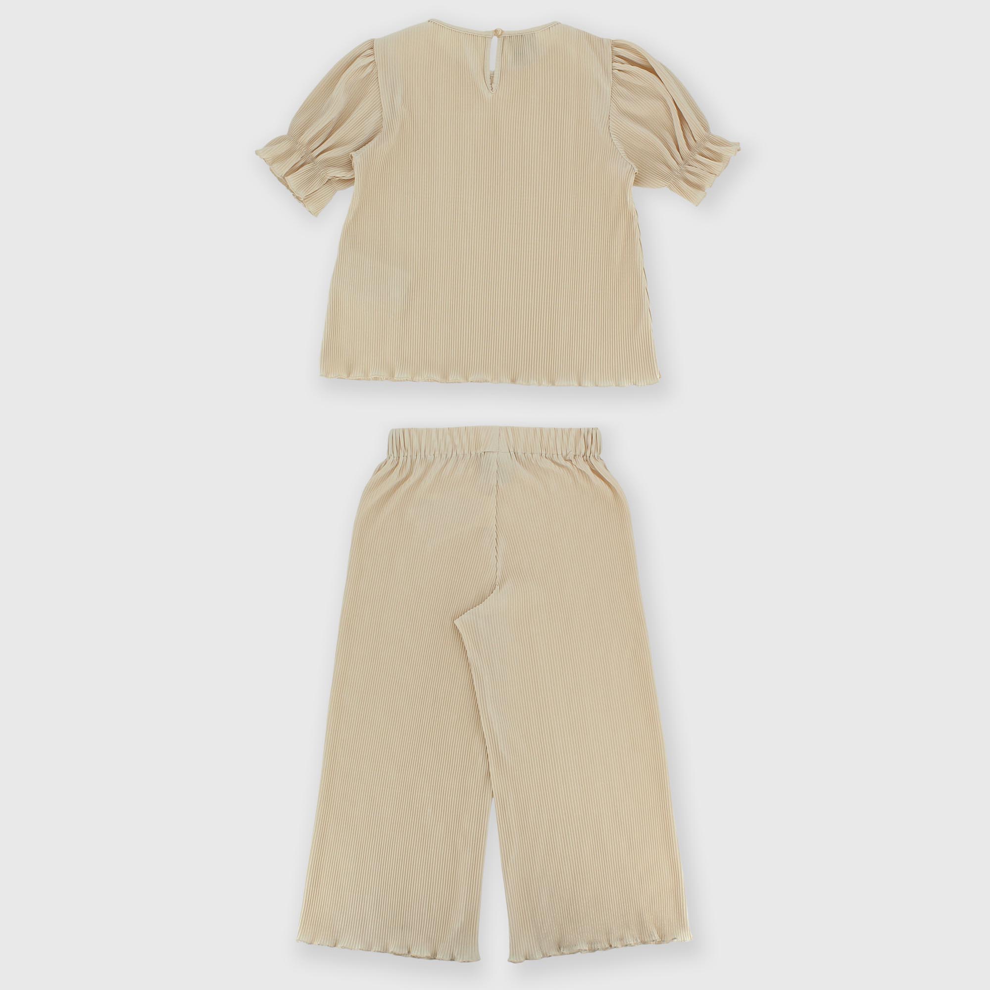 Conjunto plisado formado por dos piezas. Blusa, cuello redondo, con mangas cortas tipo globo. Cierre tipo gota con botón en la parte posterior. Pantalón de pierna ancha con cintura elástica. Acabados de punto bambola.