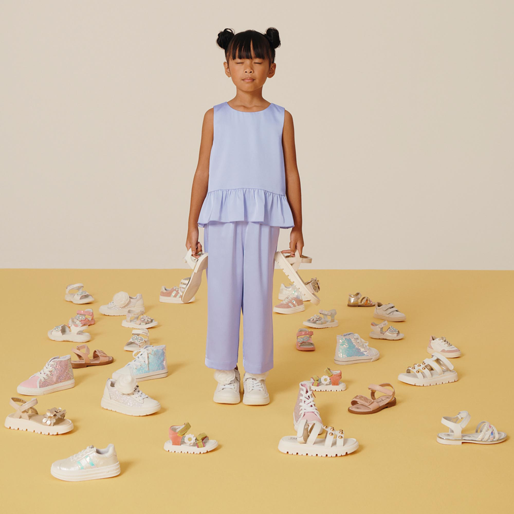 Conjunto formado por dos piezas. Blusa cuello redondo, sin mangas. Cierre tipo gota con botón en la parte posterior. Volante en la parte inferior. Pantalón de pierna ancha con cintura elástica.