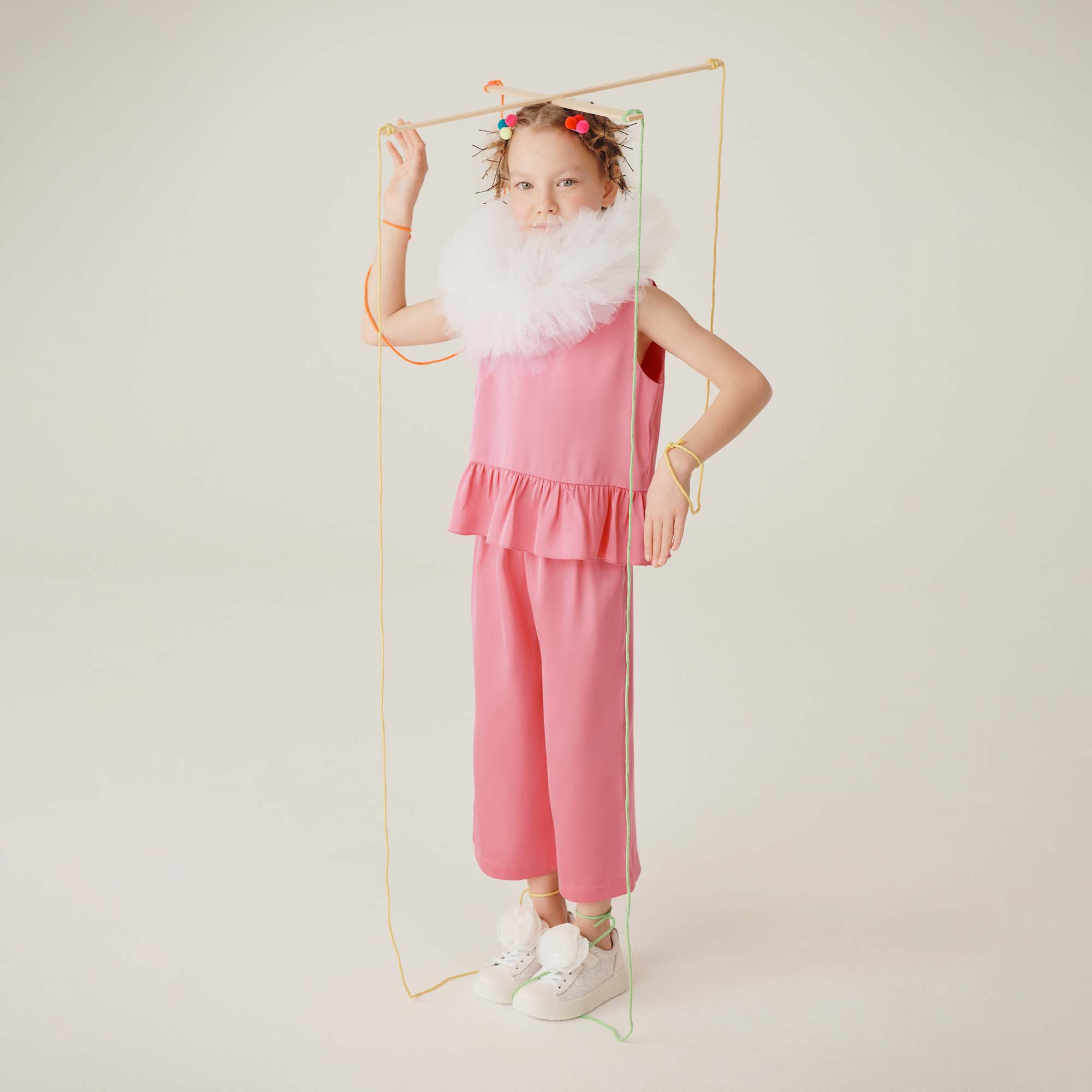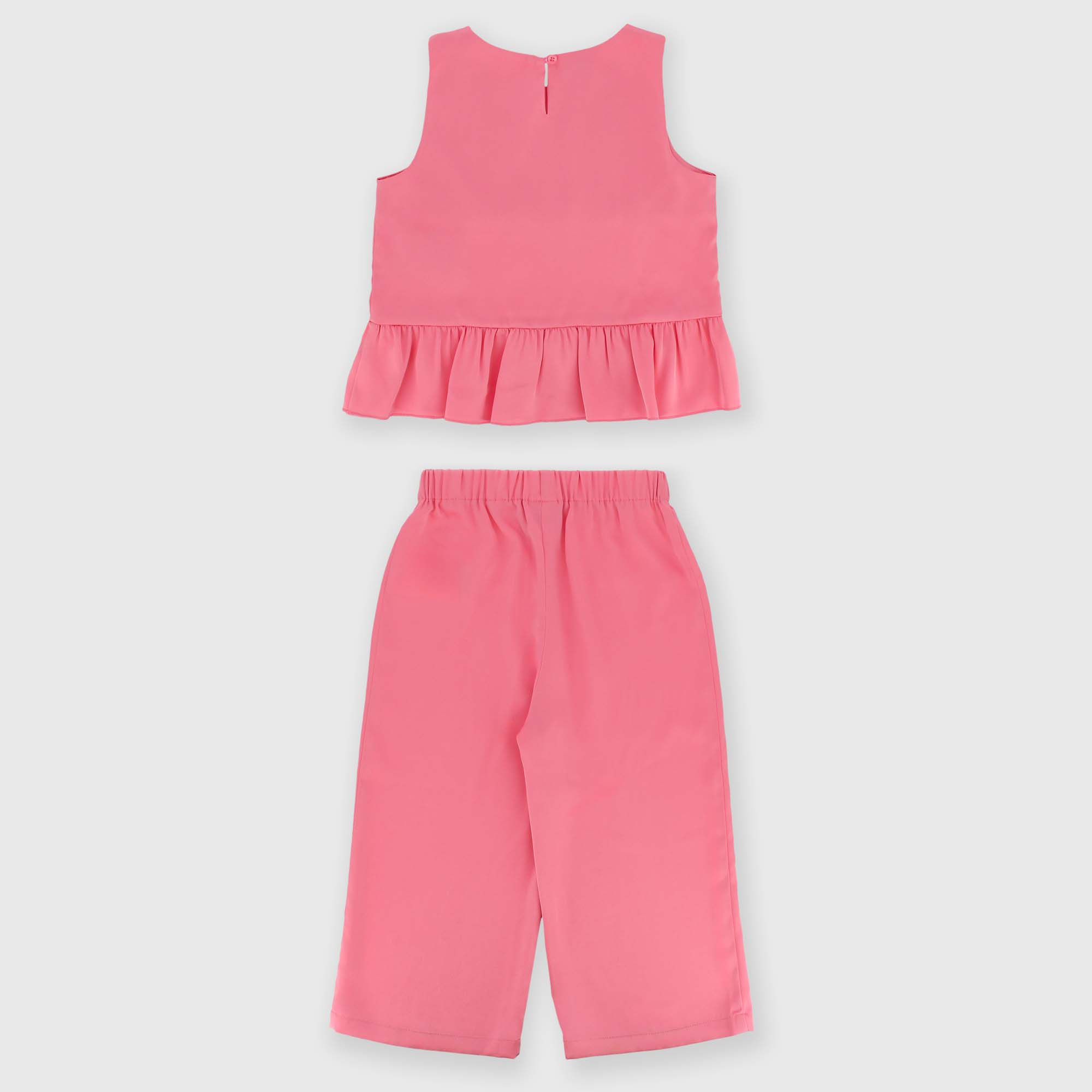 Conjunto formado por dos piezas. Blusa cuello redondo, sin mangas. Cierre tipo gota con botón en la parte posterior. Volante en la parte inferior. Pantalón de pierna ancha con cintura elástica.