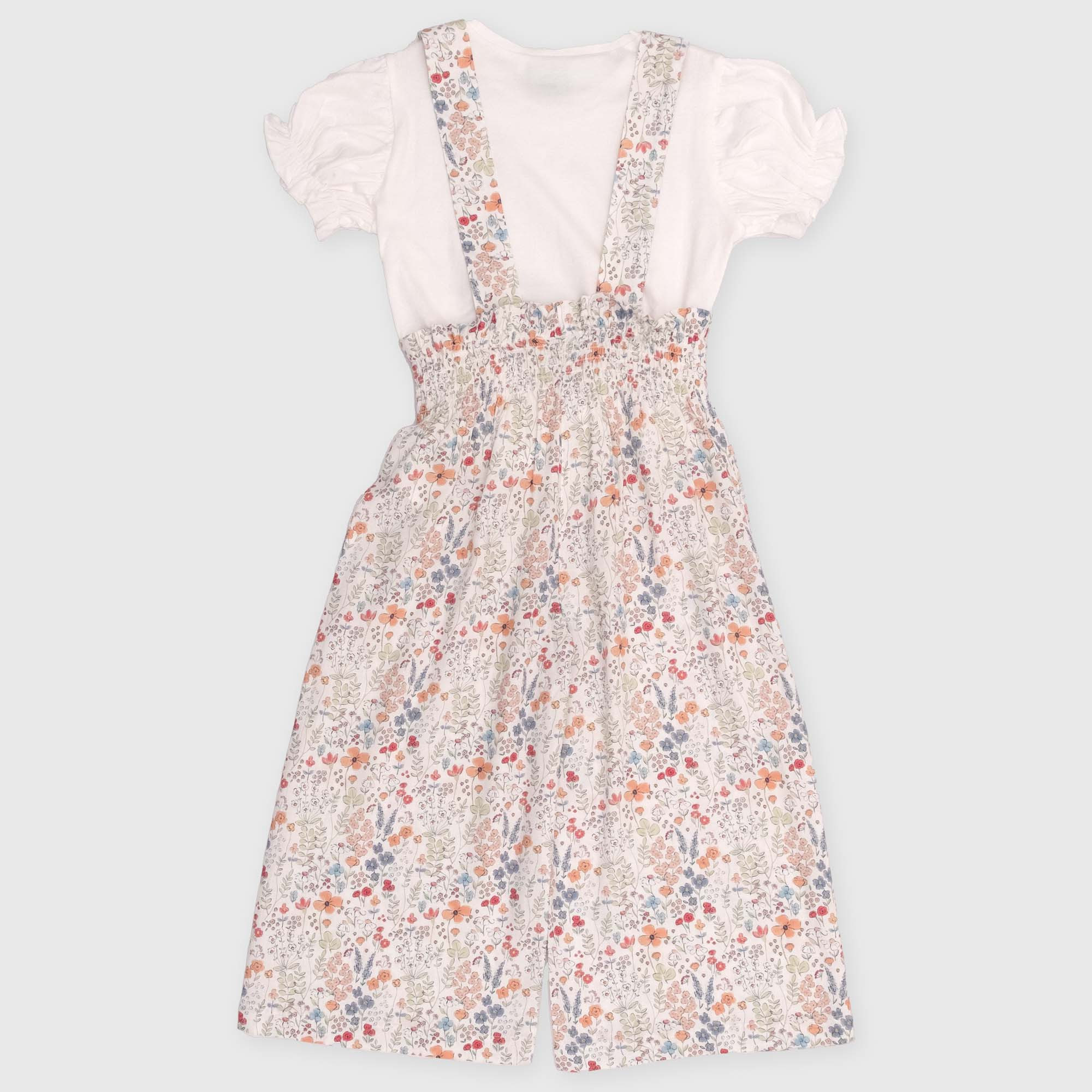 Conjunto formado por dos piezas. Camiseta de tejido Jersey, cuello redondo, con mangas cortas tipo globo. Peto de piernas anchas de viscosa con cintura elástica. Tirantes ajustables con botones interiores. Flores estampadas all over.