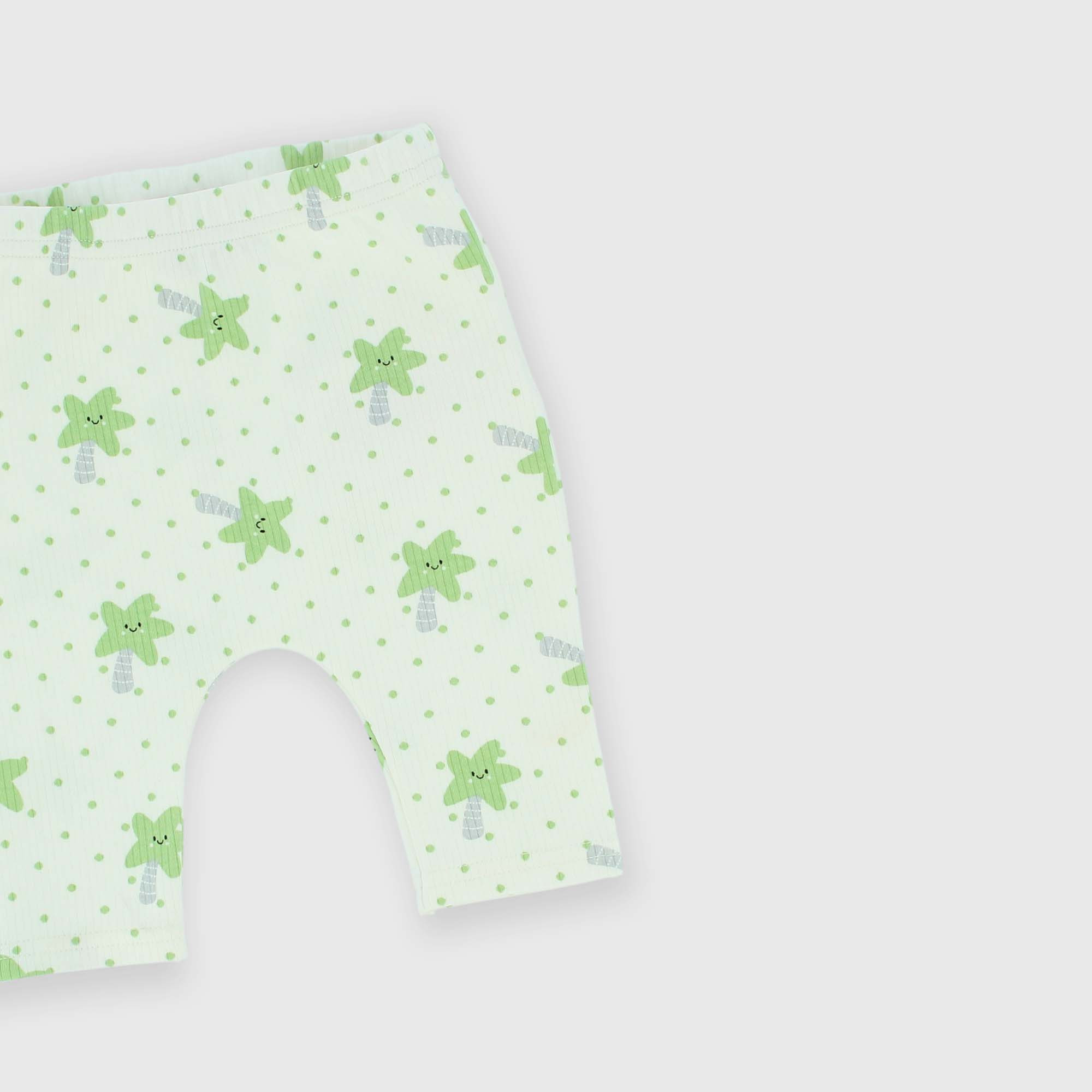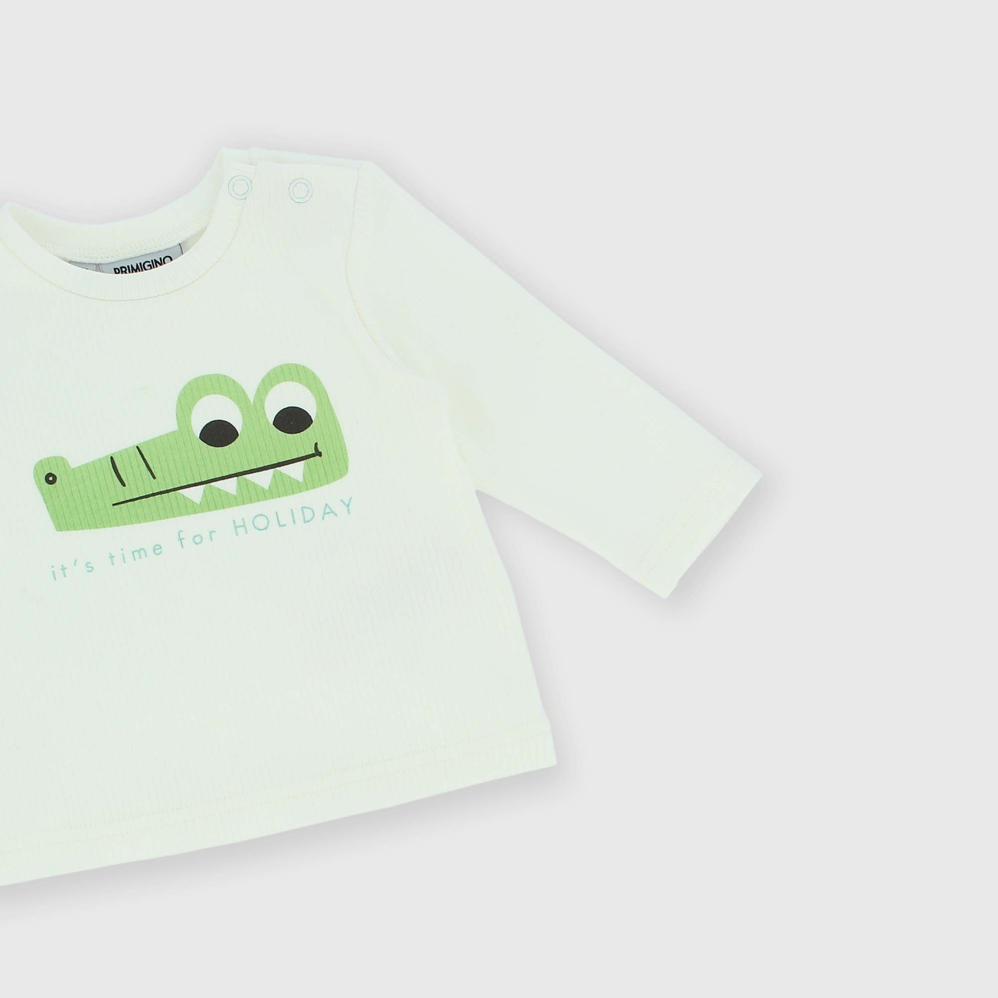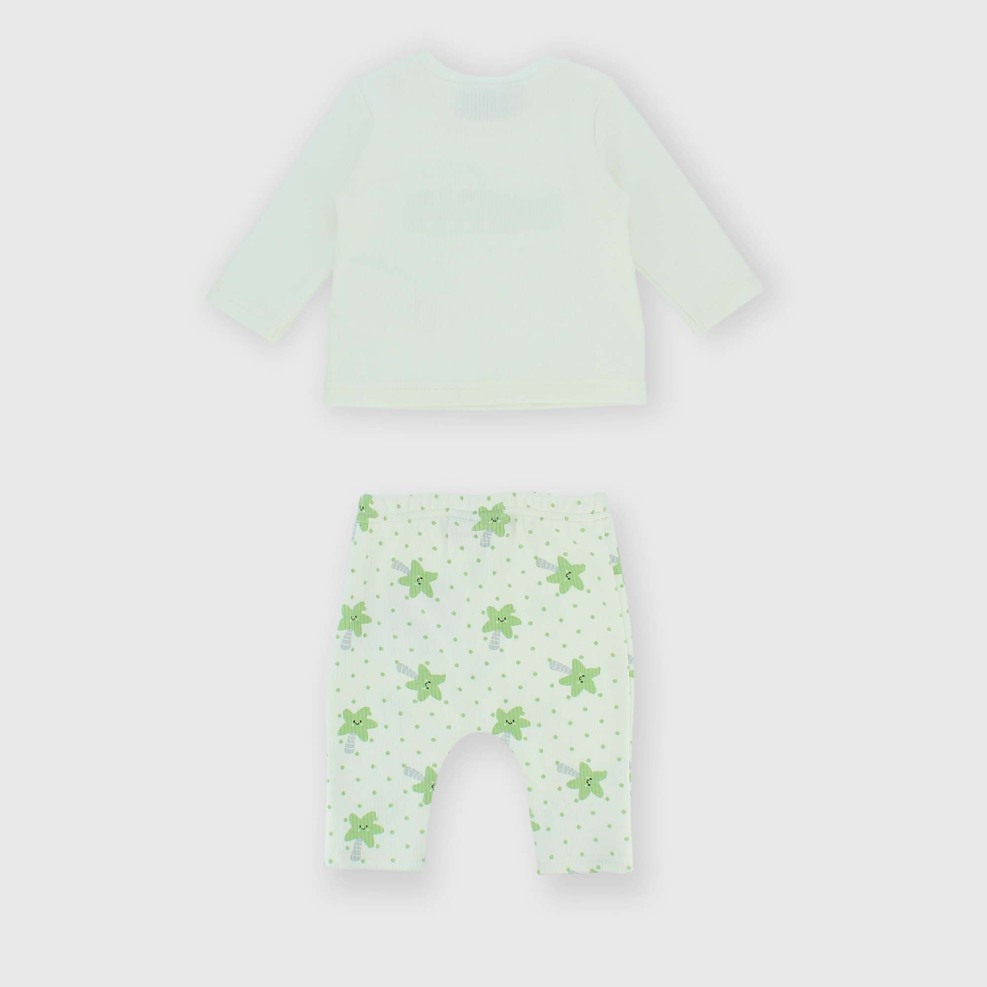 Conjunto canalé formado por dos piezas. Camiseta, cuello redondo, mangas largas. Cierre con botones automáticos en el hombro. Cocodrilo estampado en la parte delantera. Pantalón con cintura elástica. Estrellas estampadas all over.