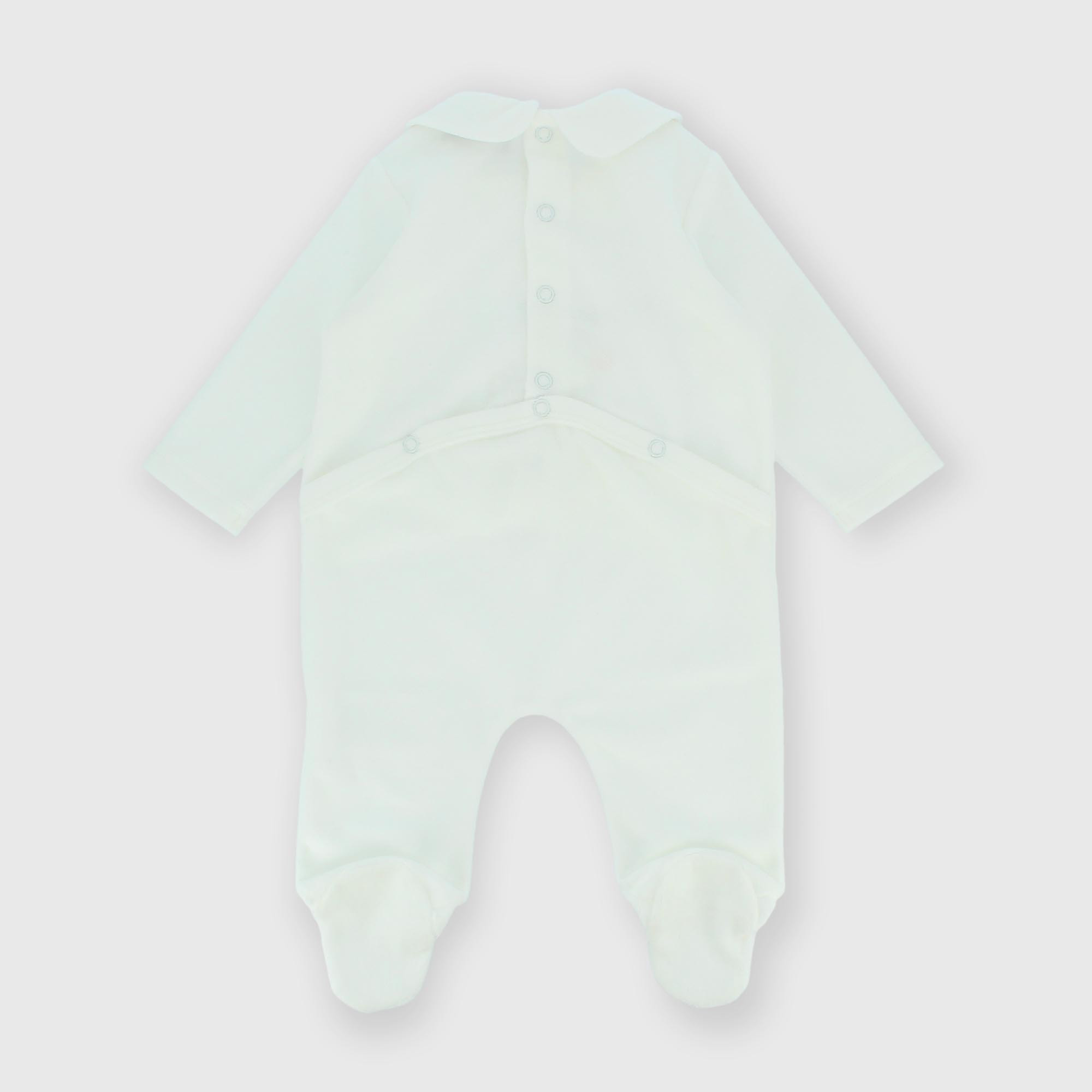 Mono de felpilla con cuello tipo peter pan, con mangas largas. Cierre con botones en la parte posterior. Aplicación bordada en la parte delantera.