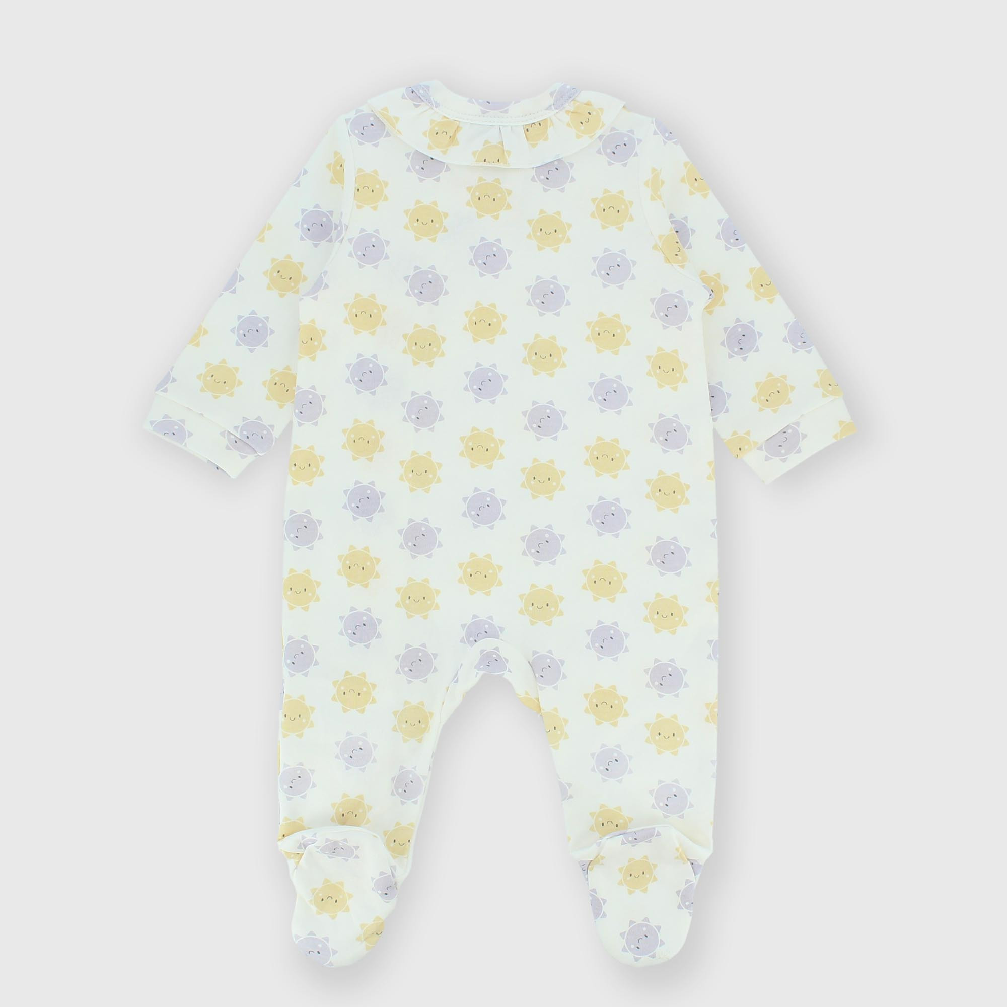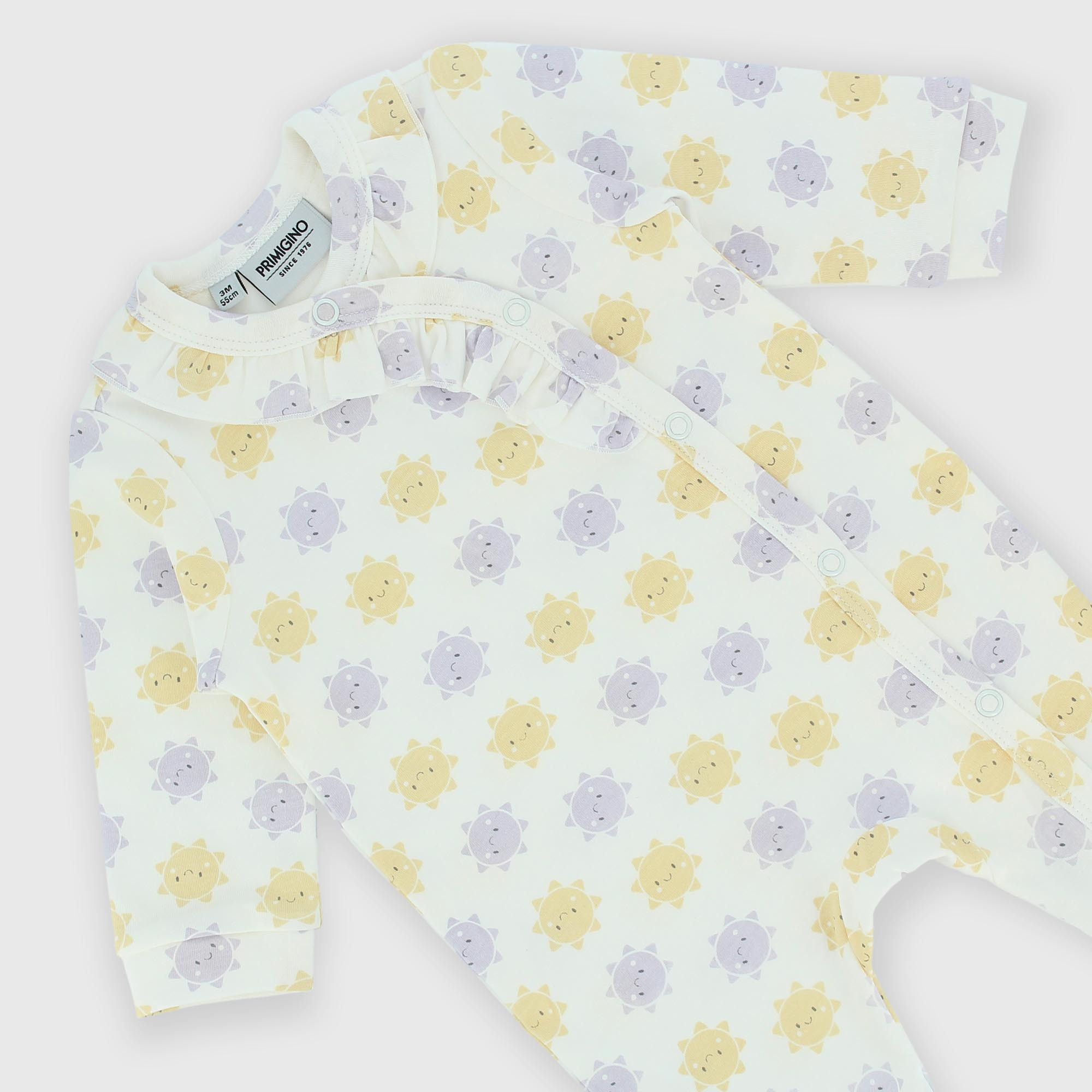 Mono de tejido Interlock , con cuello redondo, mangas largas. Cierre tipo quimono con botones automáticos. Sol estampado all over. Volantes en el cuello y en la parte delantera.