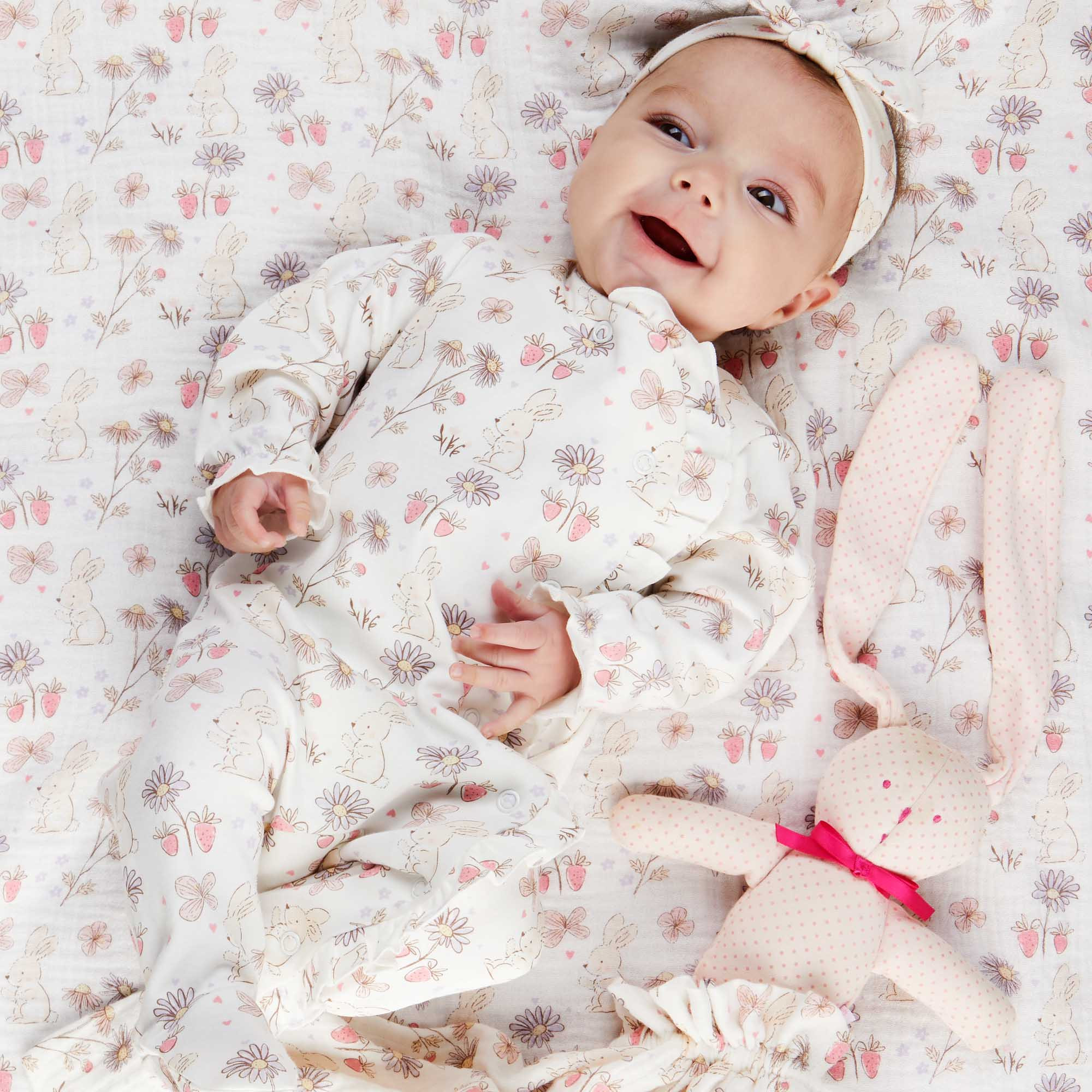 Mono de tejido Interlock, con cuello redondo, mangas largas. Cierre tipo quimono con botones automáticos. Estampado all over. Volantes en la parte delantera.