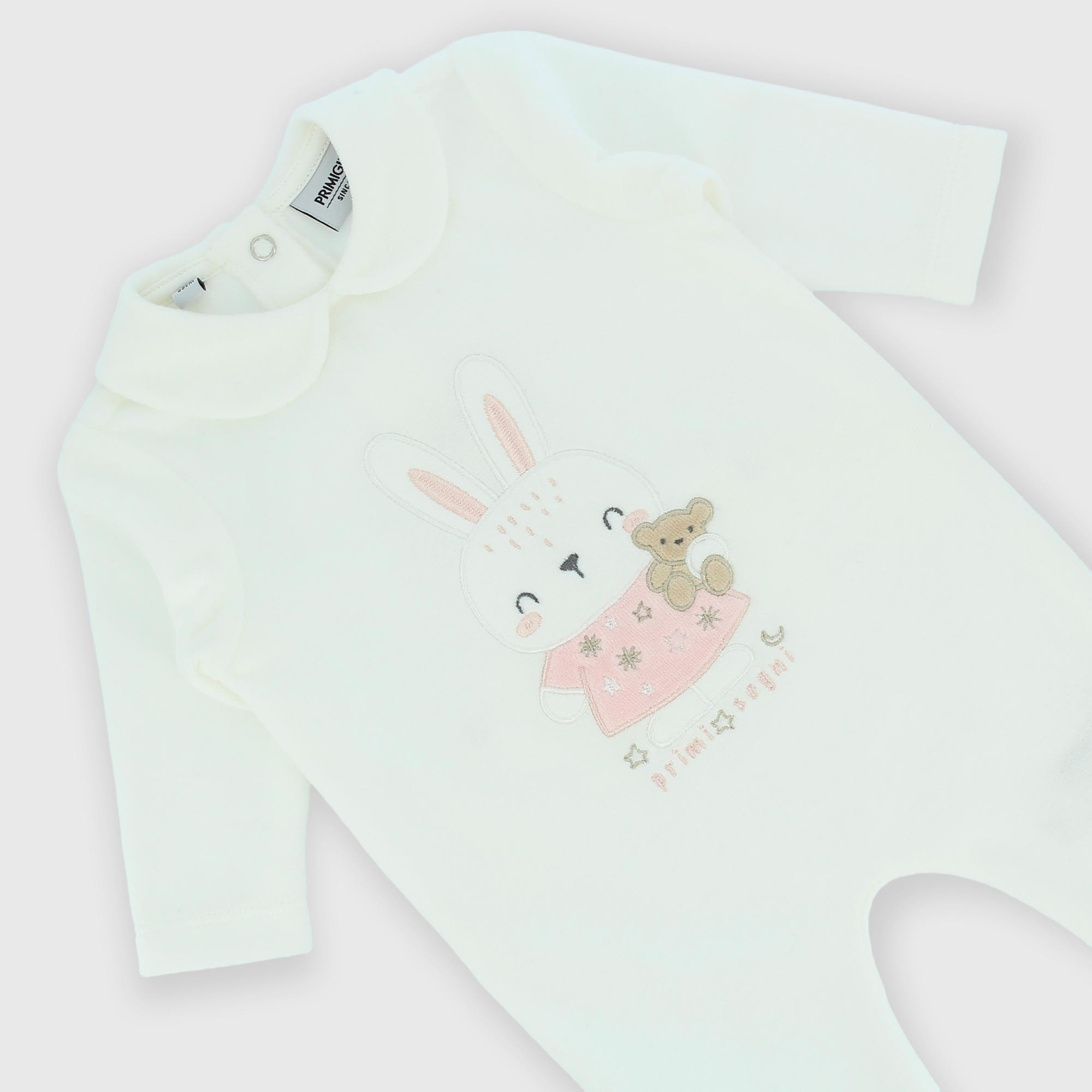 Mono de felpilla con cuello tipo peter pan, con mangas largas. Cierre con botones en la parte posterior. Aplicación bordada en la parte delantera.