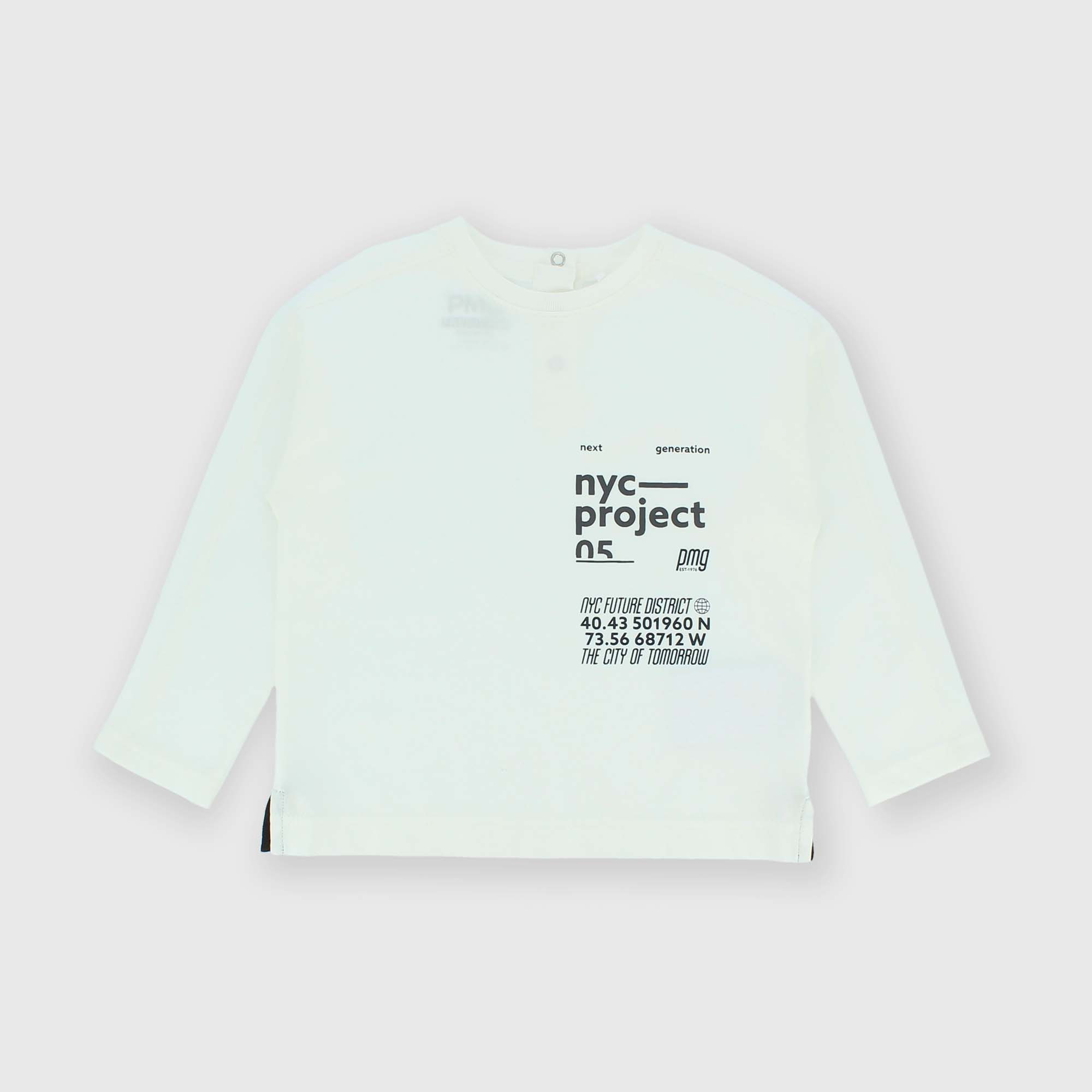 Camiseta de tejido Jersey, con cuello redondo, mangas largas. Cierre con botones automáticos en el hombro. Estampado con escritas efecto goma en la parte delantera. Pequeños cortes laterales en la parte inferior.