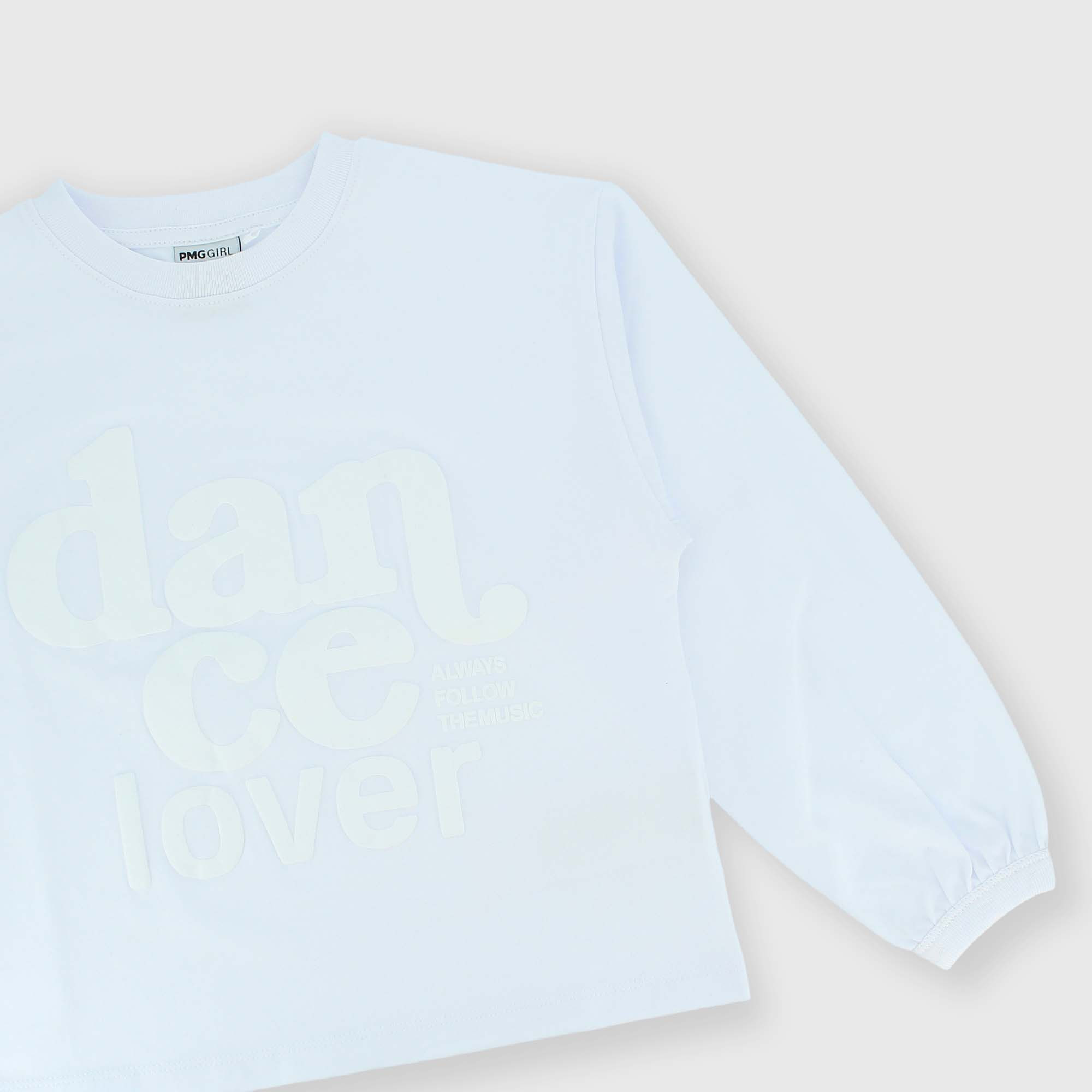 Camiseta de tejido Jersey, con cuello redondo, mangas globo largas. Escritas efecto goma impresas en la parte delantera.
