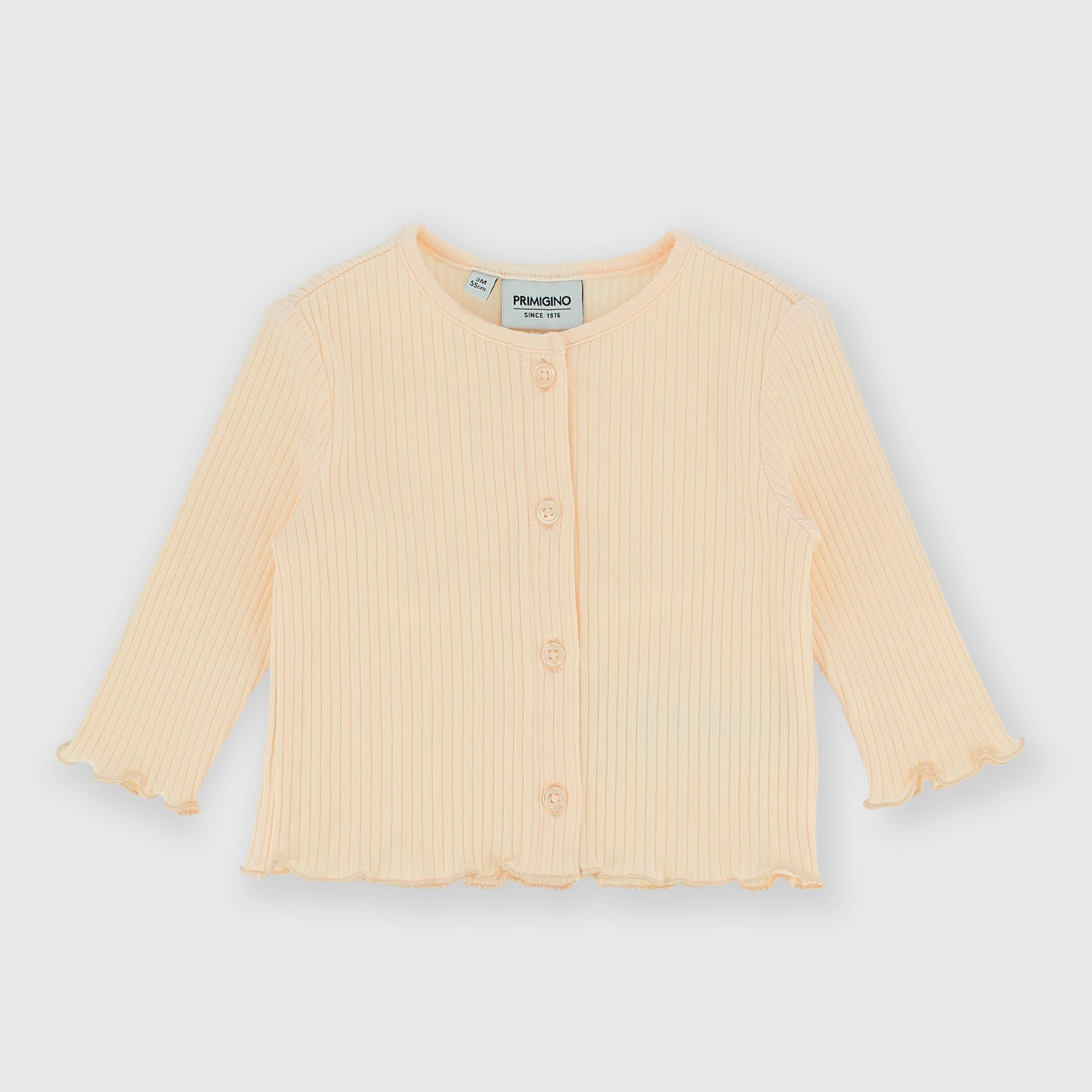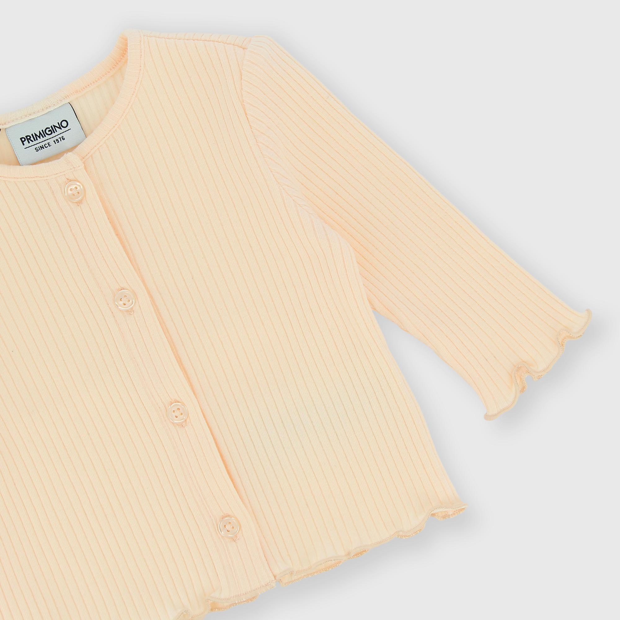 Rebeca canalé, cuello redondo. Cierre con botones en la parte delantera. Acabado con punto bambola.