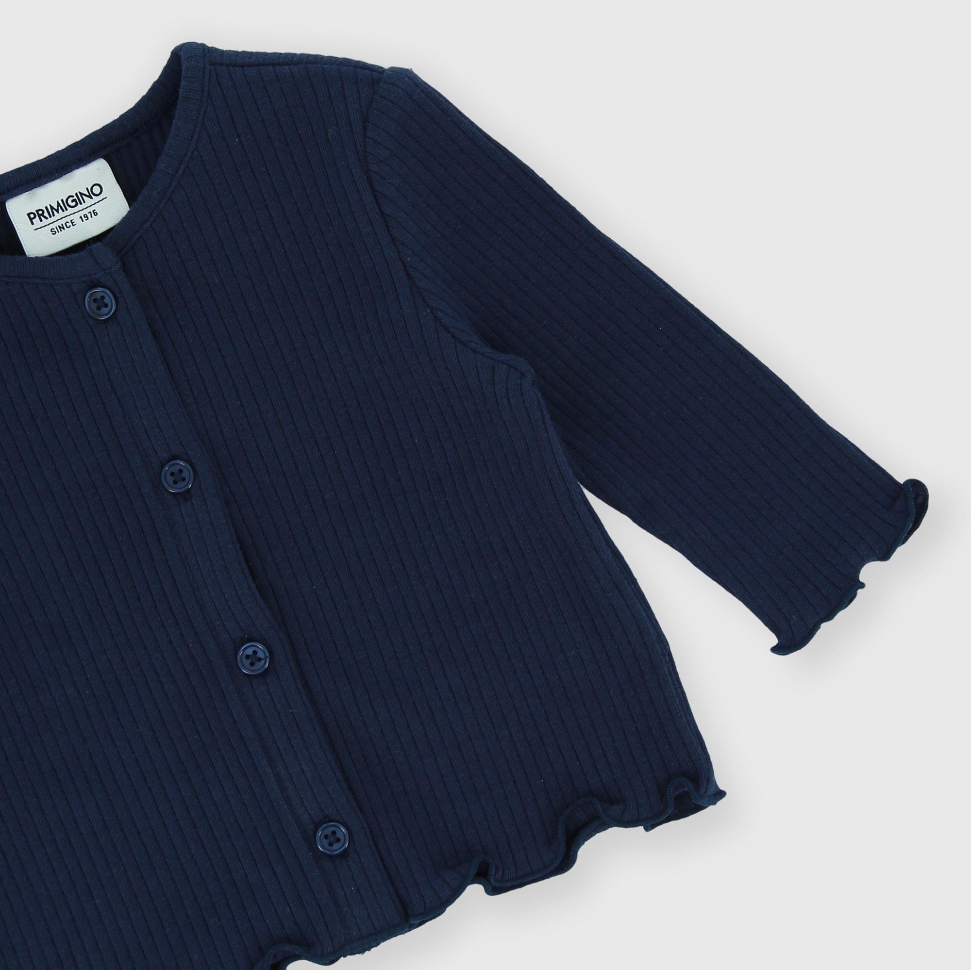 Rebeca canalé, cuello redondo. Cierre con botones en la parte delantera. Acabado con punto bambola.