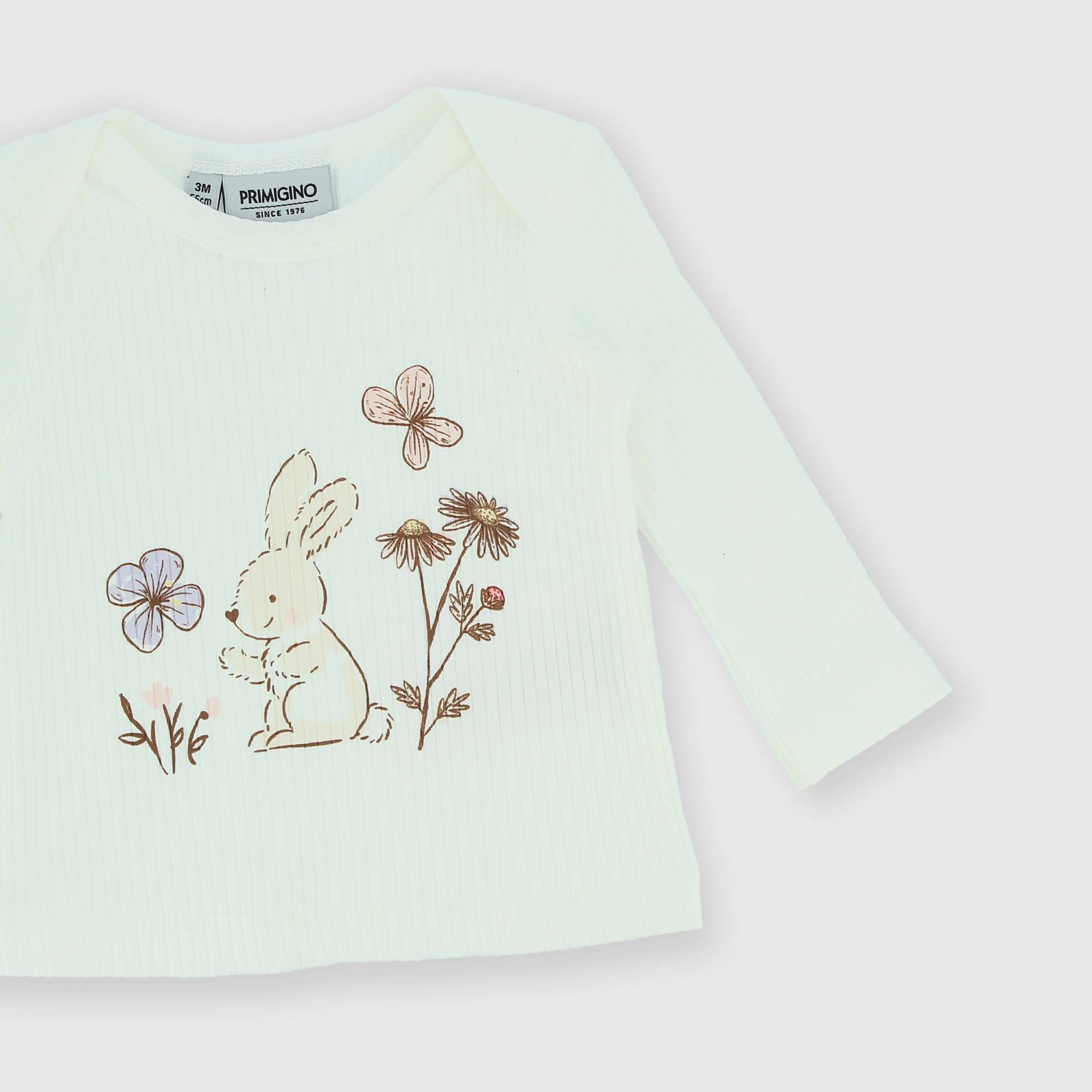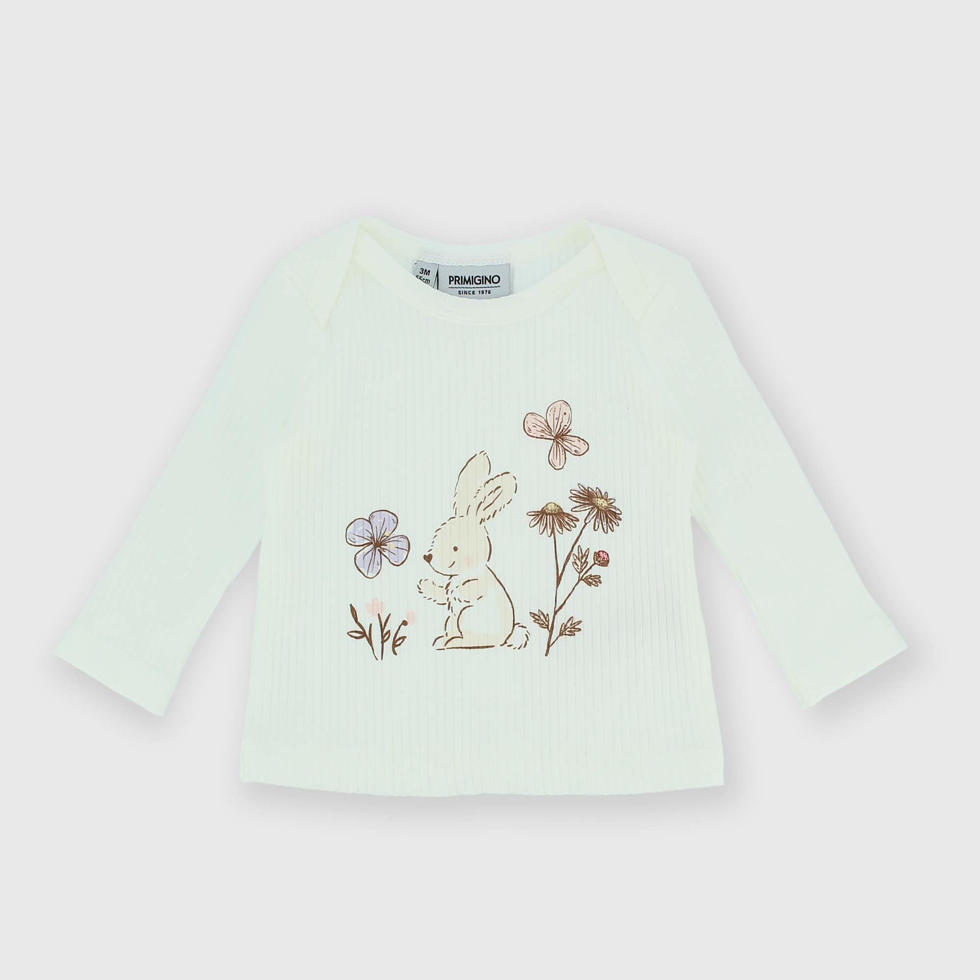 Camiseta canalé, cuello redondo, mangas largas. Conejo estampado en la parte delantera.