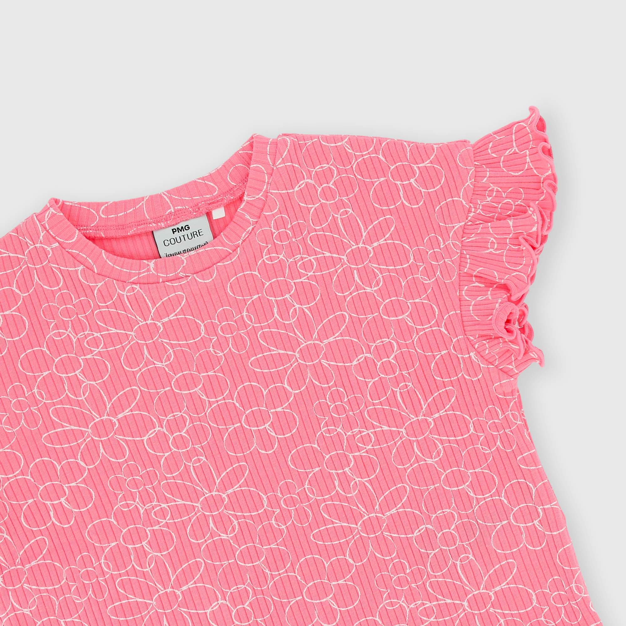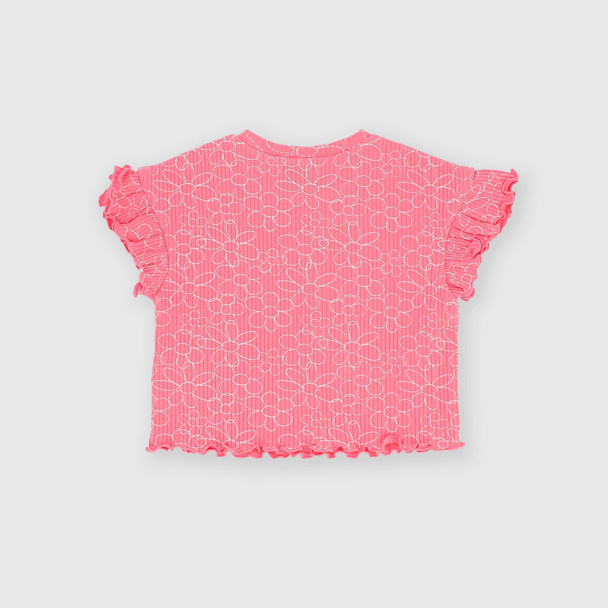 Camiseta canalé, cuello redondo, mangas cortas con volantes. Flores estampadas all over. Acabados de punto bambola.