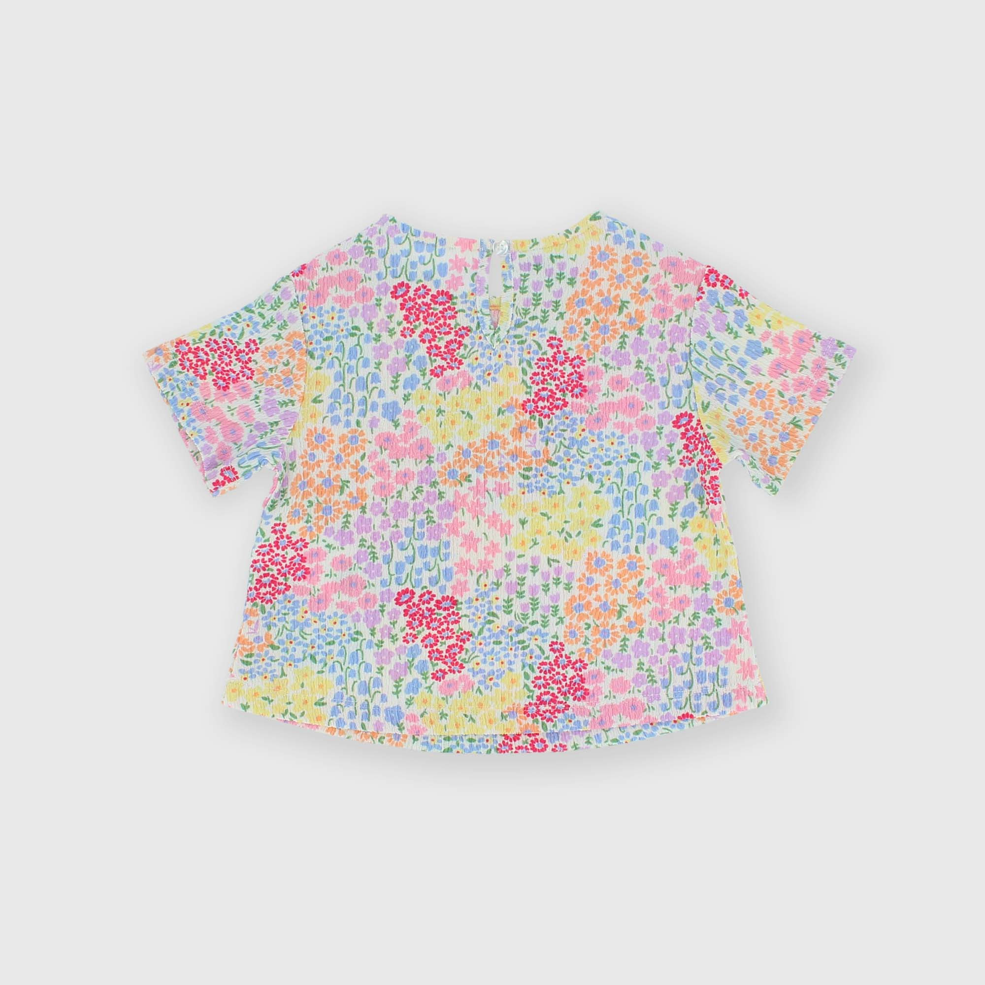 Camiseta de tejido seersucker, con cuello redondo, mangas cortas. Aplicación de tela en la parte delantera. Cierre tipo gota con botón en la parte posterior. Flores multicolor estampadas all over. Acabados en punto bambola.