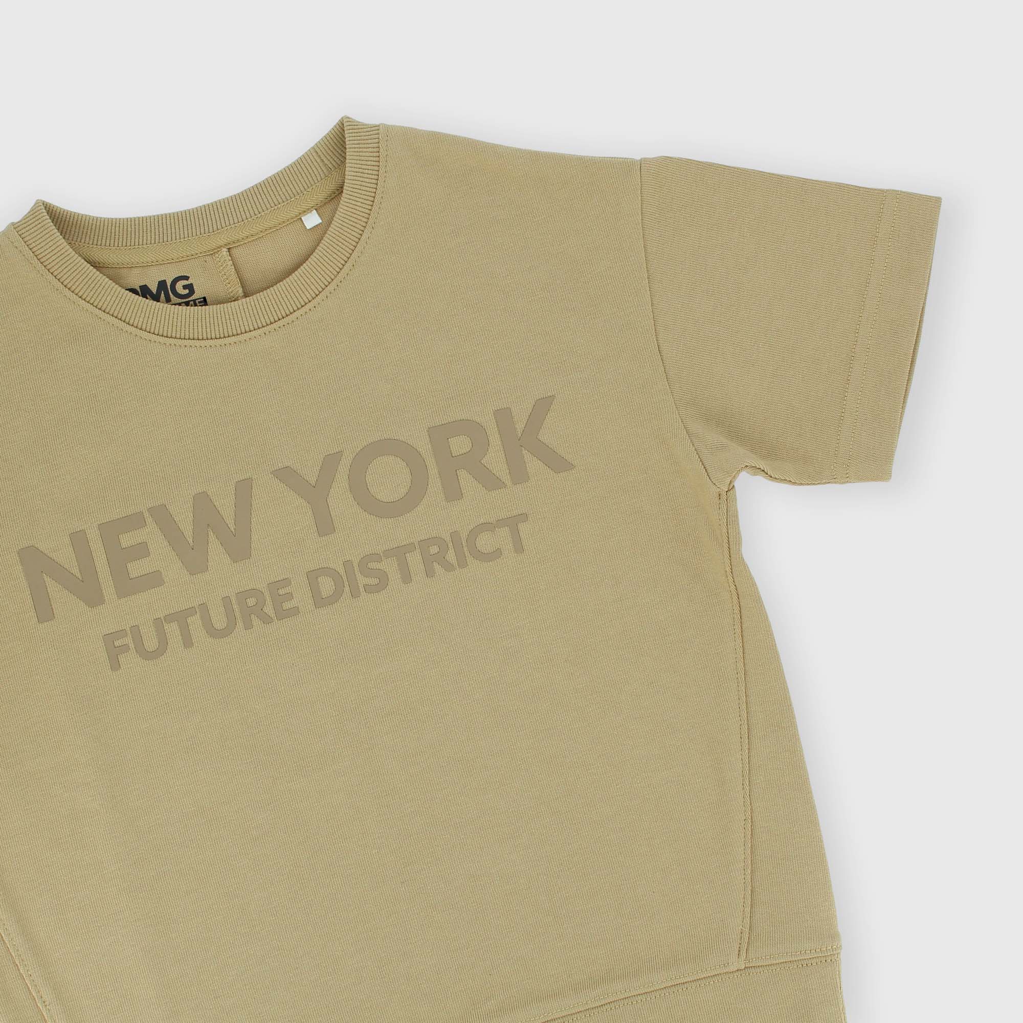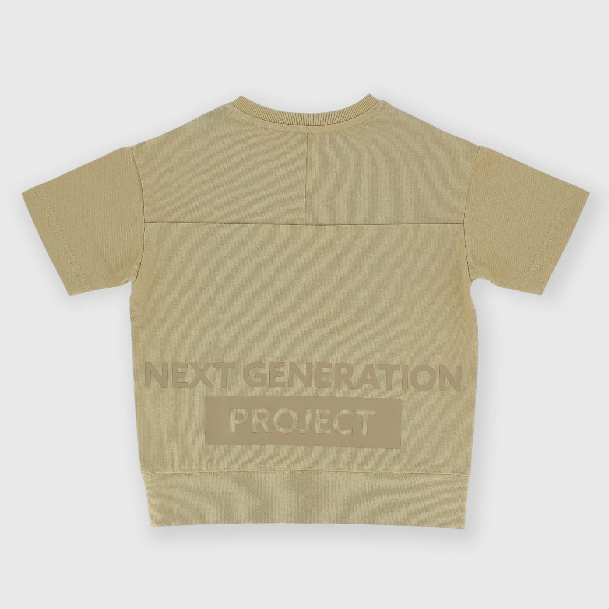 Camiseta de tejido Jersey grueso, con cuello redondo, mangas cortas. Escritas efecto goma al tono impresas en la parte anterior y posterior.