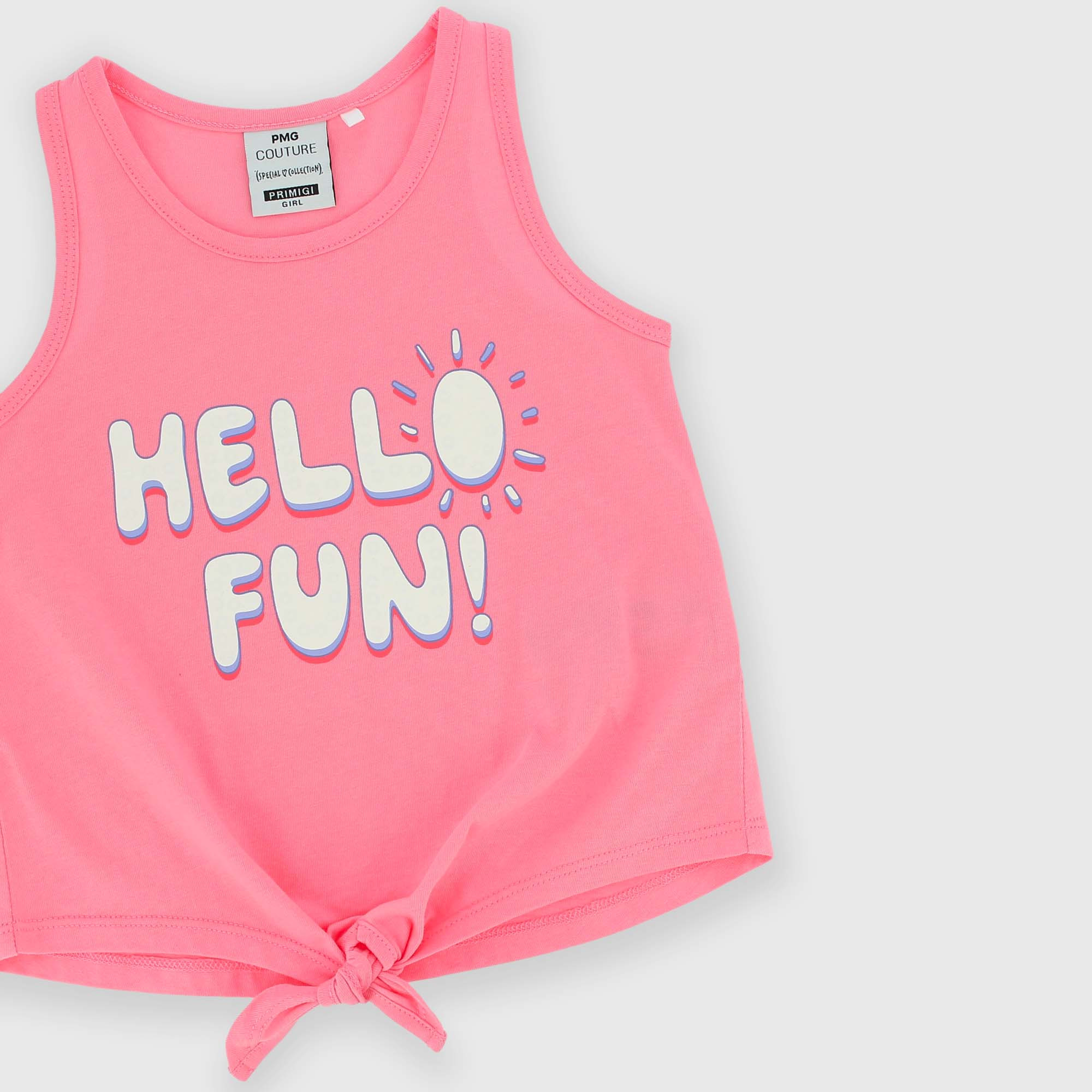 Camiseta de tirantes de tejido Jersey, cuello redondo.Parte delantera estampada con lentejuelas Nudo en la parte inferior.