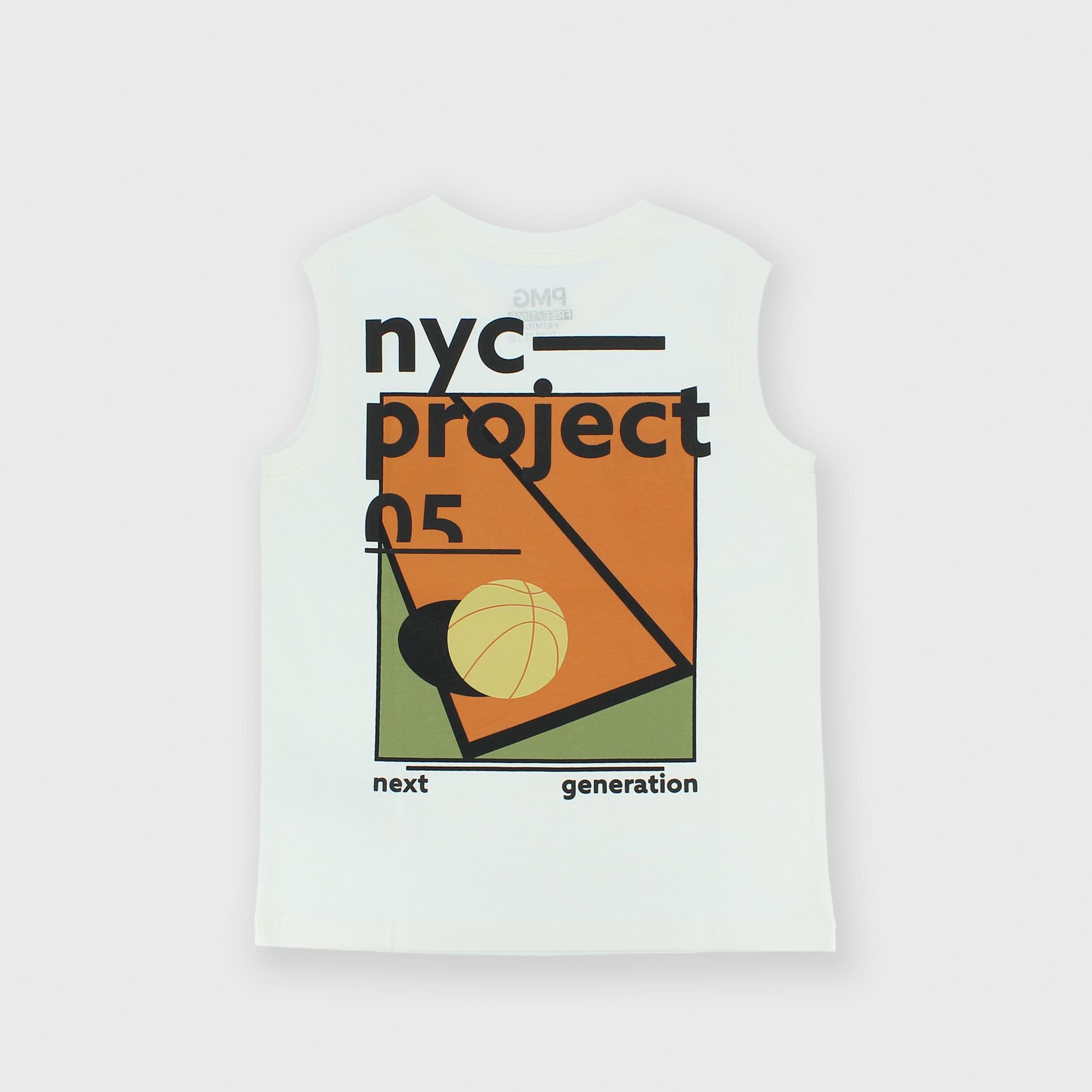 Camiseta de tirantes de tejido Jersey, cuello redondo. Cierre con botones automáticos en el hombro. Parte delantera y trasera estampadas con detalle efecto goma.