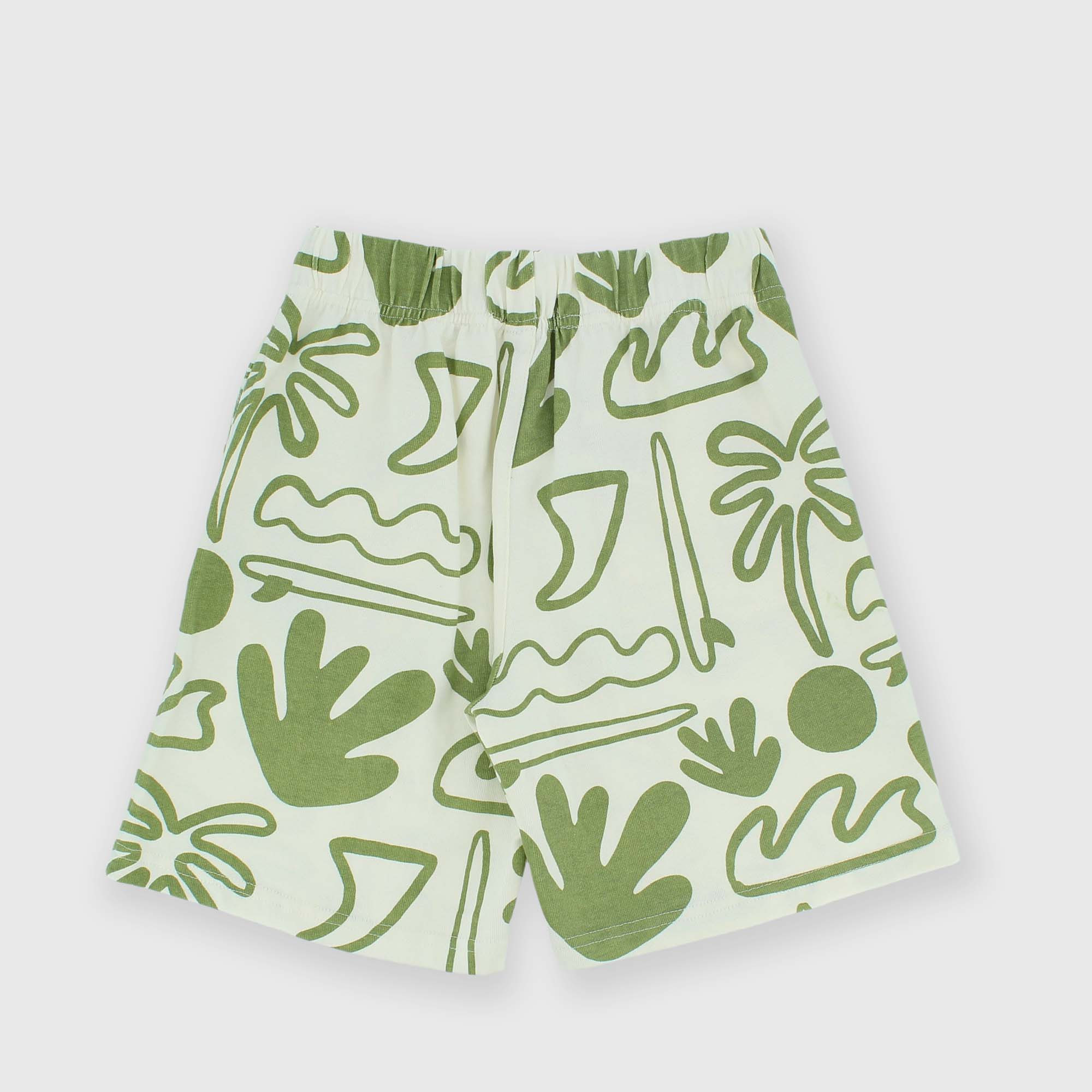 Bermuda de tejido Jersey grueso con cintura elástica y cordones delanteros. Bolsillos laterales ocultos. Estampada all over