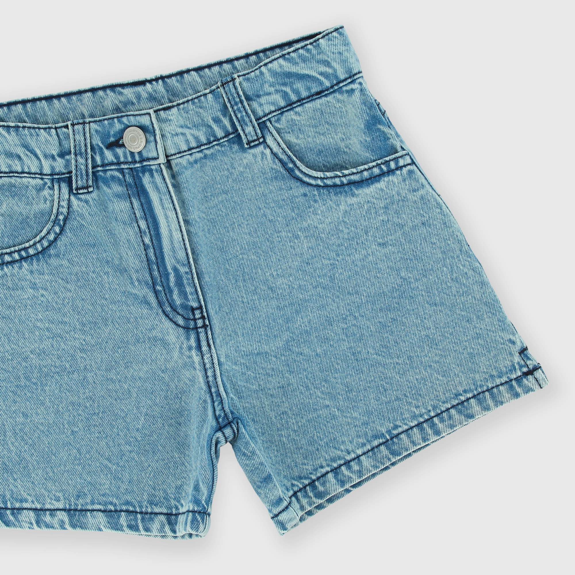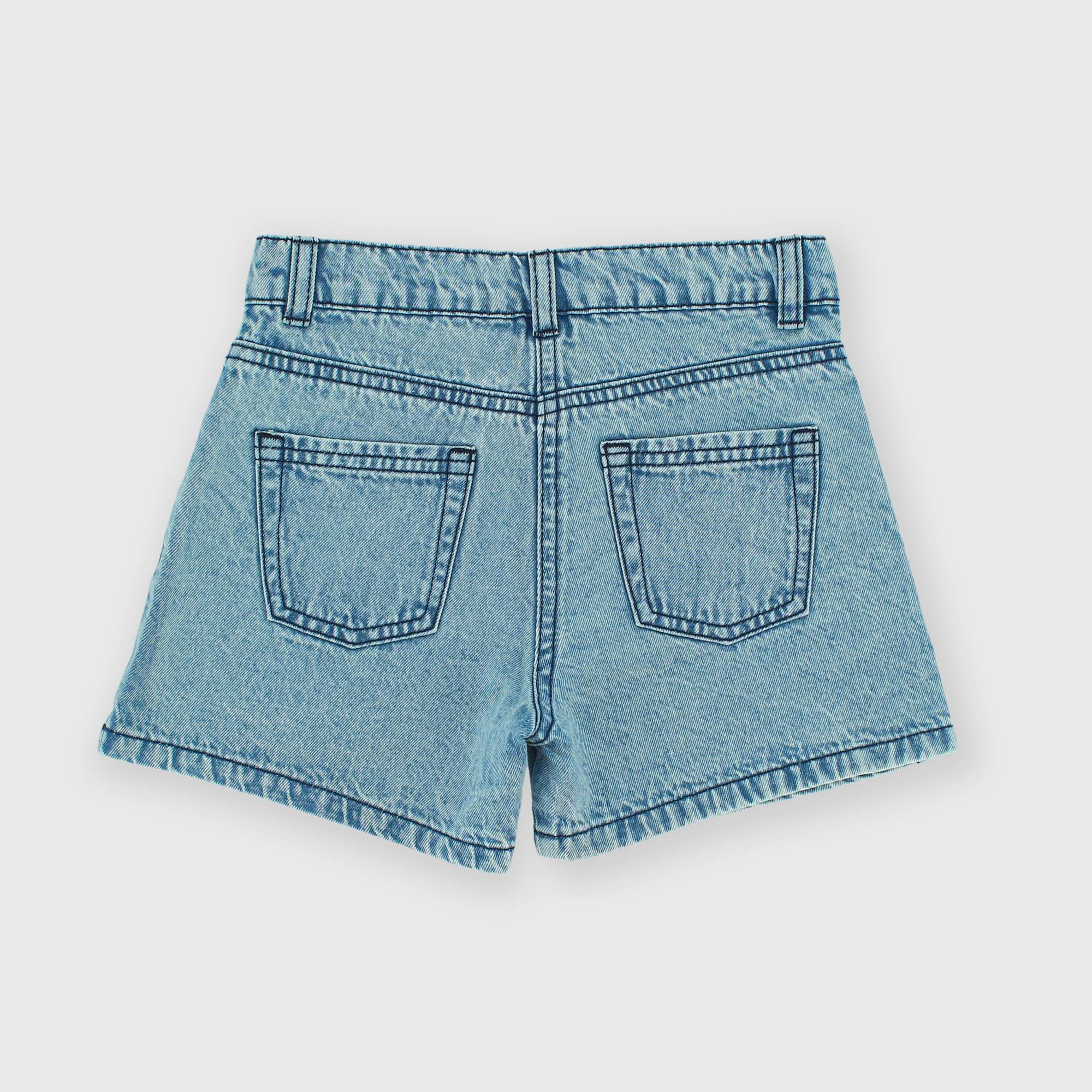 Pantalones cortos vaqueros con cintura ajustable en la parte interior. Cierre con botón y cremallera. Trabilla en la cintura. Bolsillos delanteros, y bolsillo de parche en la parte posterior. Pequeños cortes en la parte inferior.