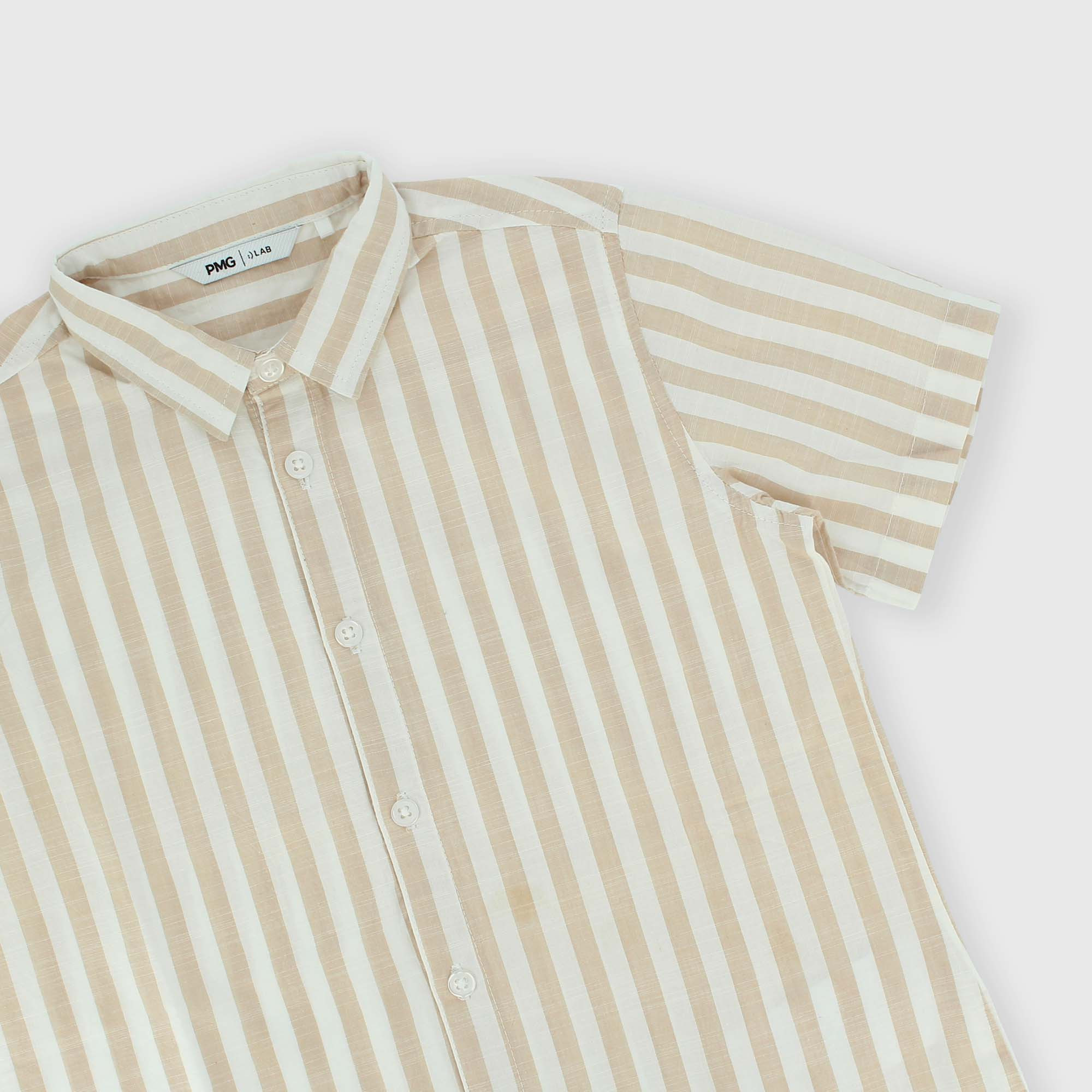 Camisa de algodón con rayas hilo tintado, mangas cortas. Cierre con botones en la parte delantera.