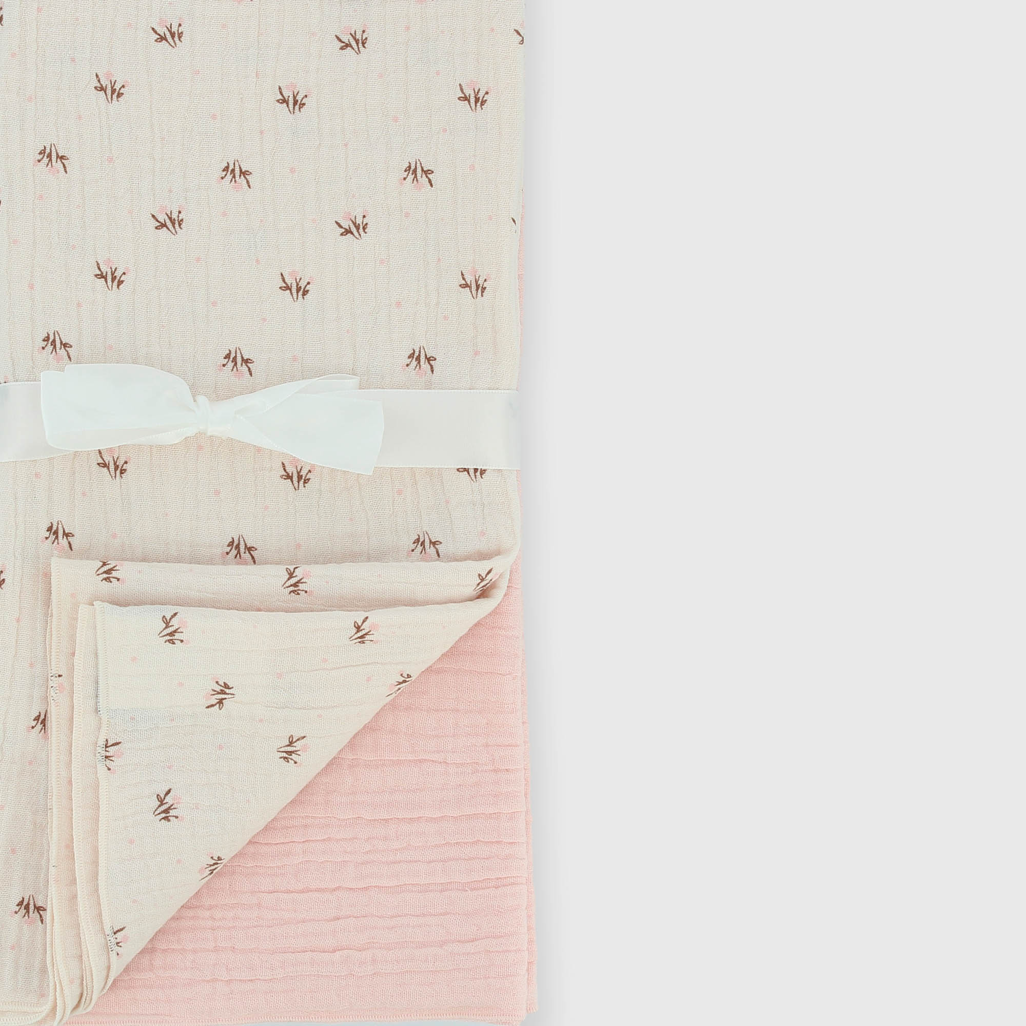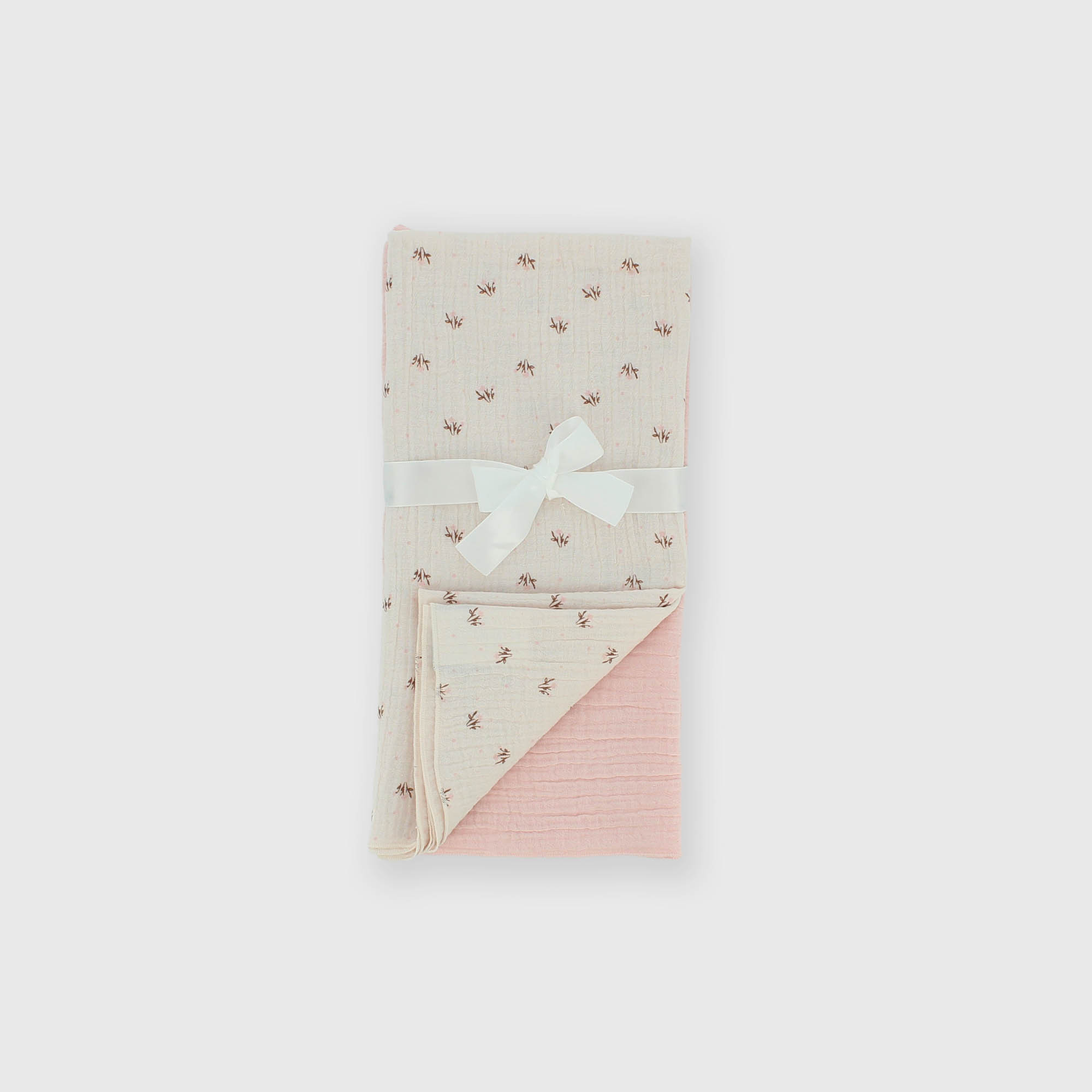Pack formado por dos mantas de gasa de algodón: una de un solo color, otra con flores estampadas all over.