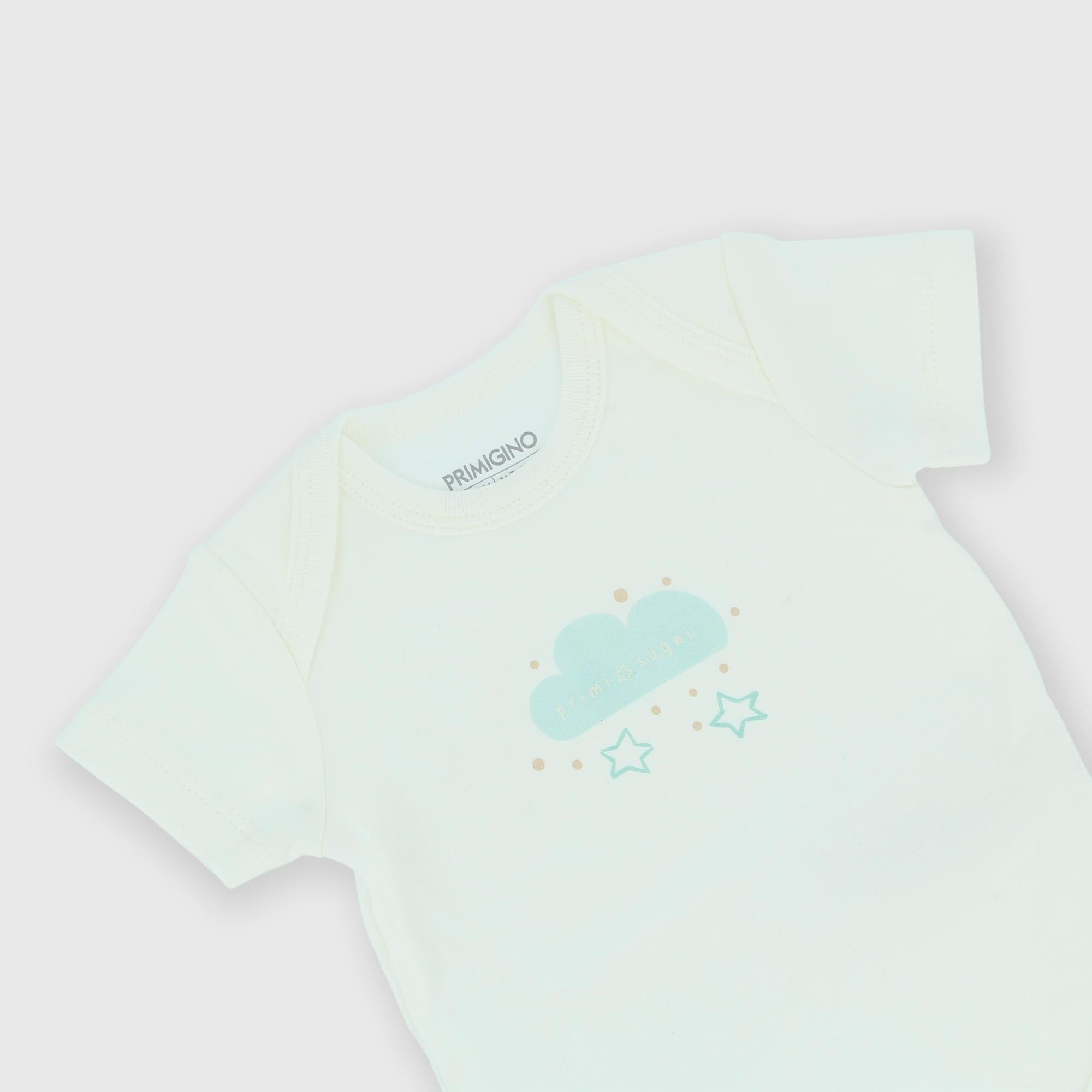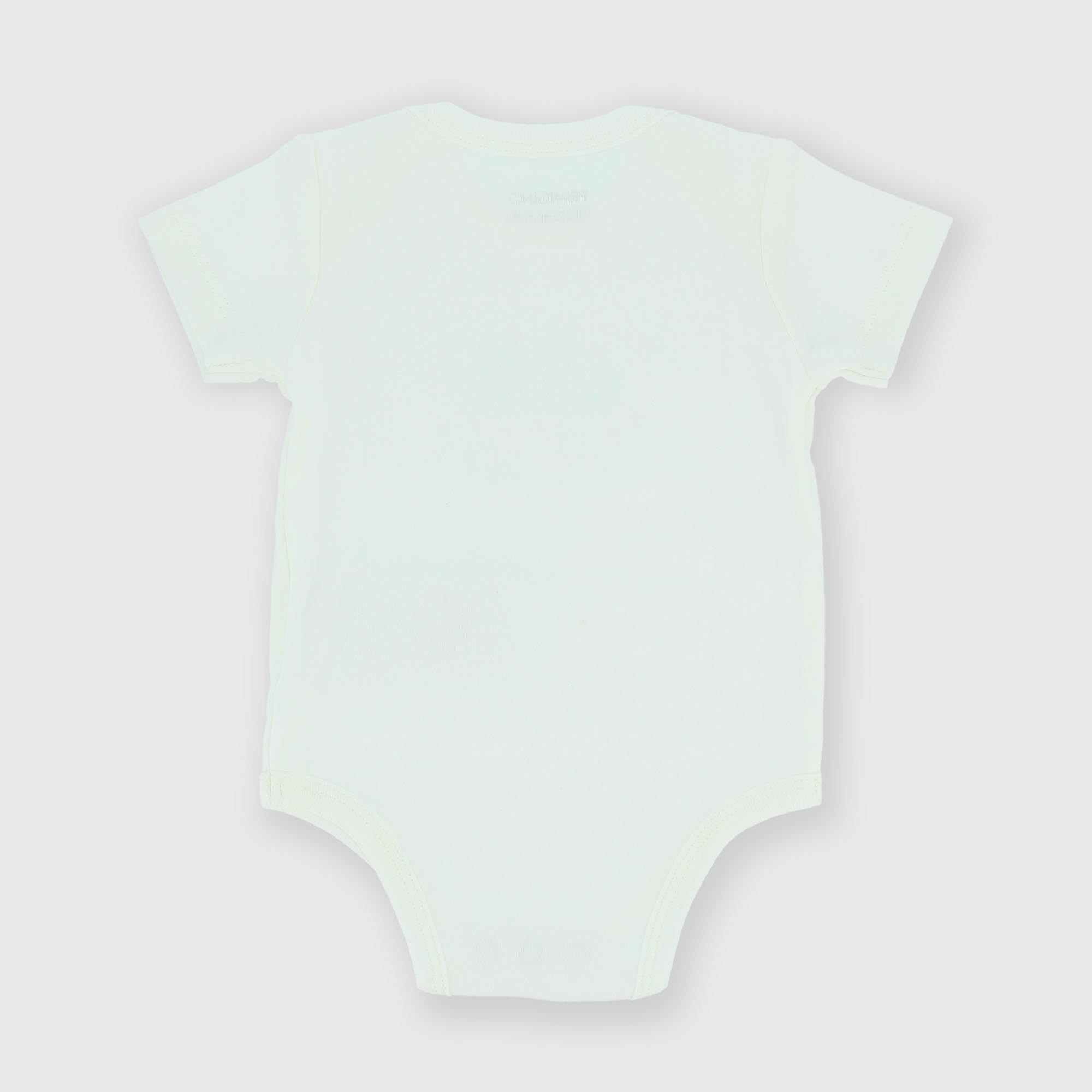 Body de tejido Interlock, cuelo redondo, mangas cortas. Cierre con botones automáticos en la parte inferior. Parte delantera estampada.