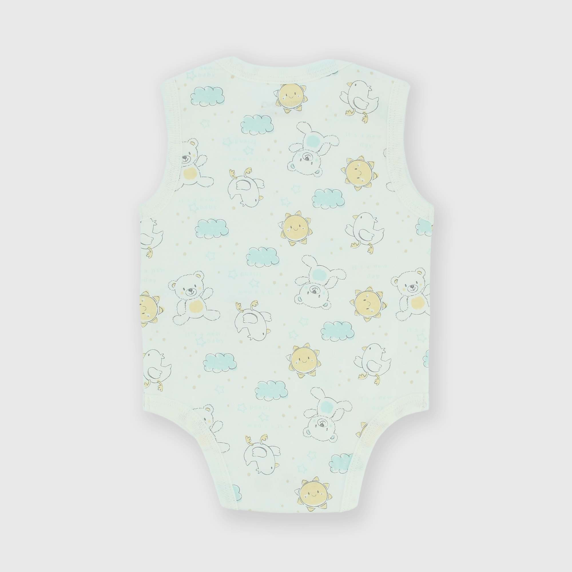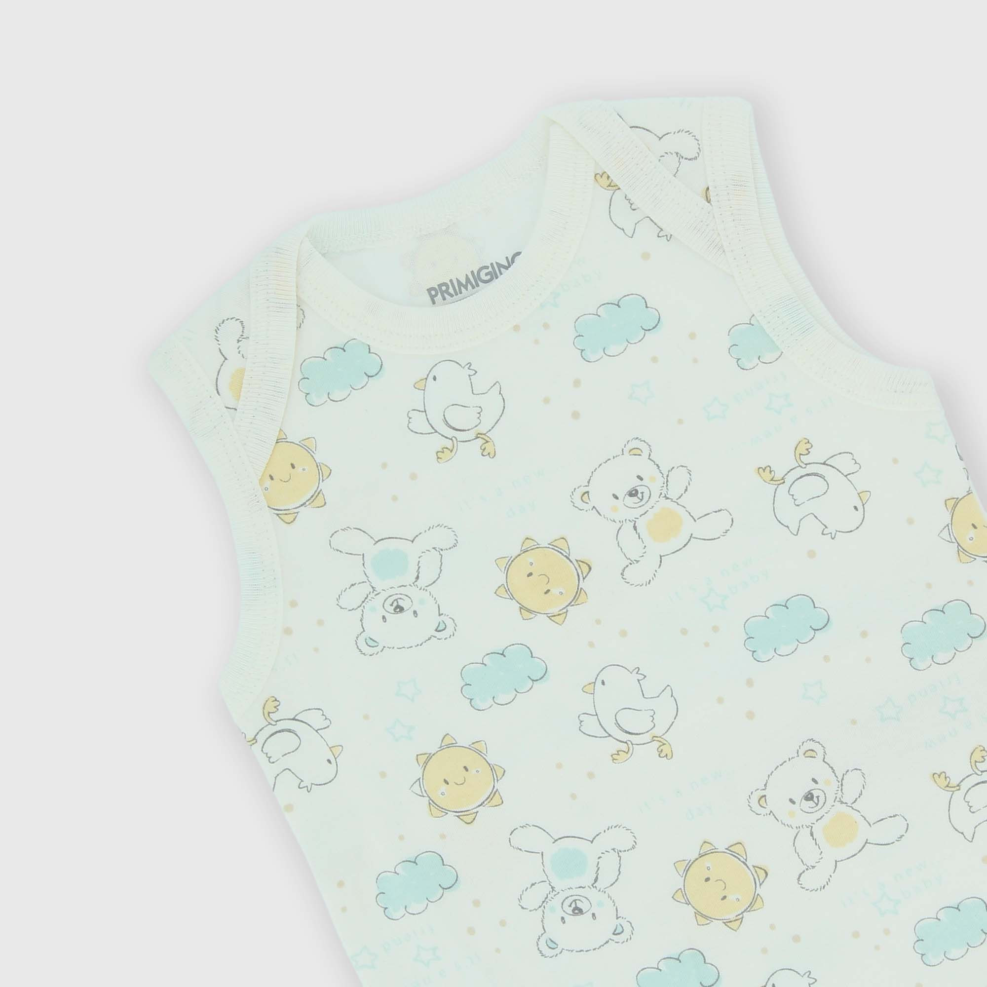 Body de tejido Interlock cuello redondo, sin mangas, estampado all over. Cierre con botones automáticos en la parte inferior.