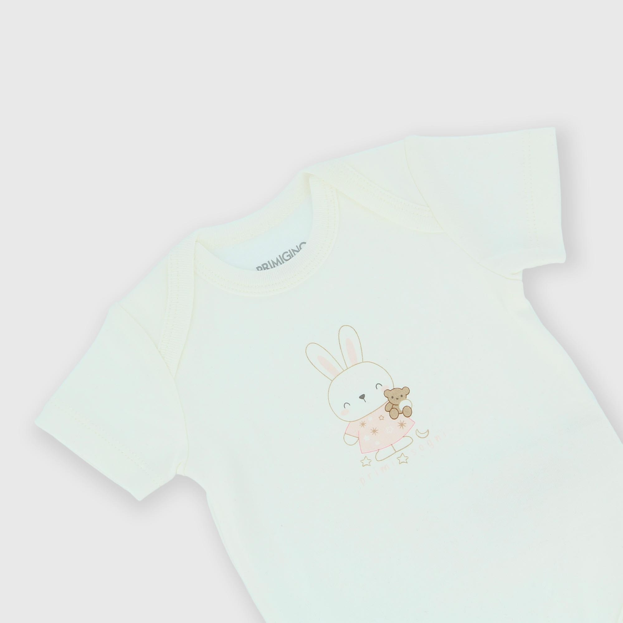 Body de tejido Interlock, cuelo redondo, mangas cortas. Cierre con botones automáticos en la parte inferior. Parte delantera estampada.
