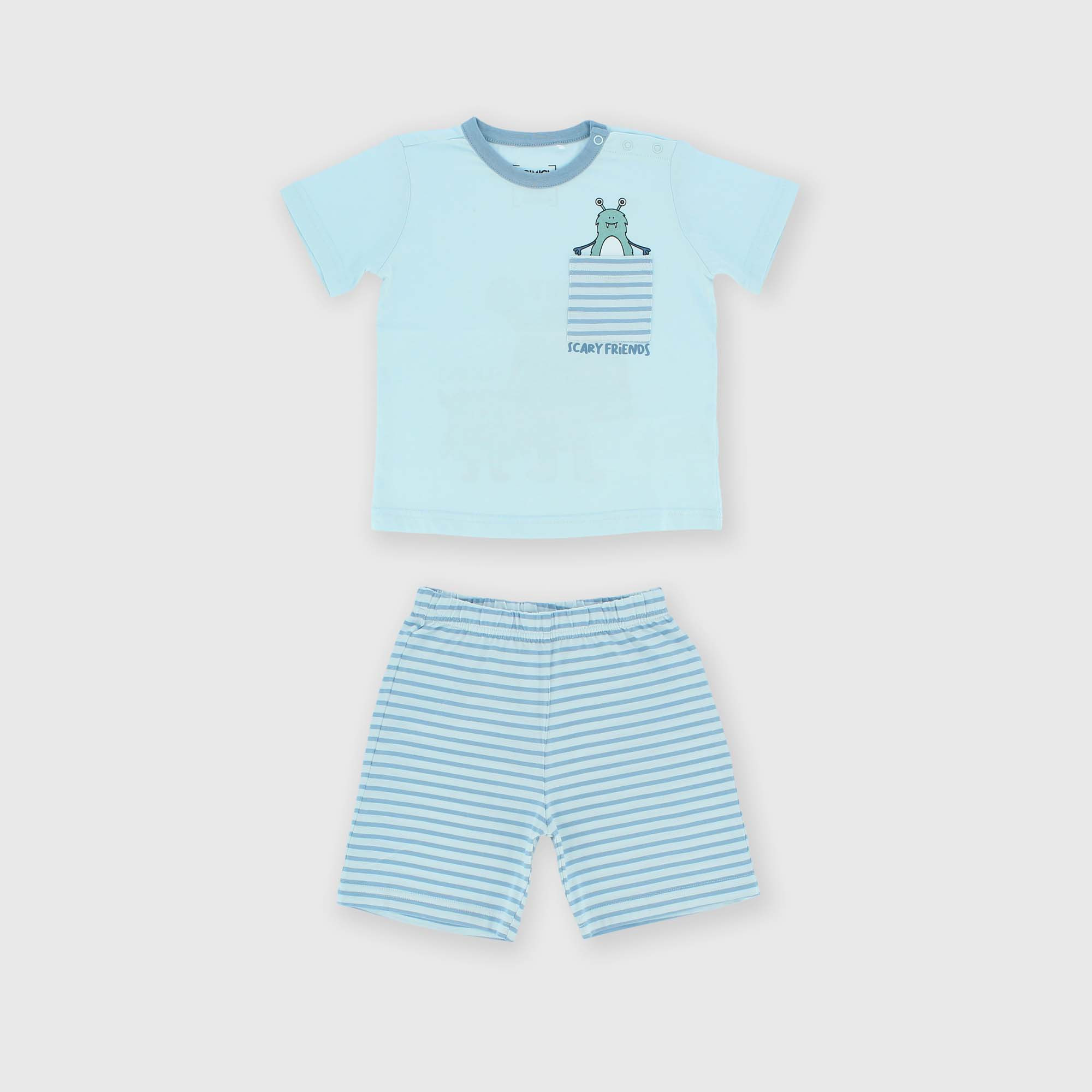 Conjunto pijama de tejido tipo Jersey. Camiseta cuello redondo mangas cortas, cierre con botones automáticos en el hombro. Bolsillo en el pecho. Parte delantera y trasera estampadas. Bermuda de rayas con cintura elástica.