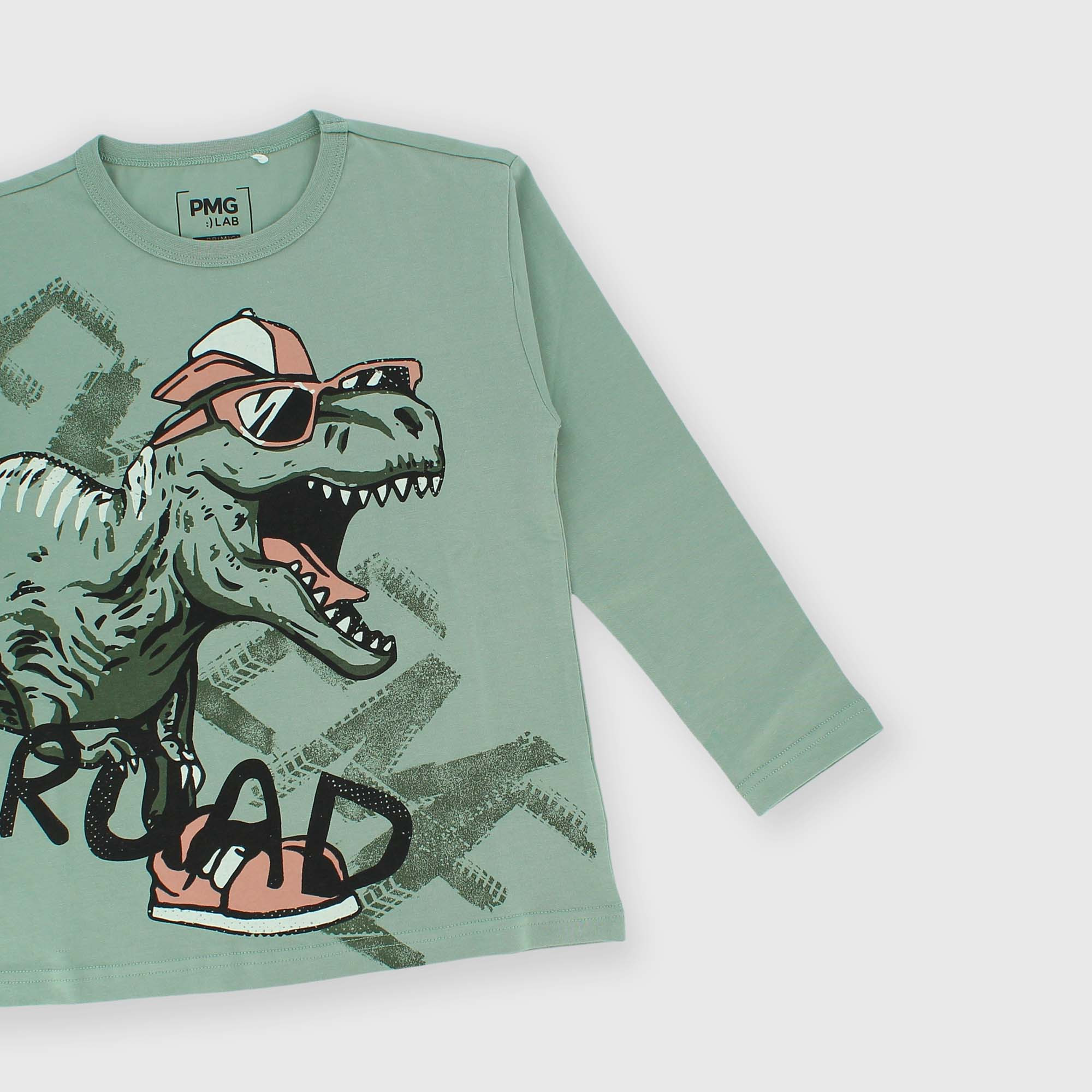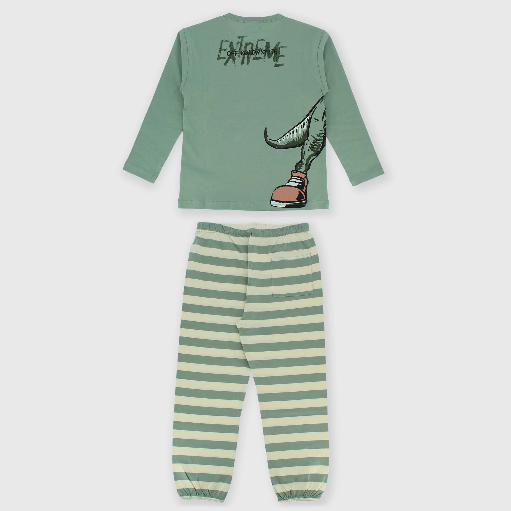 Conjunto pijama de tejido tipo Jersey. Camiseta cuello redondo, mangas largas. Parte delantera y trasera estampadas. Pantalón con cintura elástica y rayas hilo tintado. Bolsillo parcheen la parte trasera y parte inferior canalé.