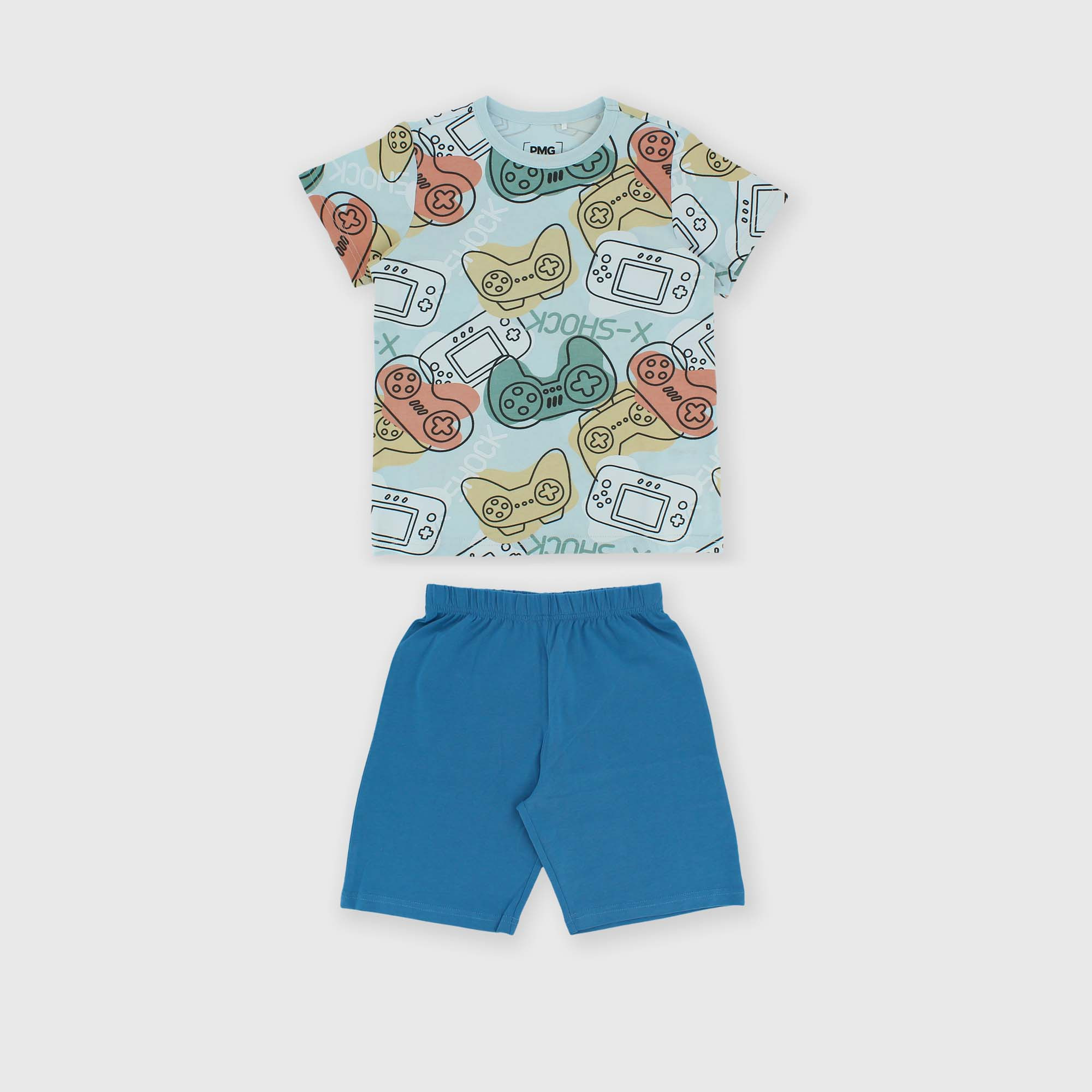 Conjunto pijama de tejido tipo Jersey. Camiseta cuello redondo mangas cortas con videojuego estampado. Bermuda con cintura elástica.