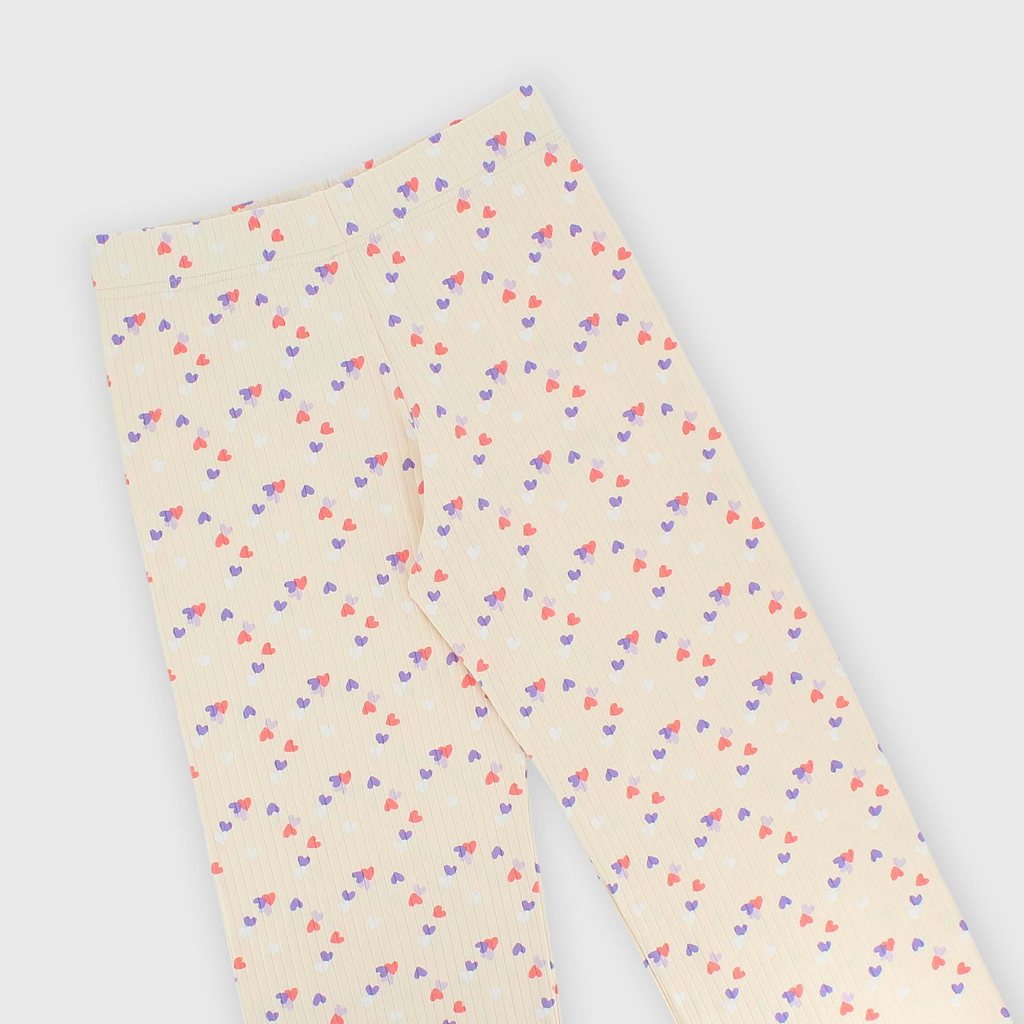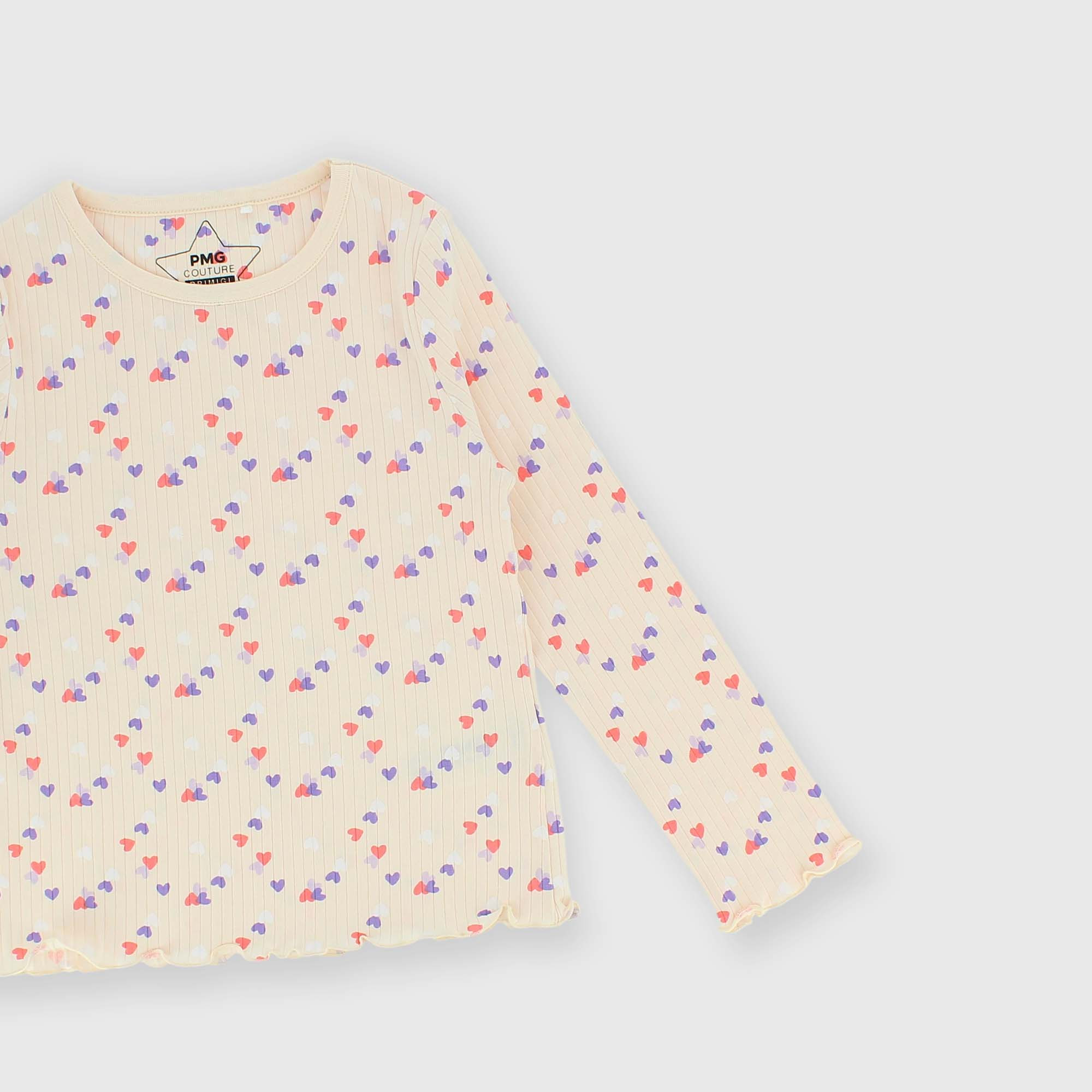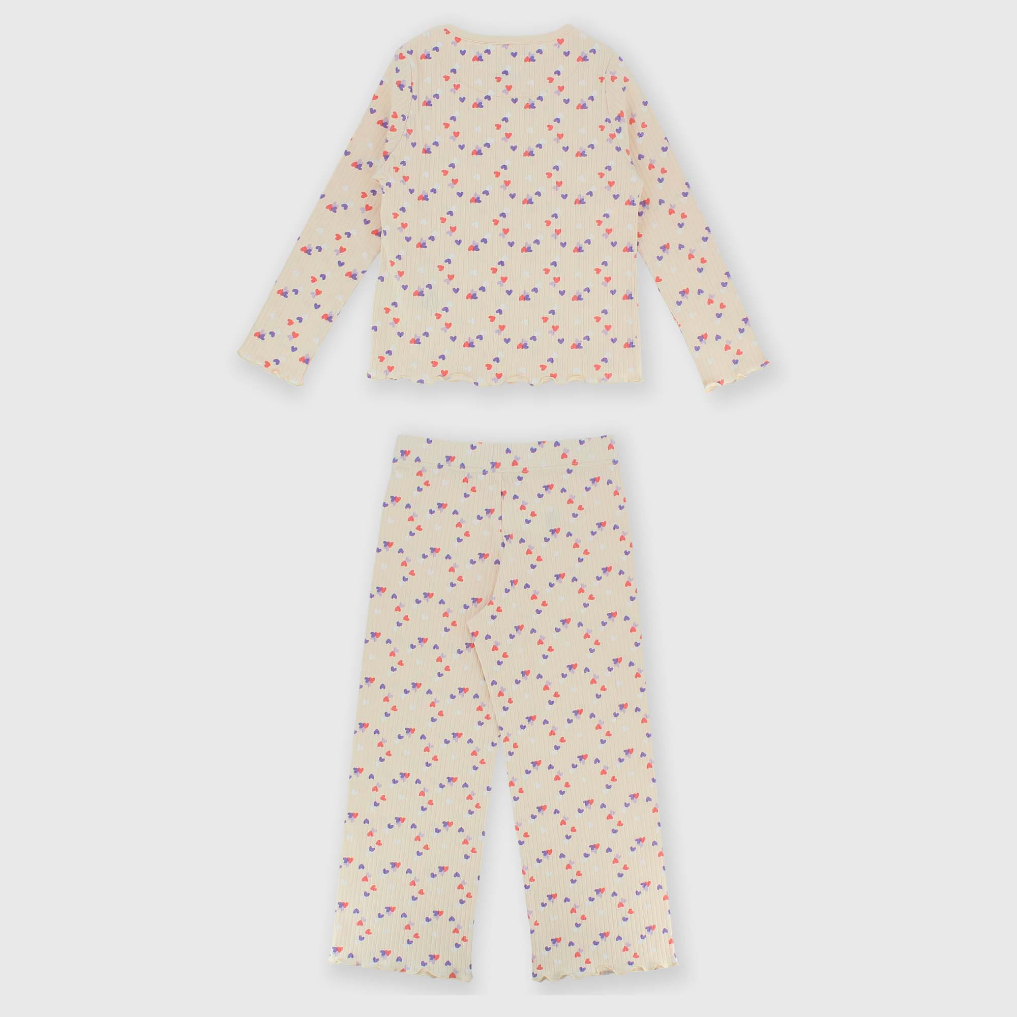 Conjunto pijama canalé con corazones estampados all over. Camiseta cuello redondo, mangas largas. Pantalón con cintura elástica. Acabados punto bambola.