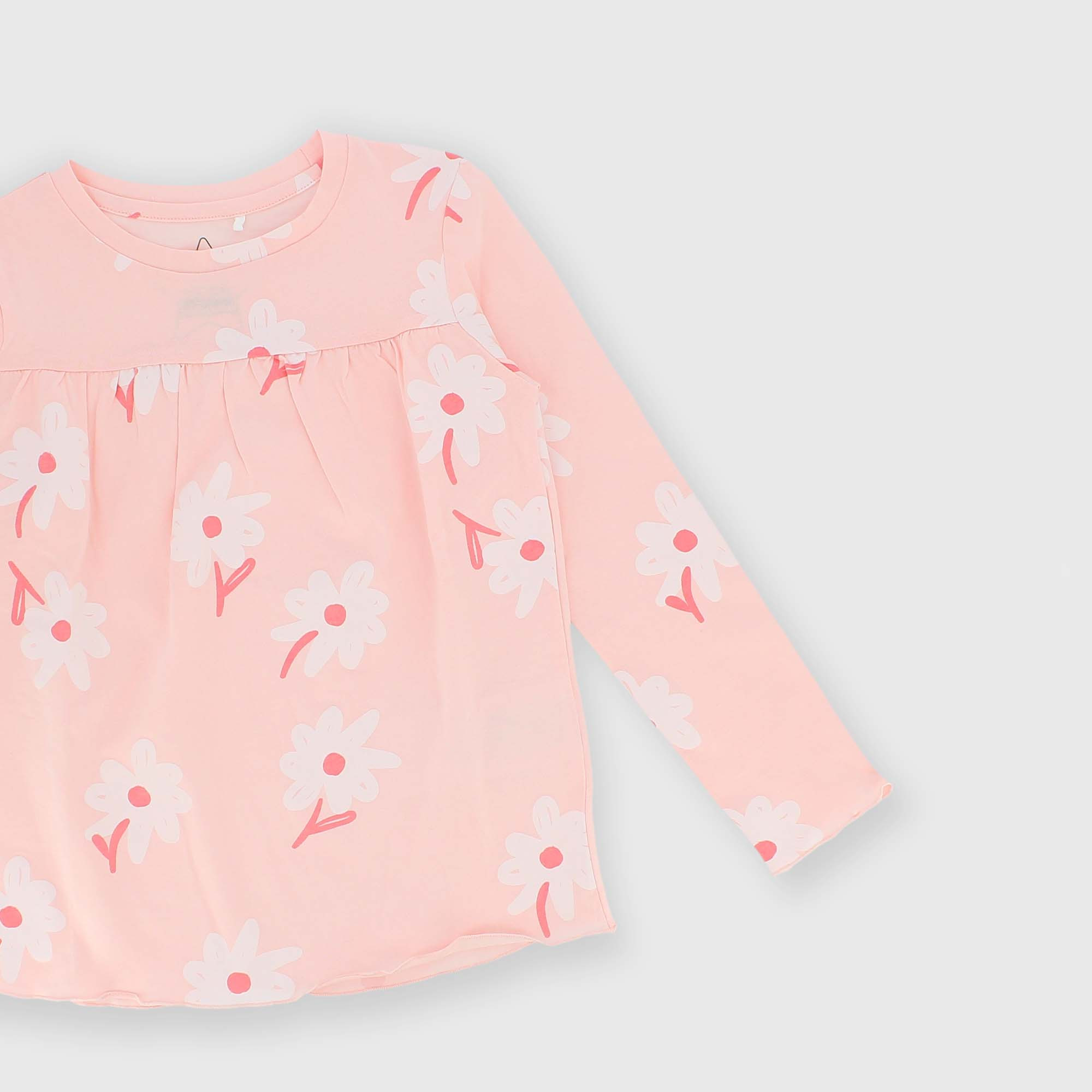 Conjunto pijama de tejido tipo Jersey con flores estampadas all over. Camiseta cuello redondo mangas largas. Pantalón con cintura elástica. Acabados punto bambola.