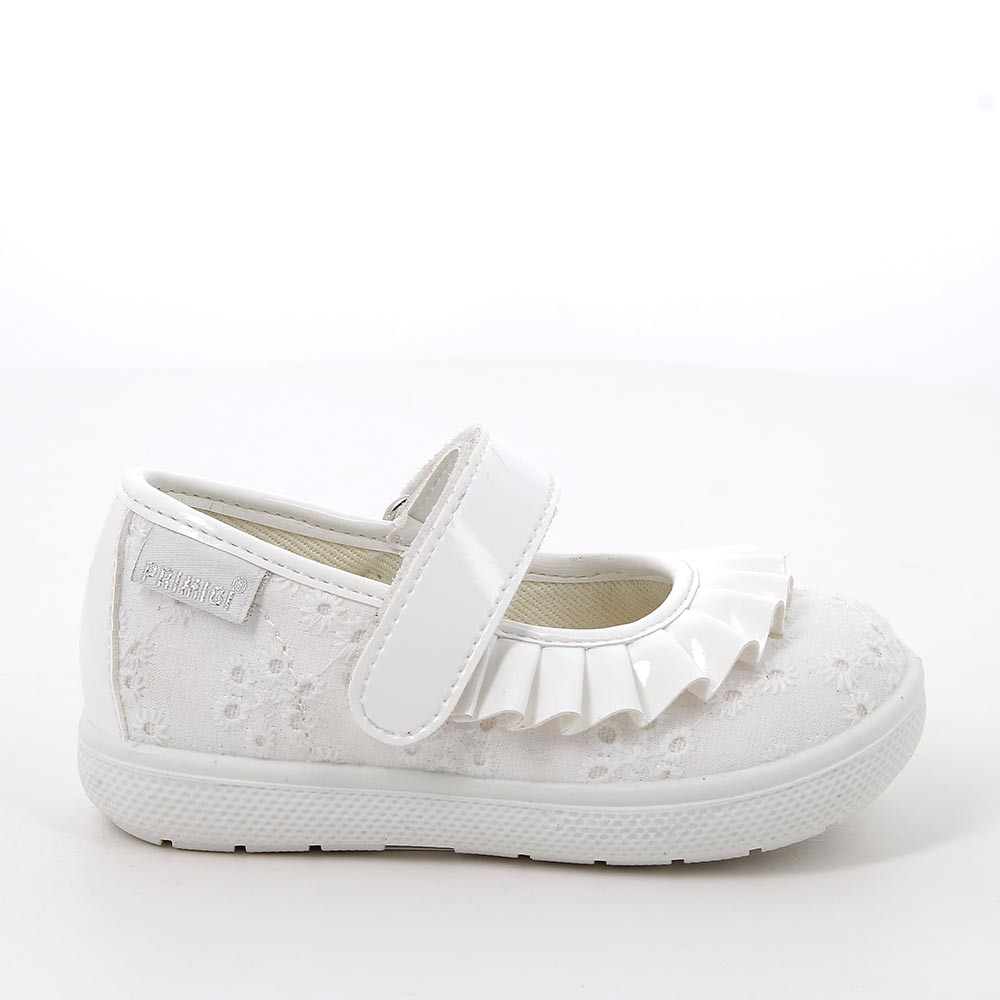 Estas bonitas bailarinas para los primeros pasos se caracterizan por un diseño delicado y romántico. En el borde delantero, un pequeño detalle con volantes añade un toque femenino y encantador, lo que hace que estos zapatos sean ideales para ocasiones especiales. El cierre es práctico y seguro, gracias a una correa ajustable con velcro. La plantilla extraíble de cuero ofrece comodidad y transpirabilidad, manteniendo los pies frescos y cómodos. La suela es flexible y antideslizante, diseñada para apoyar los primeros pasos.