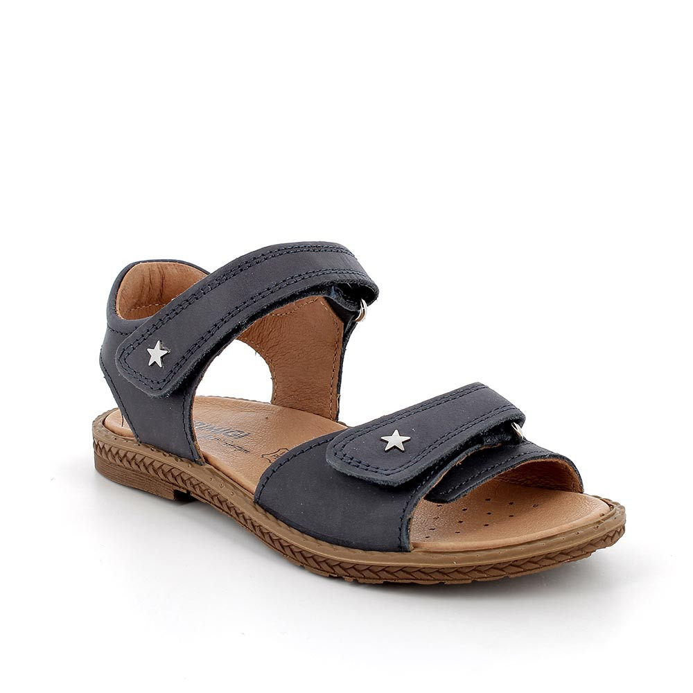 Este sandalia para niña tiene un diseño sencillo y funcional, ideal para el uso diario y para garantizar comodidad durante las actividades veraniegas. Se caracteriza por dos correas principales con cierre de velcro decoradas con tachuelas metálicas en forma de estrella, que añaden un toque distintivo. El borde trenzado de la suela con pequeño tacón evoca un estilo artesanal. El pie descansa sobre una suave plantilla de cuero.