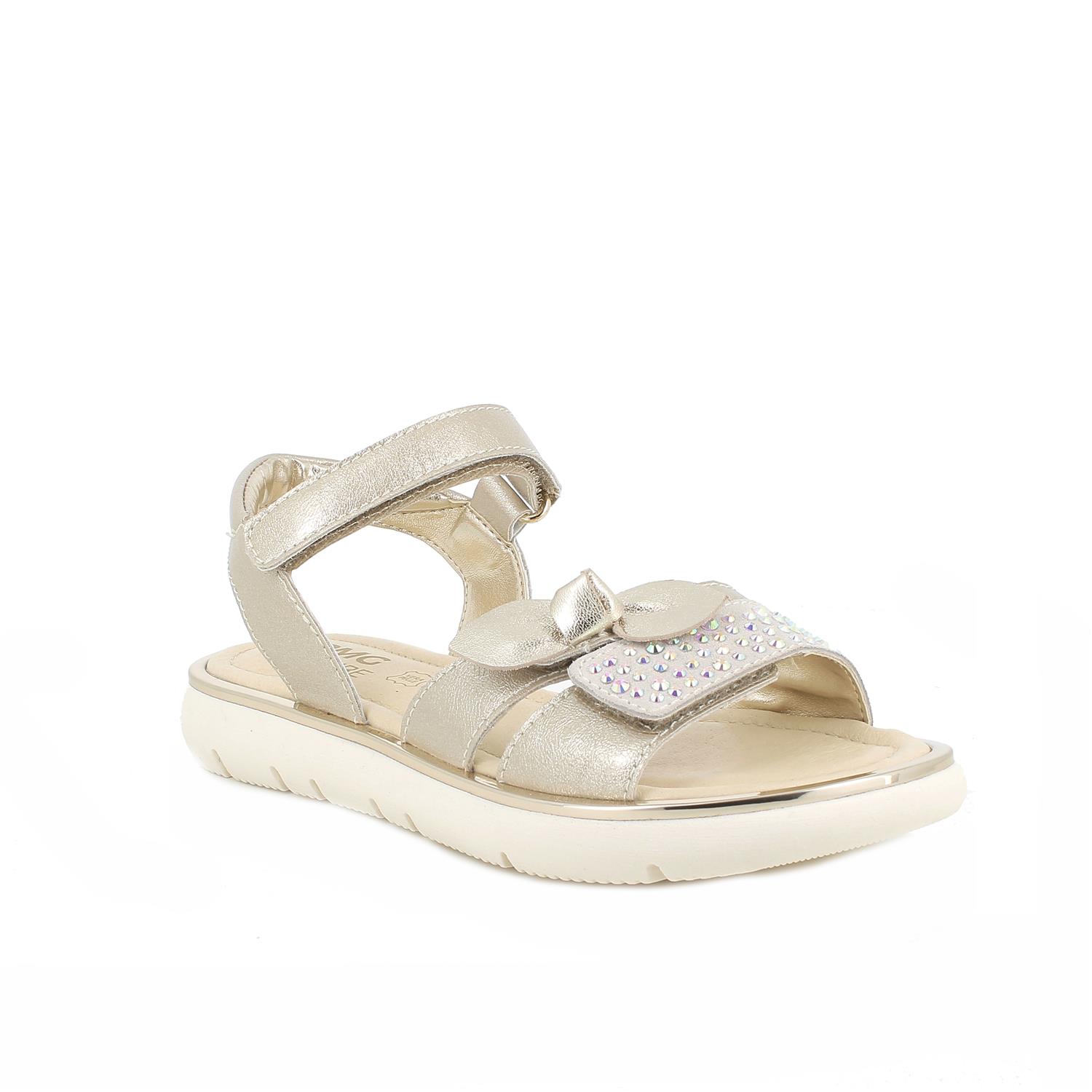 Sandalias de niña para ocasiones especiales, pero también para completar los looks más elegantes de todos los días. Tienen una elegante aplicación y unos brillantes en la parte delantera. Son totalmente ajustables y se apoyan sobre una suela alta pero al mismo tiempo ligera. La plantilla de piel es higiénica y ofrece un apoyo suave.